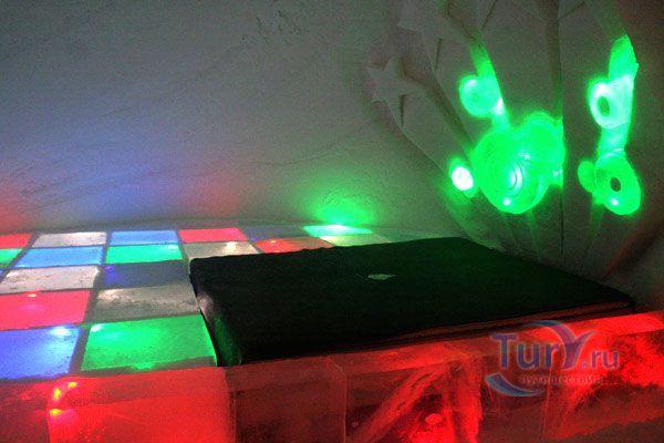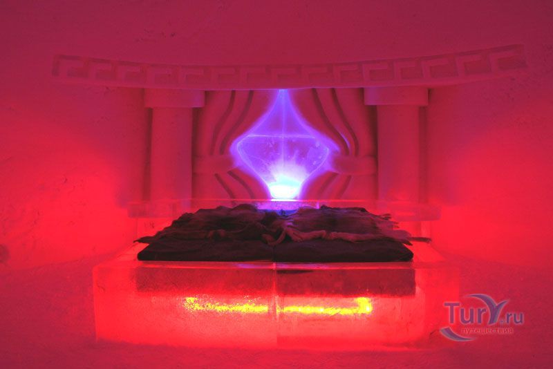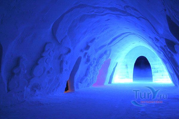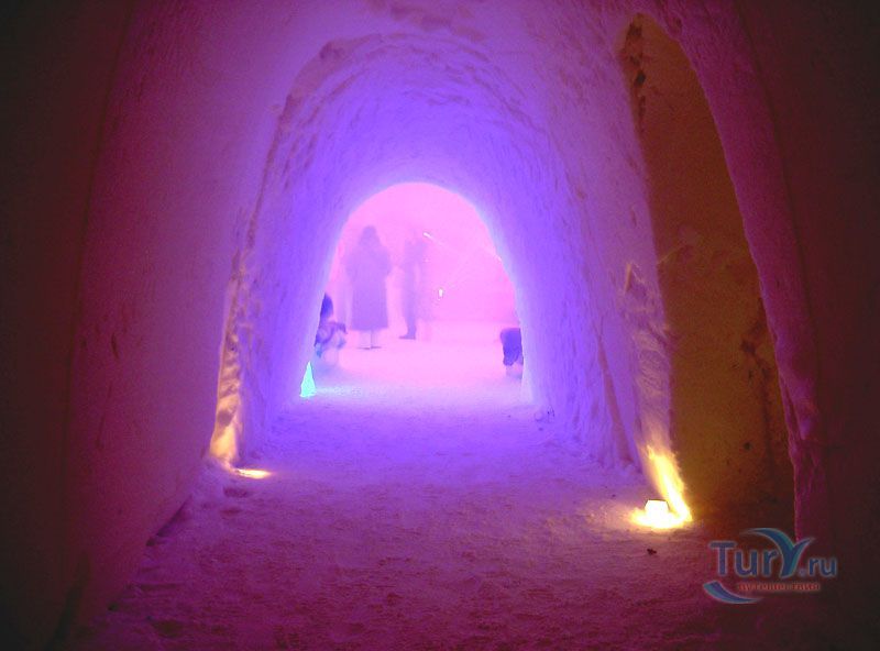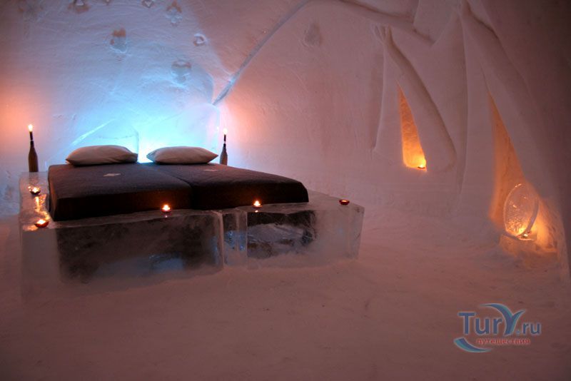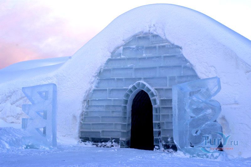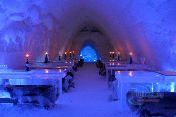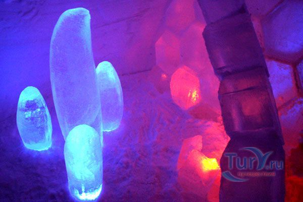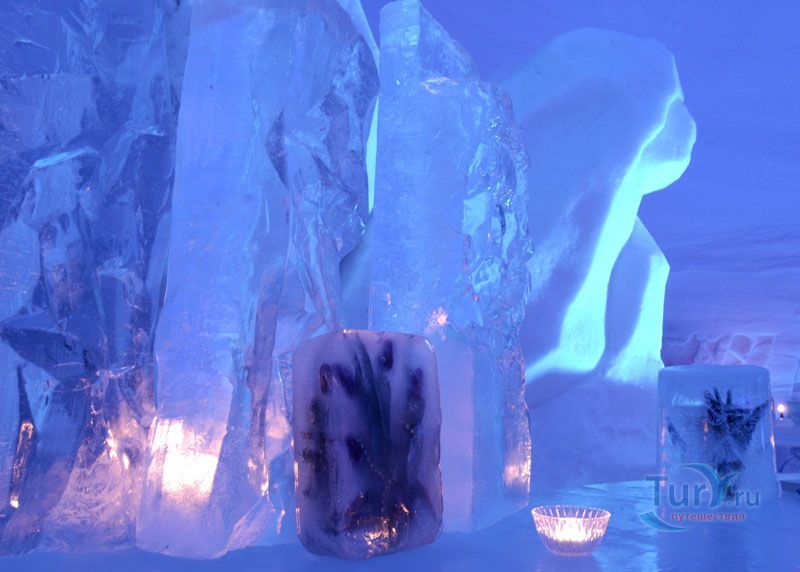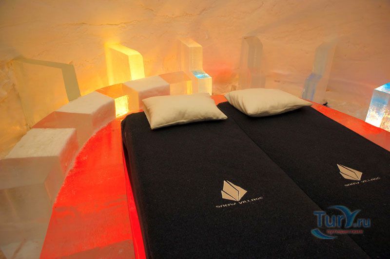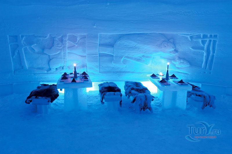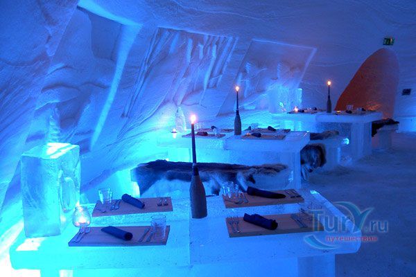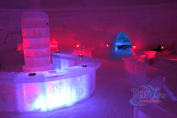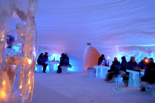 Здесь же Вы увидите уникальный отель из снега и льда на 30 номеров - сьюты, ледяной бар, галерея ледяных скульптур. Температура в отеле минус 4-7 градусов Цельсия. В ледяных спальнях кровати изо льда покрыты шкурами оленей. В снежном ресторане всё – стулья, кресла, мебель, светильники, камин и даже некоторая посуда сделаны изо льда. Здесь вам предложат теплый национальный напиток Глёги, обед или ужин.