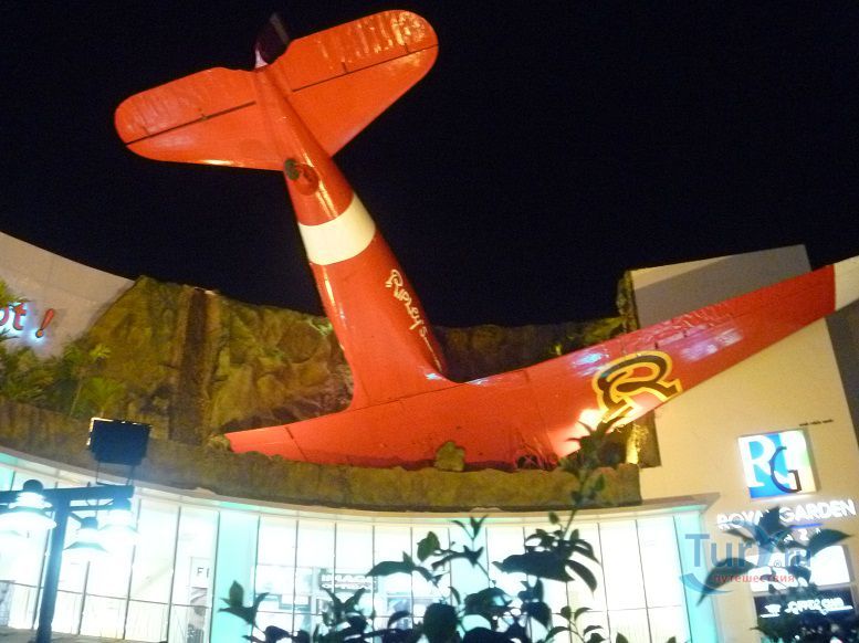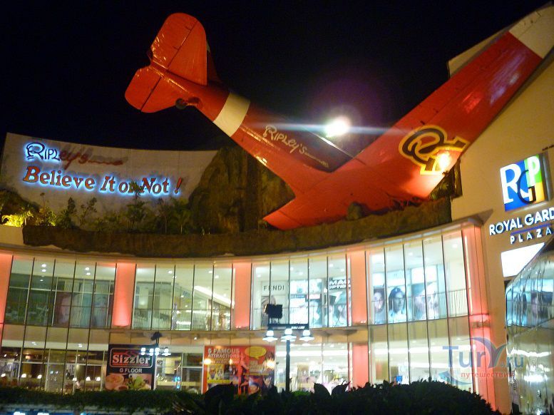 Торгово-равзлекательный комплекс Royal Garden plaza в центре Паттайи - самый популярный среди туристов. Это здание располагается на второй улице от пляжа - second road. Его невозможно ни с чем перепутать или проехать – в него «врезался» небольшой самолет: над входом в центр висит красный фюзеляж самолета с крыльями и хвостом, имитирующий его крушение, а кабина скрыта внутри здания. И это не муляж, внутри здания находится кабина пилота. Создаётся иллюзия врезавшегося в верхние этажи здания самолёта, рядом расположена надпись "Believe it or not" ("Верьте или нет"). Состоит из четырех этажей. На первых двух этажах расположилась большое количество магазинов модной одежды таких известных марок как ESPRIT, GUESS, JASPAN, LACOSTE, SHAPS,имеется большой выбор серебренных изделий. Цены на фирменные товары сопоставимы с московскими, качество тоже. Очень много отделов с дешевыми товарами, например часами, но кто поручится за их качество? На втором этаже расположены магазины косметики и парфюмерии, аптечный киоск и косметические салоны. На третьем этаже секция аттракционов Ripley’s World of Entertainment, музей Роберта Рипли «Believe it or not» забавных диковинок для любителей розыгрышей «Верю - не верю» - 480 бат, музей восковых фигур Мадам Тюсо 580 бат, Дом с приведениями (комната страха) 480 бат, 4D кинотеатр (стерео-театр с движущимися креслами) с виртуальными гонками 300 бат, «Бесконечный зеркальный лабиринт» (Infinity Maze) 480 бат, Scream in The Dark (комната ужасов) 300 бат, множество детских игровых автоматов. Общий билет на все аттракционы стоит 1100 бат (2011г). Здесь же - кабина пилота «врезавшегося в здание» самолёта, самолет — это часть музея Рипли. На четвертом этаже Food Wave - столовая имеющая более чем 400 посадочных мест. Кухня интернациональная: тайская, итальянская, индийская, китайская, вьетнамская. С 4-го этажа красивый вид на море. Здесь же находятся KFC, McDonald’s, Starbucks, Sizzler’s. Чтобы попробовать шведский стол нужно пройти в салат-бар, сказав официанту: «Only buffet». В нём - супы, овощи, разные добавки и приправы, чипсы из бекона, фрукты, десерт. Кладёшь разные нарезанные компоненты в тарелку, поливаешь соусом, посыпать приправами – и индивидуальный салат готов. Цена 149 бат с человека (2011г). Продающиеся сувениры в центре дороже, чем в других магазинах.