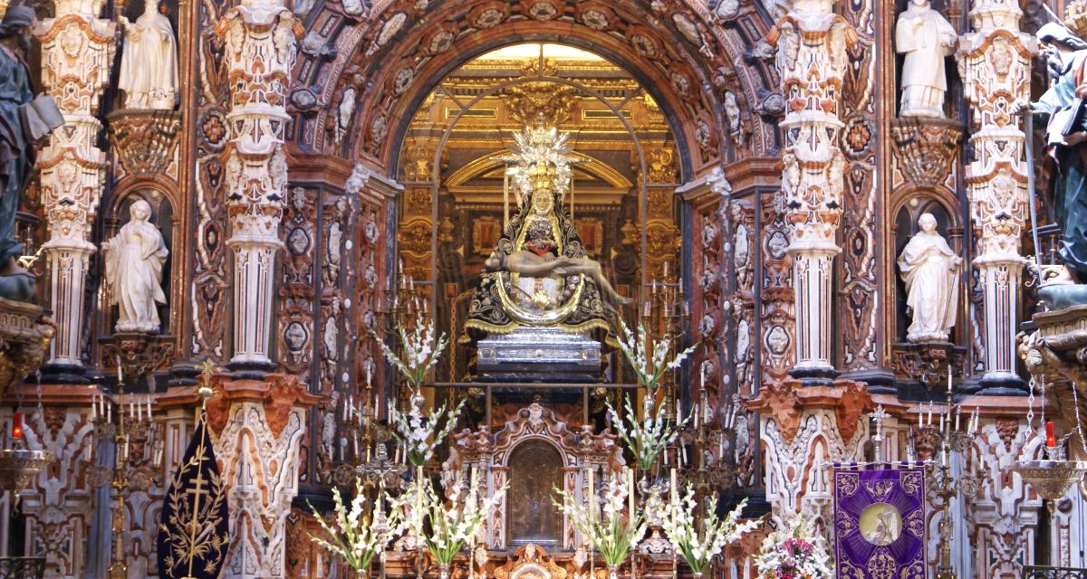 В центре алтаря находится изображение Скорбящей Богоматери.