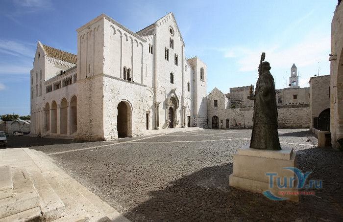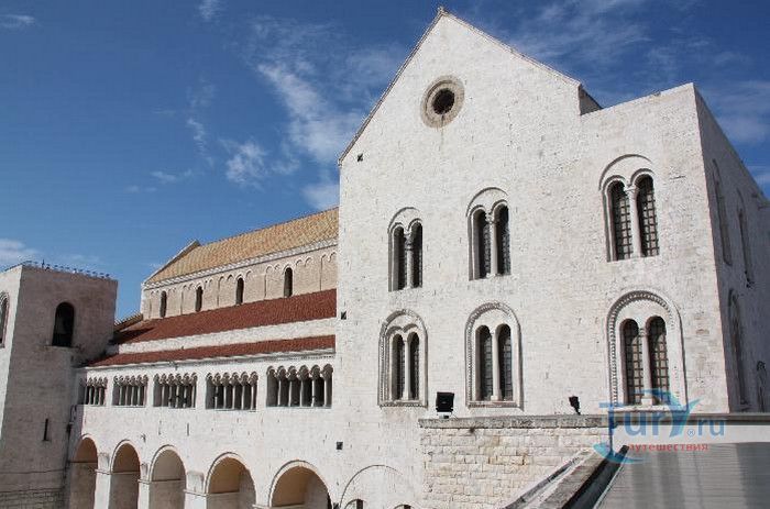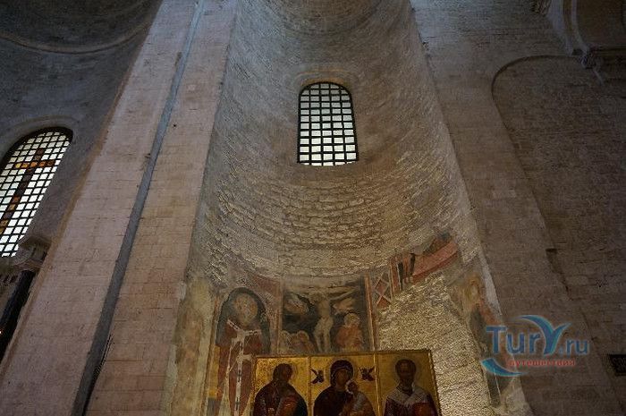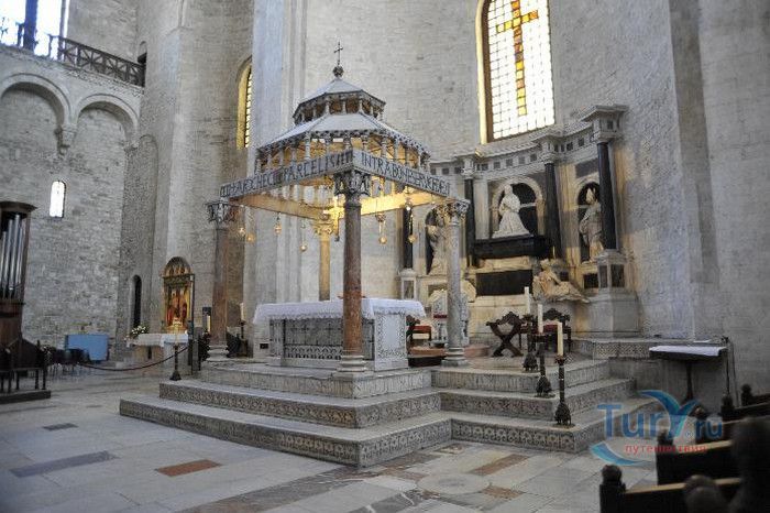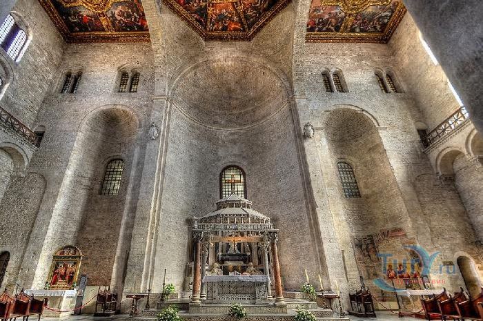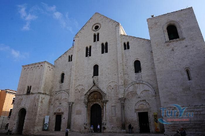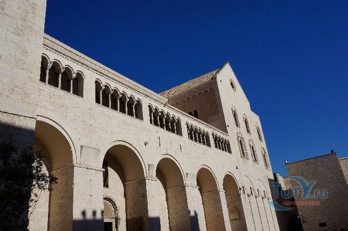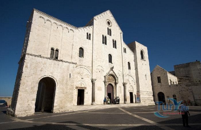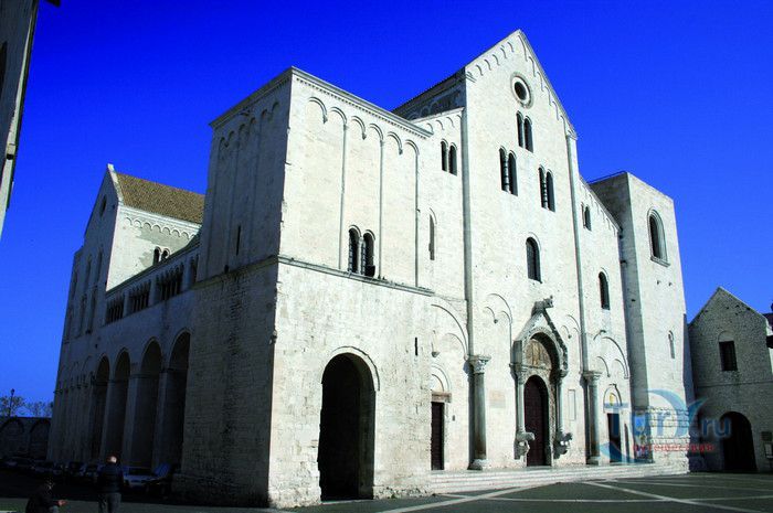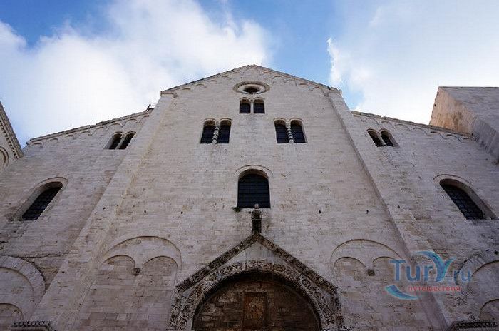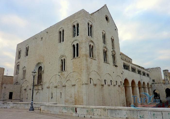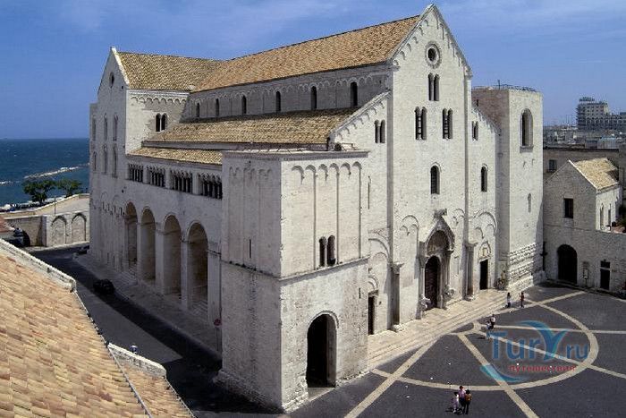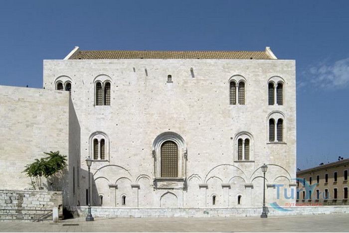 Возведение Базилики Святого Николая началось в 1087 году на месте бывшего дворца катапана - византийского наместника, губернатора, главы византийской провинции на территории Южной Италии. Дворец был покинут после захвата провинции норманнами в 1071 году. С этого времени Бари - процветающий, самый богатый город Юга, вытесняется с ближневосточных рынков, теряет своё былое влияние в регионе, торговля замирает, горожане и аристократия беднеют. Жизнь города кардинально меняется в 1087 году, когда в Бари были перевезены мощи Святого Николая, до этого около 750 лет покоившиеся в Мире. Мощи Святого Николая были выкрадены барийскими моряками из монастыря по заданию городской знати. Таким образом городу хотели вернуть былое влияние и сделать его религиозным центром, привлечь паломников и оживить жизнь в бывшей столице. 9 мая 1087 года три корабля с мощами Святого Николая на борту вернулись в порт, где их уже ждала радостная толпа горожан. Мощи были переданы аббату Бенедиктинского монастыря. С этого дня для Бари открылась новая историческая страница. Раньше этот город был византийской столицей Южной Италии, теперь он становится городом Святого Николая. В 1087 году, для достойного помещения мощей Святого Николая, начато возведение Базилики. Место для Базилики подходило идеально - на берегу Адриатического моря, рядом с морским портом. При строительстве здания использовались камни и архитектурные элементы древнего дворца катапана. Архитектурный стиль - романский. Величественный фасад базилики Святого Николая имеет выступающие пилястры, которые разделяют его на три зоны, соответствующие внутренним проходам. Базилика имеет три нефа длиной 39 метров, сводчатый трансепт длиной 31,5 метр, нефы завершаются апсидами. Снаружи апсиды закрыты прямыми стенами с ложными аркадами. Базилика состоит как бы из двух храмов - верхнего и нижнего. В нижнем храме - крипте в 1089 году была установлена рака с мощами Николая Чудотворца. В Бари начали прибывать со всех концов света паломники. Перед тем, как отправиться в крестовые походы, поклониться мощам Святого Николая приезжали знатные крестоносцы. Бесценные сокровища, подаренные паломниками и правителями многих стран, в том числе старинные каноны, мощи святых, католические и православные реликвии, дары Сербских царей, свитки, рукописи, старинные иконы - хранятся в Сокровищнице Базилики Святого Николая.