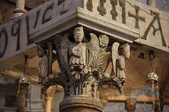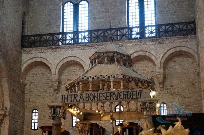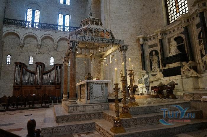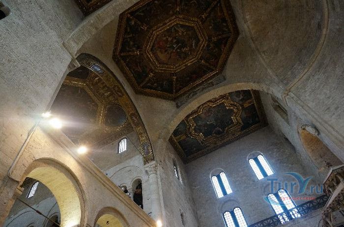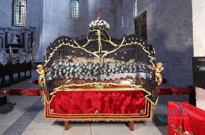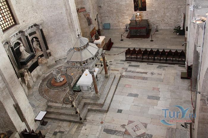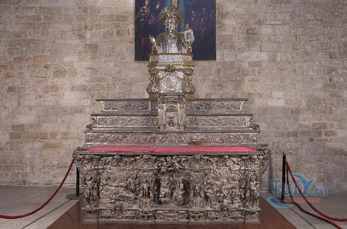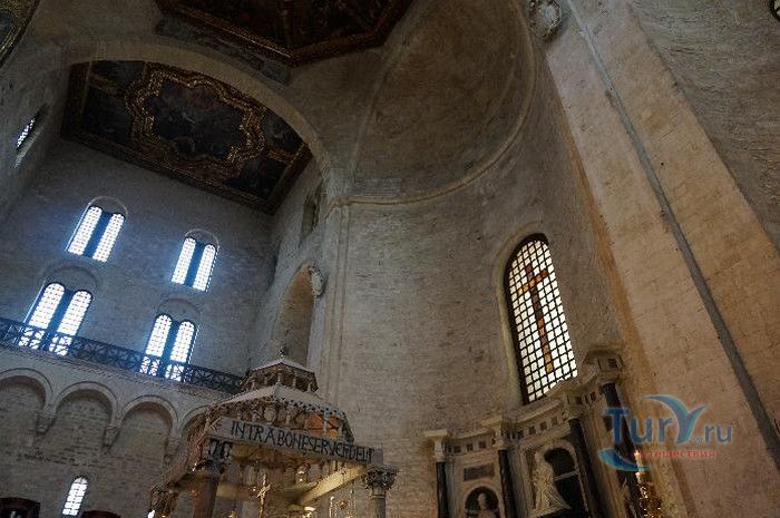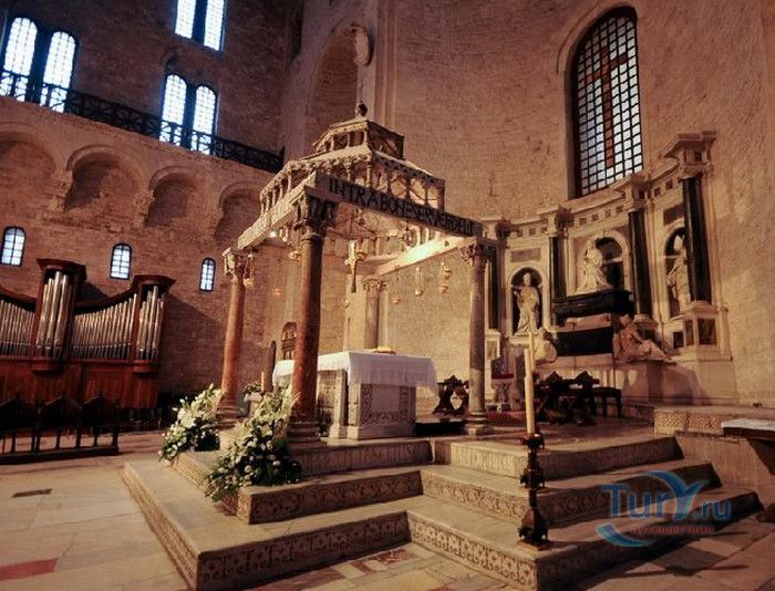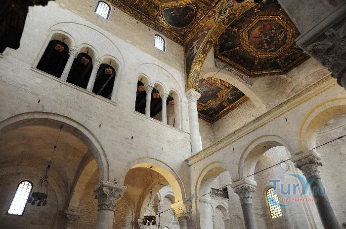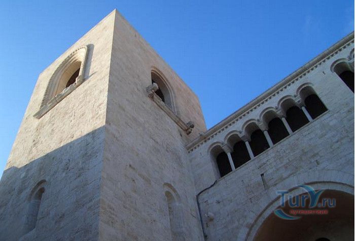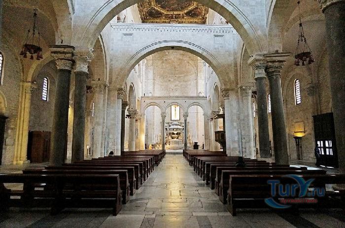 Возведение Базилики Святого Николая началось в 1087 году на месте бывшего дворца катапана - византийского наместника, губернатора, главы византийской провинции на территории Южной Италии. Дворец был покинут после захвата провинции норманнами в 1071 году. С этого времени Бари - процветающий, самый богатый город Юга, вытесняется с ближневосточных рынков, теряет своё былое влияние в регионе, торговля замирает, горожане и аристократия беднеют. Жизнь города кардинально меняется в 1087 году, когда в Бари были перевезены мощи Святого Николая, до этого около 750 лет покоившиеся в Мире. Мощи Святого Николая были выкрадены барийскими моряками из монастыря по заданию городской знати. Таким образом городу хотели вернуть былое влияние и сделать его религиозным центром, привлечь паломников и оживить жизнь в бывшей столице. 9 мая 1087 года три корабля с мощами Святого Николая на борту вернулись в порт, где их уже ждала радостная толпа горожан. Мощи были переданы аббату Бенедиктинского монастыря. С этого дня для Бари открылась новая историческая страница. Раньше этот город был византийской столицей Южной Италии, теперь он становится городом Святого Николая. В 1087 году, для достойного помещения мощей Святого Николая, начато возведение Базилики. Место для Базилики подходило идеально - на берегу Адриатического моря, рядом с морским портом. При строительстве здания использовались камни и архитектурные элементы древнего дворца катапана. Архитектурный стиль - романский. Величественный фасад базилики Святого Николая имеет выступающие пилястры, которые разделяют его на три зоны, соответствующие внутренним проходам. Базилика имеет три нефа длиной 39 метров, сводчатый трансепт длиной 31,5 метр, нефы завершаются апсидами. Снаружи апсиды закрыты прямыми стенами с ложными аркадами. Базилика состоит как бы из двух храмов - верхнего и нижнего. В нижнем храме - крипте в 1089 году была установлена рака с мощами Николая Чудотворца. В Бари начали прибывать со всех концов света паломники. Перед тем, как отправиться в крестовые походы, поклониться мощам Святого Николая приезжали знатные крестоносцы. Бесценные сокровища, подаренные паломниками и правителями многих стран, в том числе старинные каноны, мощи святых, католические и православные реликвии, дары Сербских царей, свитки, рукописи, старинные иконы - хранятся в Сокровищнице Базилики Святого Николая.
