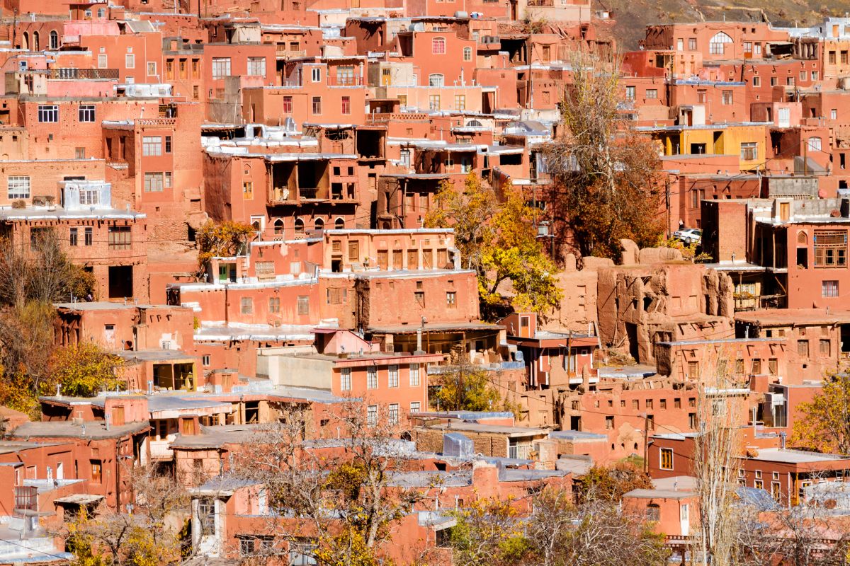 Деревня Абяне - одна из самых специфических деревень Ирана с живописным видом и прекрасным климатом, где все дома были построены на склоне холма на севере реки Барзруд с красивой и приятной архитектурой. По форме деревенские дома - лимасовые, глинобитные, кирпичные и каменные, относящиеся к эпохам Сасанидов, Сельджуков, Сефевидов и Каджаров, и в этой деревне нет ни одного тупикового переулка. Старые дома села построены на склоне холма с покрытием из красной земли, которое хорошо защищает от дождя.