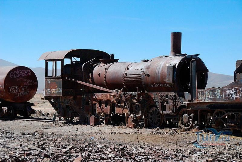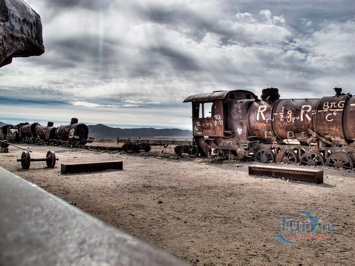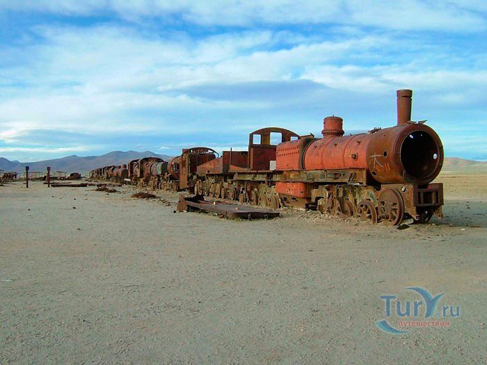 Кладбище паровозов находится всего в трех километрах от вполне современного и цивилизованного города Уюни, затаившегося в горах на высоте более чем в три тысячи семьсот метров над уровнем моря, на юго-западе Боливии. Это место удивляет гостей одним из самых причудливых пейзажей нашей планеты. Широкие открытые пространства, глубокое синее небо и облака, которые движутся быстрее, чем дикие лошади; постоянно сменяющиеся цвета и контрасты. И в самом центре этой красоты скопление ржавых локомотивов и вагонов, многим из которых уже более ста лет. Вид разлагающихся поездов, которые уже давно не ездят, не издают гудков, а только грустно стоят посреди пустыни и постепенно разрушаются, вызывает настоящие мурашки по коже. Поэтому неудивительно, что это место как магнитом притягивает туристов. Видимо, кладбище поездов прекрасно передает атмосферу нашей беспомощности перед временем, ведь даже такие железные «монстры» не могут устоять перед погодой и течением десятилетий. История кладбища поездов началась довольно банально. В конце XIX века правительство Боливии, возглавляемое президентом Анисето Арку, активно поддерживало строительство железнодорожных сетей в этом регионе. Справедливо считая, что для экономического процветания Боливии разветвленная транспортная система железных дорог просто необходима, власти обеспечили финансирование проекта, и вскоре Уюни стал настоящим городом железнодорожников. Здесь была крупная узловая станция, через которую проходили все важные транспортные магистрали региона. По прогнозам, Уюни должен был стать процветающим городом, ключевым транспортным и торговым центром региона. Первой проблемой стал саботаж. Местные индейцы аймары посчитали строительство железной дороги вторжением в их земли и, естественно, стали протестовать. Но если этот вопрос удалось урегулировать, то вот от следующего удара все планы правительства рухнули, как карточный домик. Уюни был важным горнодобывающим центром, вокруг которого располагалось великое множество рудников, приносящих колоссальную прибыль. Поэтому их ресурсы эксплуатировались на полную мощность. В сороковых годах XX они истощились и транспортировать стало больше нечего. Потребность в железнодорожных ветках отпала, а Уюни постепенно пришел в упадок. Ненужными стали и паровозы с вагонами. Кроме того, их обслуживание стоило очень дорого, а дохода они не приносили. Поэтому локомотивы и вагоны стали цениться даже меньше металлолома, ведь слишком много труда и других затрат бы потребовалось, чтобы разобрать их и вывезти из пустыни. В конечном итоге, сослужившую свою службу железнодорожную технику просто бросали под открытым небом за ненадобностью, согнав составы в дальний тупик железнодорожной линии. Горнодобывающая промышленность Боливии в этом регионе рухнула примерно в 1940-х годах, тогда же здесь и начали скапливаться поезда. На кладбище возможно увидеть как останки отдельных частей паровозов, так и целые составы: локомотивы, с прицепленными к ним вагонами. Интересно, что большинство гниющих поездов - это главным образом импорт из Великобритании, которая контролировала развитие железнодорожной системы Боливии. Казалось бы, эти железные «монстры» должны стоять тут столетиями, тем более, что Уюни находится в пустыне, где выпадает очень малое количес