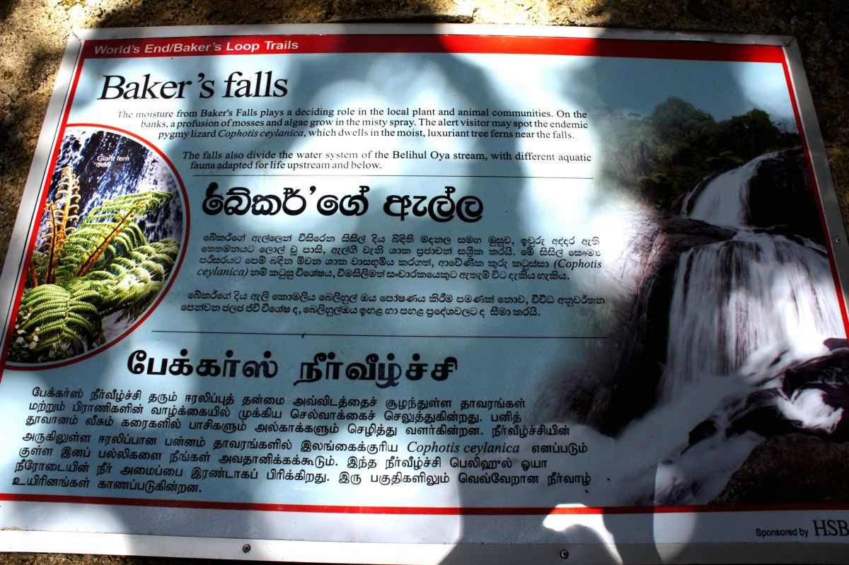 Водопад Бейкера является одним из самых красивых водопадов в Шри-Ланке. Его высота составляет около 22 метров. Водопад расположен в природном парке Хортон-Плейнс, на пути к Концу Света через равнины. Для доступа к этому водопаду есть две основные дороги - через районы Велимада, Нувараелия и Амбевела.