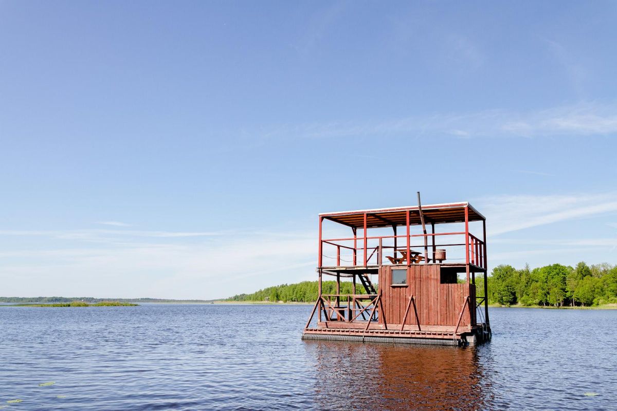 Расположенная на озере Эрмисту приватная двухэтажная баня на плоту предлагает банные впечатления для компаний до 10 человек. На первом этаже находится вместительная парилка с дровяным отоплением, лестница для спуска и уголок для сидения, на втором этаже можно устроить барбекю, всем вместе посидеть за столом и насладиться видом на озеро.