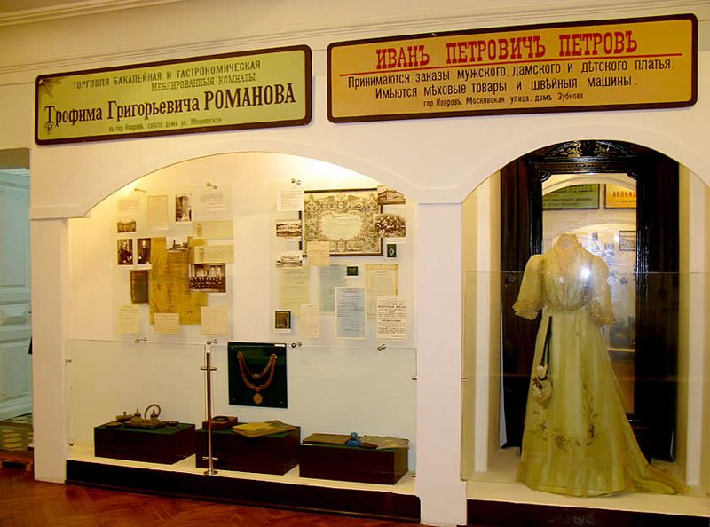 Экспозиция "Уездный город на рубеже XIX - XX веков" - это свобеобразная прогулка по Коврову с обилием церквей, крепких купеческих домов и лавок с обилием рекламы. Можно заглянуть в одну из таких лавок, а также окунуться в атмосферу мастерового человека, побывав в комнате модистки, увидеть кабинет чиновника. Облик Коврова оживает на старых открытках и фотографиях с видами и панорамами улиц.