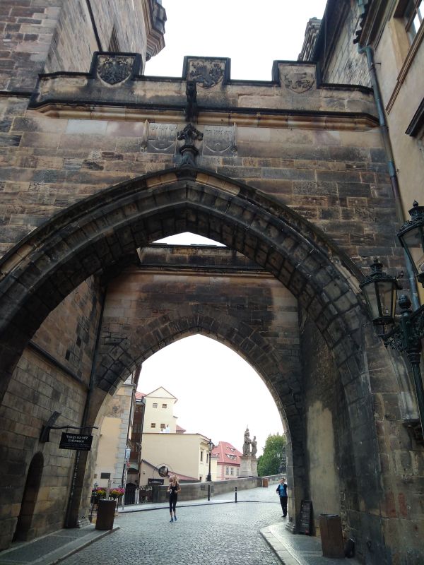 Ворота между двумя башнями представляют собой вход на Малую Страну. Ворота имеют вид стрельчатых аркад, украшенных по верхнему краю зубцами, со стороны моста они украшены символами земель Вацлава IV, на них расположены - Люксембургский лев, Чешский лев и Моравская орлица, а также герб Старого Места, со стороны Мостецкой улицы на них находятся знаки - вроцлавская орлица, Чешский лев и знак Долни Лужнице, под ними – знак Малой Страны. Ворота были построены после 1411 года на месте ранее построенного, несомненно, романского здания.