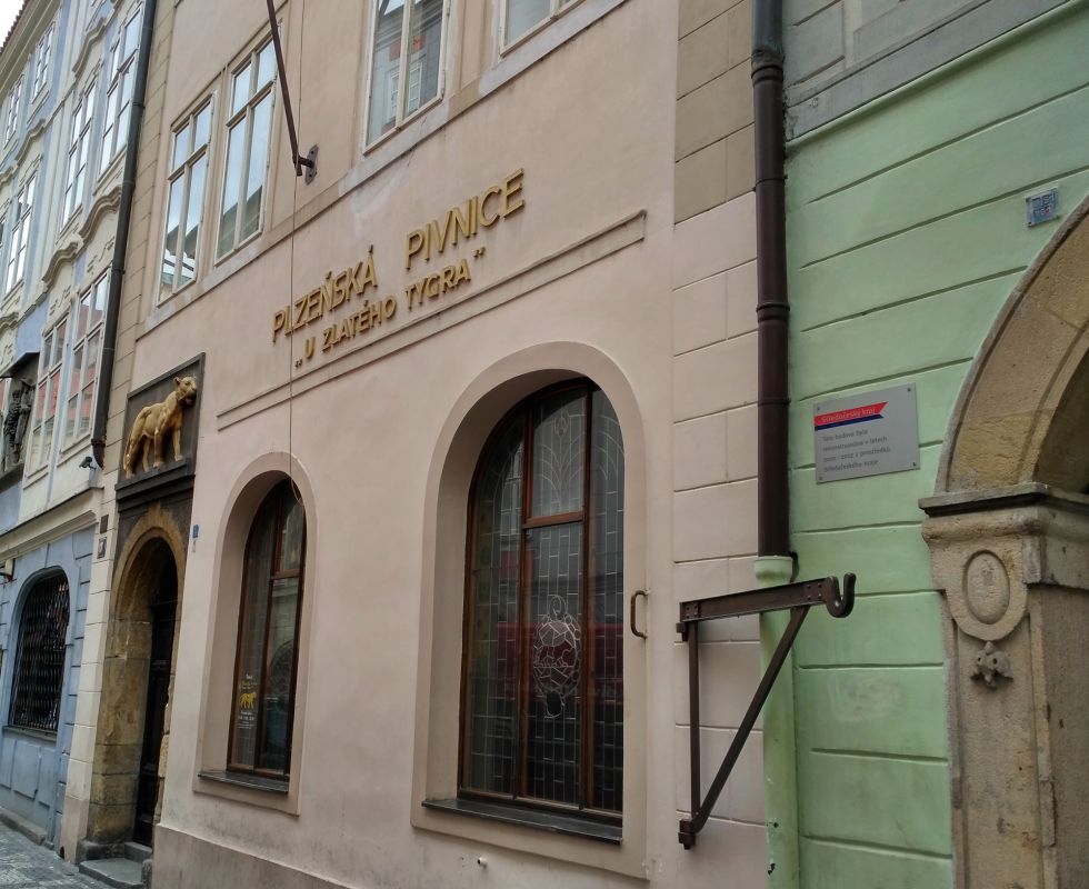 Первоначально готический мещанский дом постройки 14-го столетия прошел через горнило целого ряда перестроек в стиле ренессанс и барокко. О готике напоминает лишь портал, над которым ещё с 1702 г. расположился барельеф шагающего тигра. Этот любимый пивной трактир писателя Богумила Грабала привлекает не только своей уникальной атмосферой, но и, по утверждению знатоков – самым лучшим разливным плзеньским пивом. Найти здесь место случайному прохожему – дело не из лёгких.