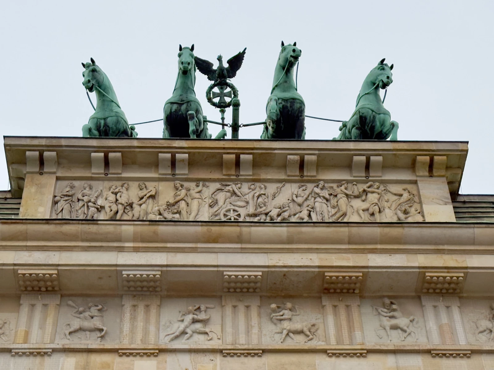 Это триумфальная арка, расположенная в самом центре Берлина, один из символов города. Ворота возвышаются на Парижской площади и являются напоминанием о том времени, когда в Берлин можно было въехать через них. Ворота были заказаны Фридрихом Вильгельмом II в знак мира и спроектированы Карлом Готтхардом Лангхансом в 1788 – 1791 гг. Высота Бранденбургских ворот 26 метров, длина – 65.5 метров и толщина 11 метров. Бранденбургские ворота состоят из 12 греческих дорических колонн, по шесть с каждой стороны. На их создание авторов вдохновили древнегреческие Пропилеи - монументальный вход в Парфенон в Афинах. Над воротами возвышается знаменитая и часто фотографируемая Квадрига работы Готфрида Шадова, построенная в 1793 году, на которой изображена статуя богини Мира, правящая колесницей, запряженной четырьмя конями.