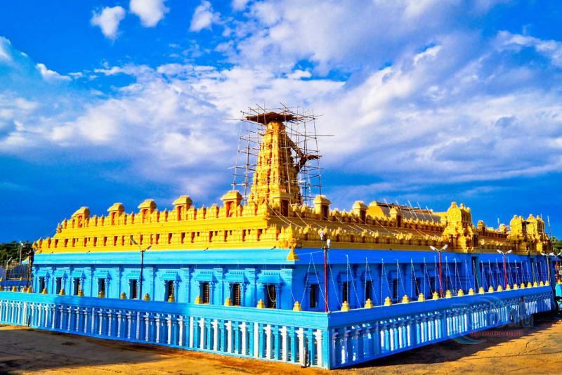 Миллионы золотых лучей жаркого полуденного ланкийского солнца осыпают благодатную землю. Среди зеленого ковра растений, издали виден сияющий золотом храм Лакшми Нараяна Перумал Ковил. Его структура резкими линиями выделяется на фоне голубого неба. Голубой с золотым храм украшен искусной резьбой и красочными скульптурами богов, которые замерли в ожидании благоговейно приближающихся просителей.