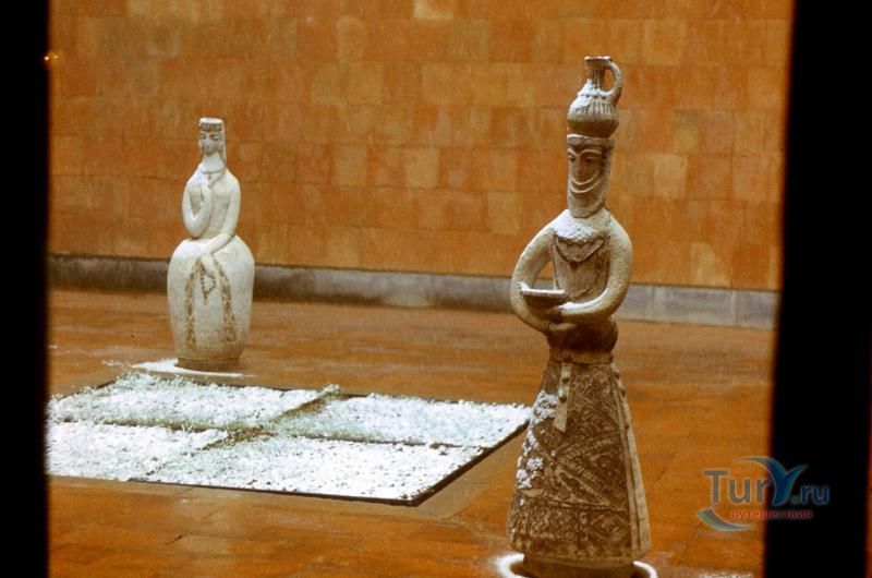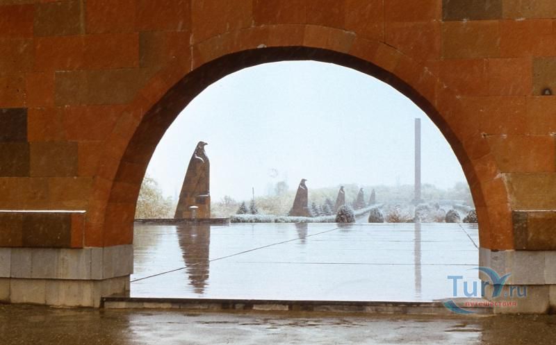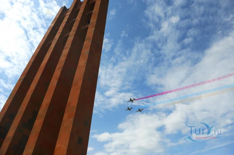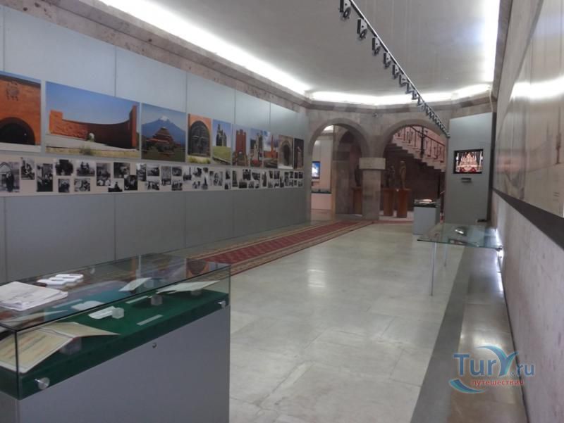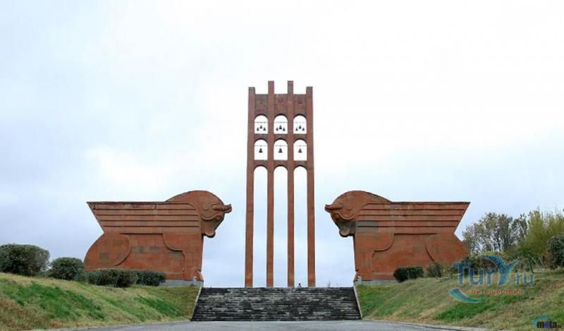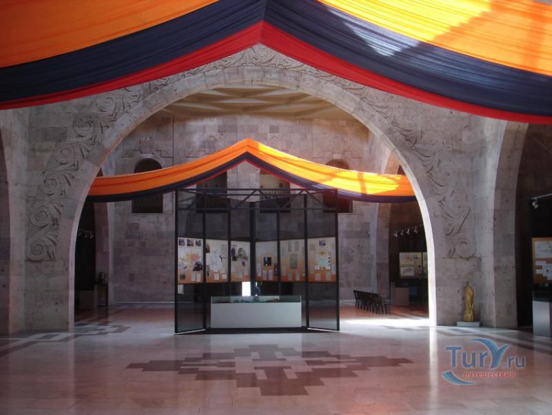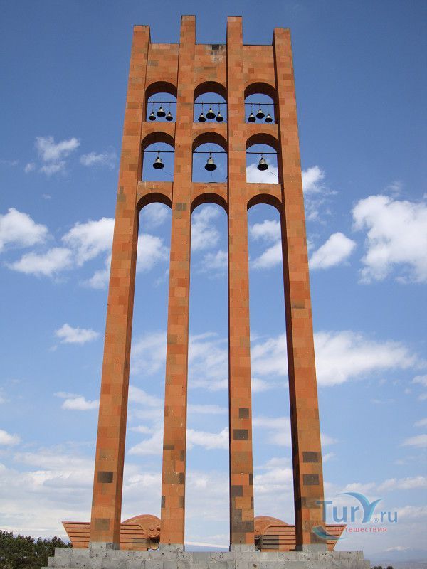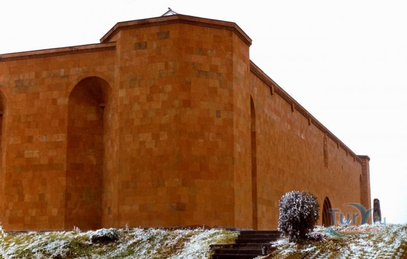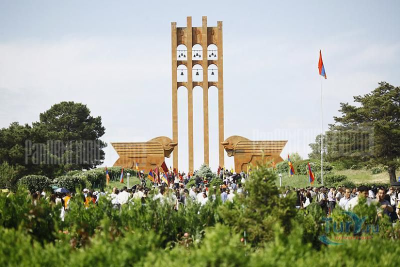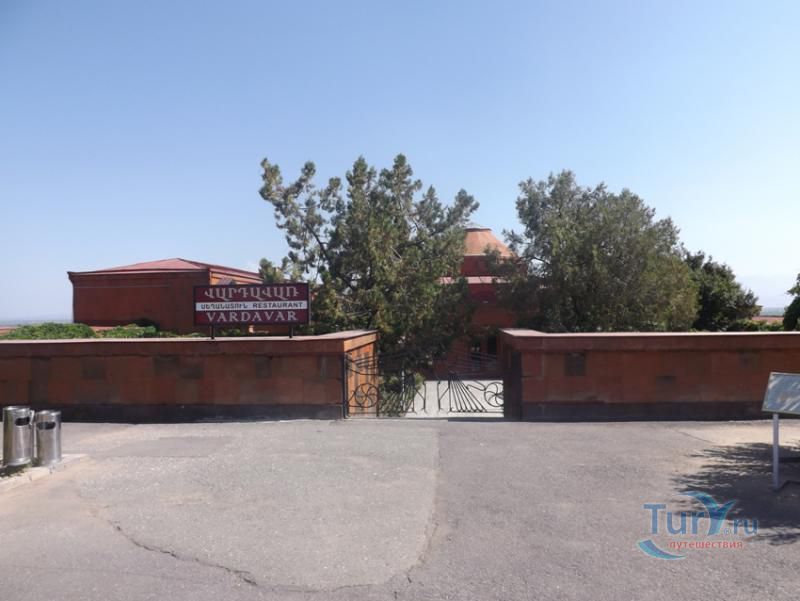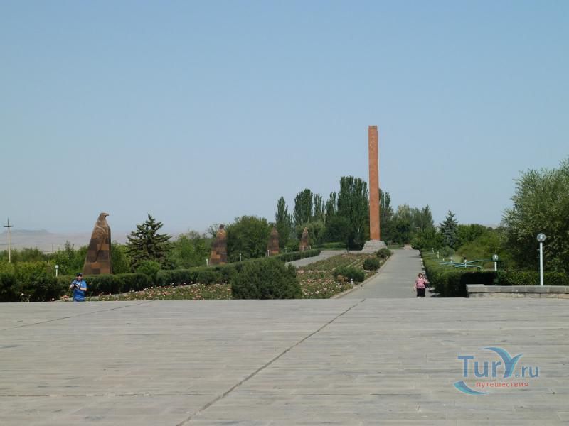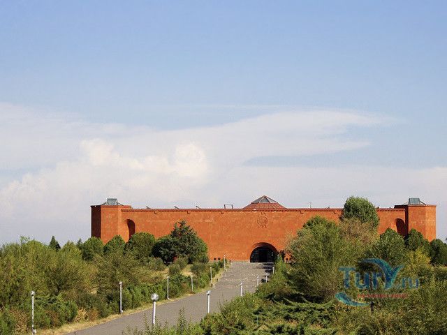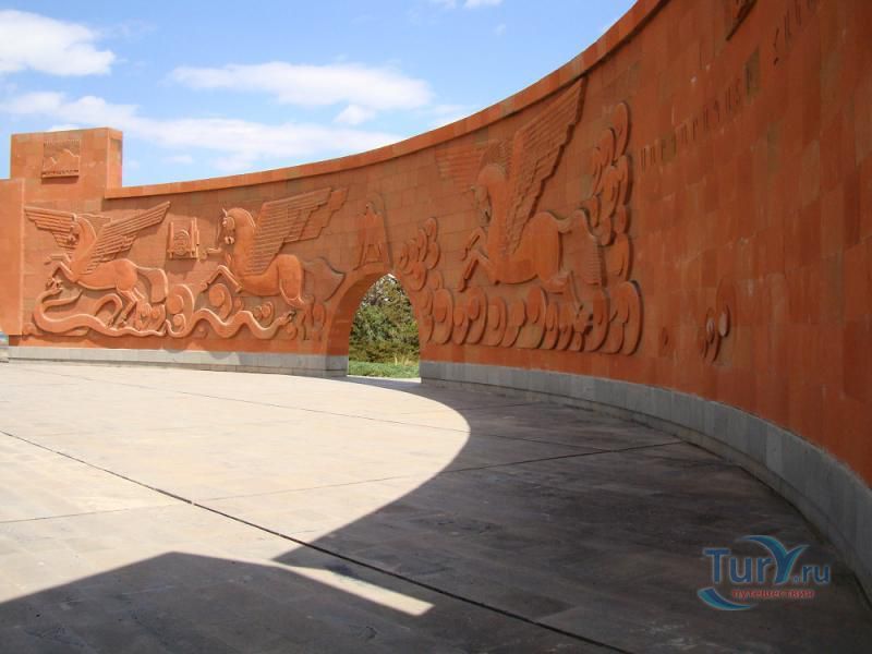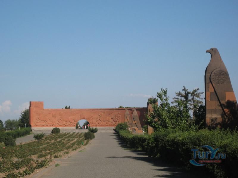 Сардарапат - это мемориальный ансамбль, посвященный историческим событиям, происшедшим вначале ХХ столетия. В 1918 году турецкая армия вторглась в Араратскую долину, заняла село Сардарапат и начала наступление на Ереван. 22 мая 1918 года здесь произошла решающая для армянского народа битва против врага. Рядом с воинами, готовыми ценой жизни победить врага, встали и старики, и дети, и женщины. 26 мая турецкая регулярная армия была полностью разгромлена. В ознаменовании 50-ой годовщины этой исторической битвы в мае 1968 года был открыт этот чудесный архитектурный ансамбль, рожденный по замыслу архитектора Исраеляна. Архитектура мемориального комплекса необычайна, индивидуальна и поэтому неповторима. Это сооружение не имеет прототипов в армянской архитектуре. Здесь гармонично сочетаются архитектура и скульптура. Ансамбль сооружен из красного туфа. Особое своеобразие комплексу придает высокая и красивая колокольня-усыпальница. Ее прозрачная легкость еще более подчеркивается на фоне массивных скульптур крылатых быков. Колокольня-усыпальница, возвышающаяся на 4-х основаниях, построена на месте захоронений павших в битве бойцов, а священные быки, символизирующие оставшихся в живых участников Сардарапата, призваны охранять надгробие-усыпальницу. К остальным сооружениям комплекса ведет аллея, на которой возвышаются скульптуры орлов, cимволизирующих храбрость героев битвы. Центральным звеном памятника является памятная стена Победы (высотой в центре - 7 метров, по краям - 10 метров, шириной - 55 метров). Это символическое сооружение, на котором с обеих сторон вырезаны горельефы и барельефы, посвященные мирному созидательному труду народа. На стене находится барельеф с видом горы Арарат, под которым авторы высекли расшифровывающее его слово «Родина». Другой горельеф изображает виноградные листья, два меча и молоток строителя. Он расшифровывается как «Труд». На левой стороне памятной стены изображена борьба крылатых коней - добрых сил против драконов, олицетворяющих злые силы. На верхней части той же стены - скульптурная голова богини Анаит, увенчанная виноградными гроздьями,которая символизирует пробуждение жизни, а фигура Ваагна, рожденного из огня, олицетворяет идею возрождения народа. В центре памятной стены высечена фигура орла-героя, победителя битвы. На стене высечены также динамичные фигуры ополченцев и скульптура «Мать-Армения», воплощающая силу армянки, призывающую дать отпор врагу. Авторы горельефов использовали элементы древней скульптуры. Во всех скульптурных образах ярко проявляется стремление авторов совместить гармонию и созвучие форм народного декоративного искусства со строгой монументальностью древней армянской скульптуры. Одной из построек музейного архитектурного комплекса является трапезная, отличающающаяся высоким архитектурным вкусом, гармоничная по формам и пропорциям, спроектированная с удивительным ощущением ритма и пластики. Трапезная построена в стиле средневековых гостиных дворов. Одно из строений украшено мозаикой, которое выделяется тонкой цветовой гармонией и выразительностью образов. Шедевром комплекса является здание музея, который имеет своеобразное архитектурное решение. Это здание, выстроенное из темно-красного туфа, с ажурными решетками на входе и без единого окна с фасада. 
