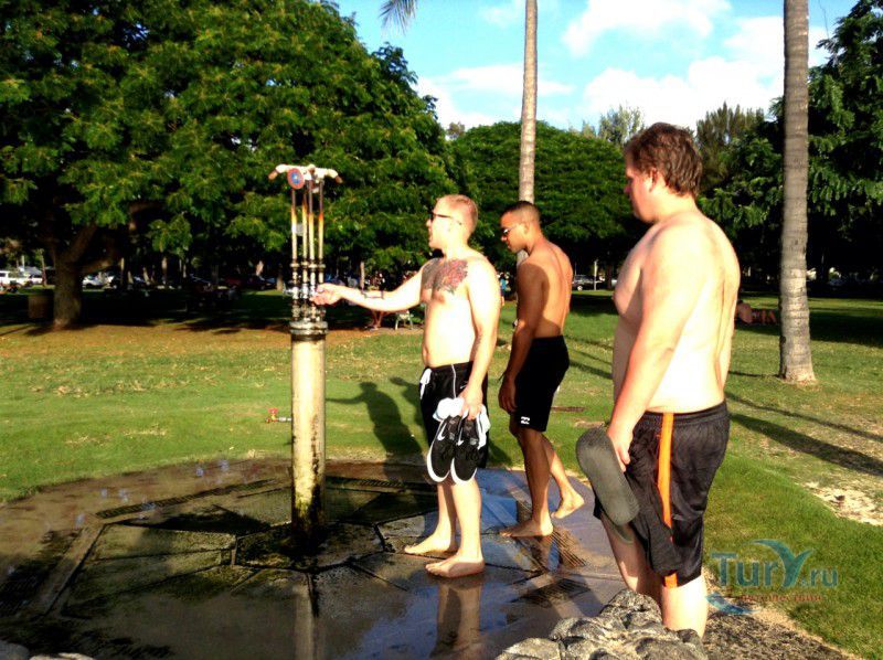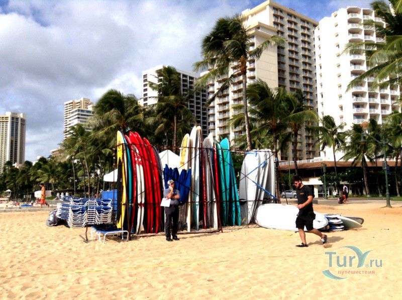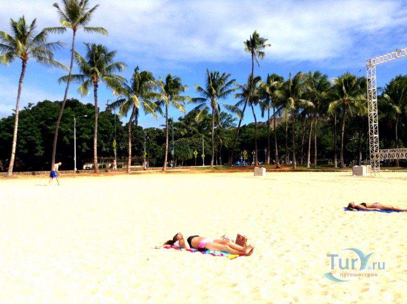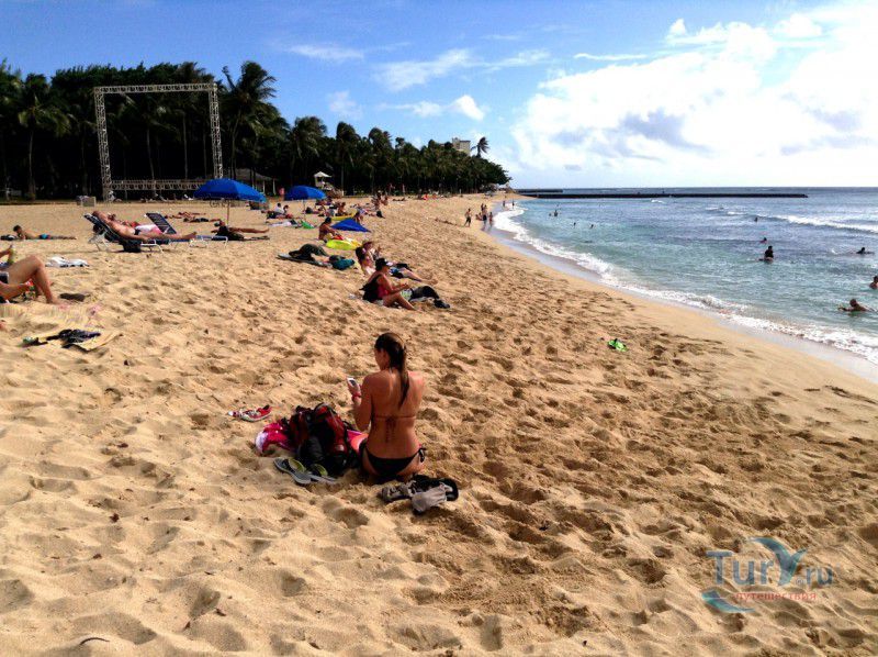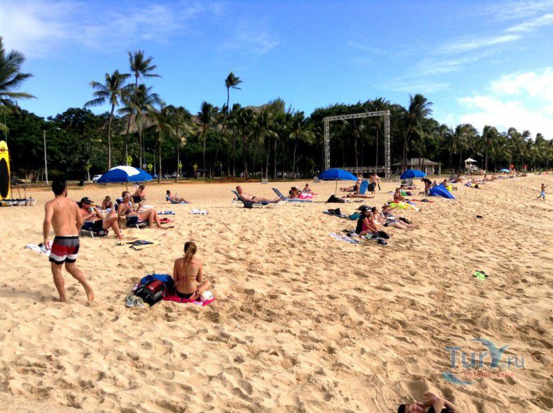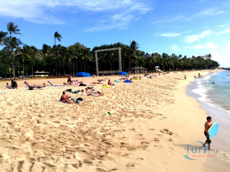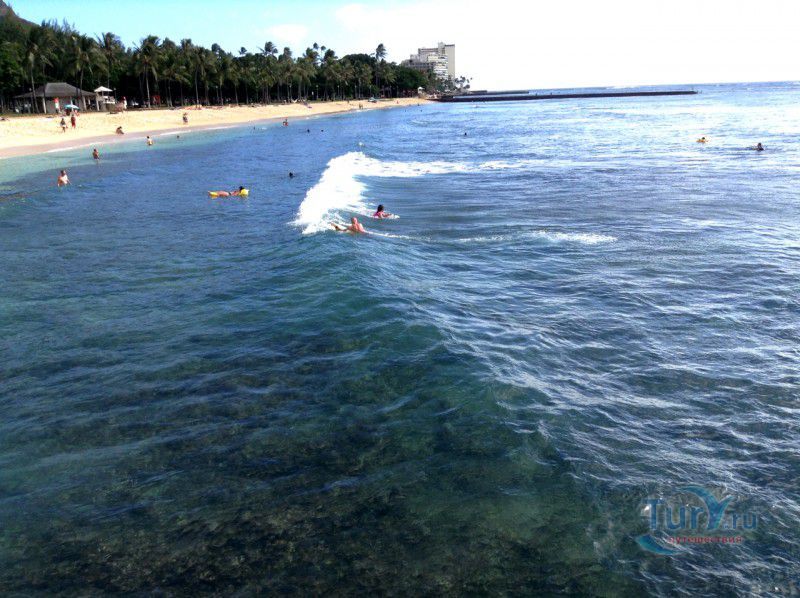 Пляжи Waikiki Beaches с запада на восток: 1) Kahanamoku Beach / Duke Kahanamoku Beach, 2) Fort Derussy Beach, 3) Gray’s Beach / Halekulani Beach, 4) Royal Moana Beach / Royal Hawaiian Beach, 5) Kuhio Beach / Prince Kuhio Beach, 6) Kapiolani Beach, 7) Queens Beach, 8) Kaimana Beach / Sans Souci Beach, 9) Outrigger Canoe Club Beach.