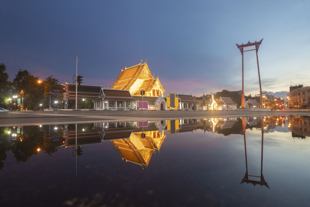 Район Сан-Чингча был центром Бангкока со времен Раттанакосин до наших дней. Гигантские качели или Сан-Чинча были построены во времена правления Рамы I после того, как он решил расширить город с запада или Тхонбури со времен короля Таксина на восток. Город был окружен раскопками канала. Затем король Рама I выбрал центр города и сделал его местом для святынь, храмов браманизма и Гигантских качелей. «Сан-Чингча» или гигантские качели до сих пор остаются выдающимся символом Бангкока. Это два возвышающихся красных столба, стоящих на огромном камне на высоте 21,15 метра. Пьедестал в форме цветка лотоса изготовлен из белого открытого бетона. На арке пьедестала установлен камень с надписью, рассказывающий историю Сан-Чинча. Пара центральных столбов и две пары свай с капителью были сделаны из круглых, точеных стволов тикового дерева. Рамка, соединяющая обе капители, была красиво вырезана. Все они были окрашены в красный цвет. Это один из архитектурных памятников, построенных для церемонии качания или церемонии три-ямпаваи из древнего индуистского эпоса. Гигантские качели, которые можно увидеть сегодня, - это новые качели, которые были перестроены в период с 11 по 13 сентября 2007 года. Новые столбы были сделаны из золотых стволов тикового дерева из Праэ. Гигантские качели стали одной из самых исторически важных туристических достопримечательностей Бангкока, хорошо известной среди тайцев и иностранцев. Архитектура в районе рядом с Гигантскими качелями, включая район Пхра Накорн, все еще остается в стиле раннего периода Раттанакосин.