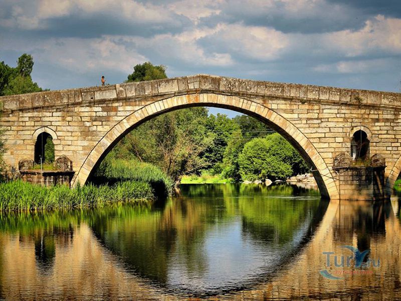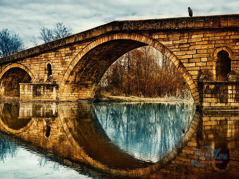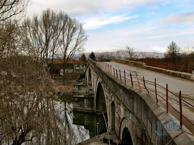 На восточном парапете с южной стороны моста воздвигнута гранитная плита с выгравированной надписью на турецком языке. На ней написано, что мост построен в 1470 году при султане Мехмеде II-ом. С турецкого языка название переводится как "мост невесты". Есть несколько легенд, которые объясняют такое название. Согласно одной из них, строительство моста совсем не шло - всё построенное за день сносилось водами реки за ночь. Поэтому мастера решили, что для успешного завершения строительства необходимо принести в качестве жертвоприношения одну из своих жен. Такой участи решено было удостоить первую, что принесет утром еду своему мужу. Первой пришла невеста мастера Манола и её тело зацементировали в основании моста.