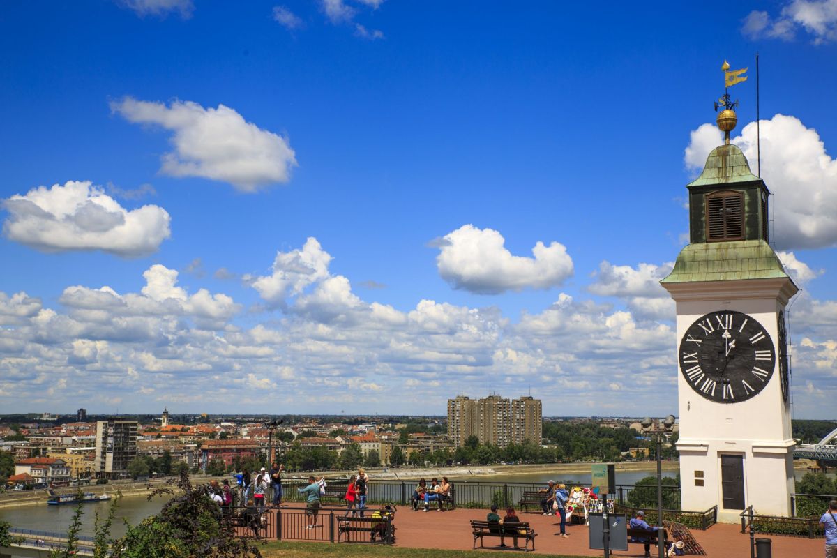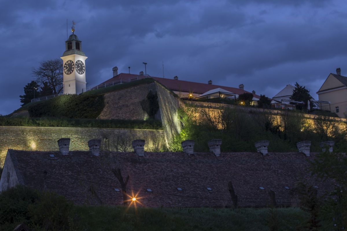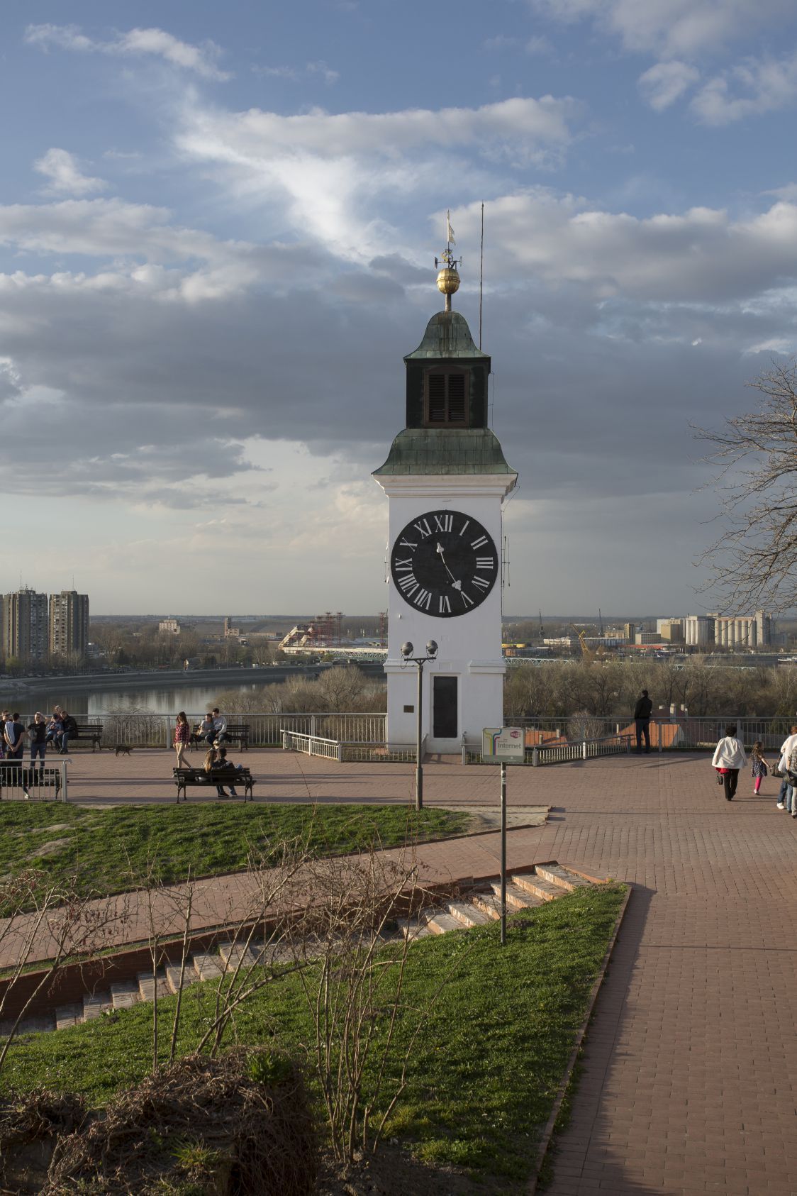 Часовая башня находится в верхнем городе крепости. На этом месте раньше была более старая постройка, которая была снесена в 18 веке. Радиус часов составляет более двух метров в длину, четыре циферблата направлены во все четыре стороны света, числа написаны римскими цифрами, а основные характеристики этих часов заключаются в том, что более длинная стрелка показывает часы, а более короткая - минуты. Этот тип часов требует ежедневного завода. На вершине башни есть флюгер и компас. Рядом с часовой башней находится так называемый длинный барак - двухэтажное здание второй половины 18 века. В этом здании в 1926 году находилась Авиационная школа унтер-офицеров Королевства сербов, хорватов и словенцев. Самым известным учеником был Франьо Клюз, пионер авиации во время Второй мировой войны. Одно из самых выдающихся зданий верхнего города - ворота Леопольда с передним планом в стиле барокко и подвесной мост, также с гербом и девизом монархии Габсбургов «Вирибусунитис» (объединенными силами).