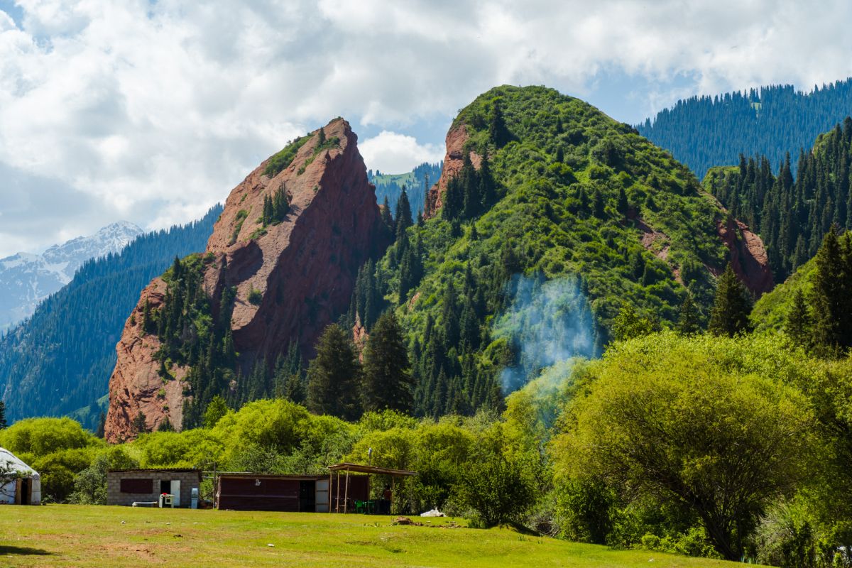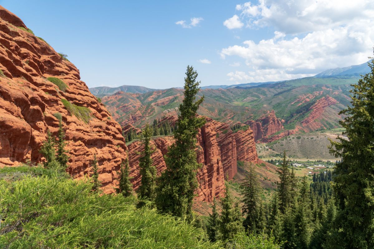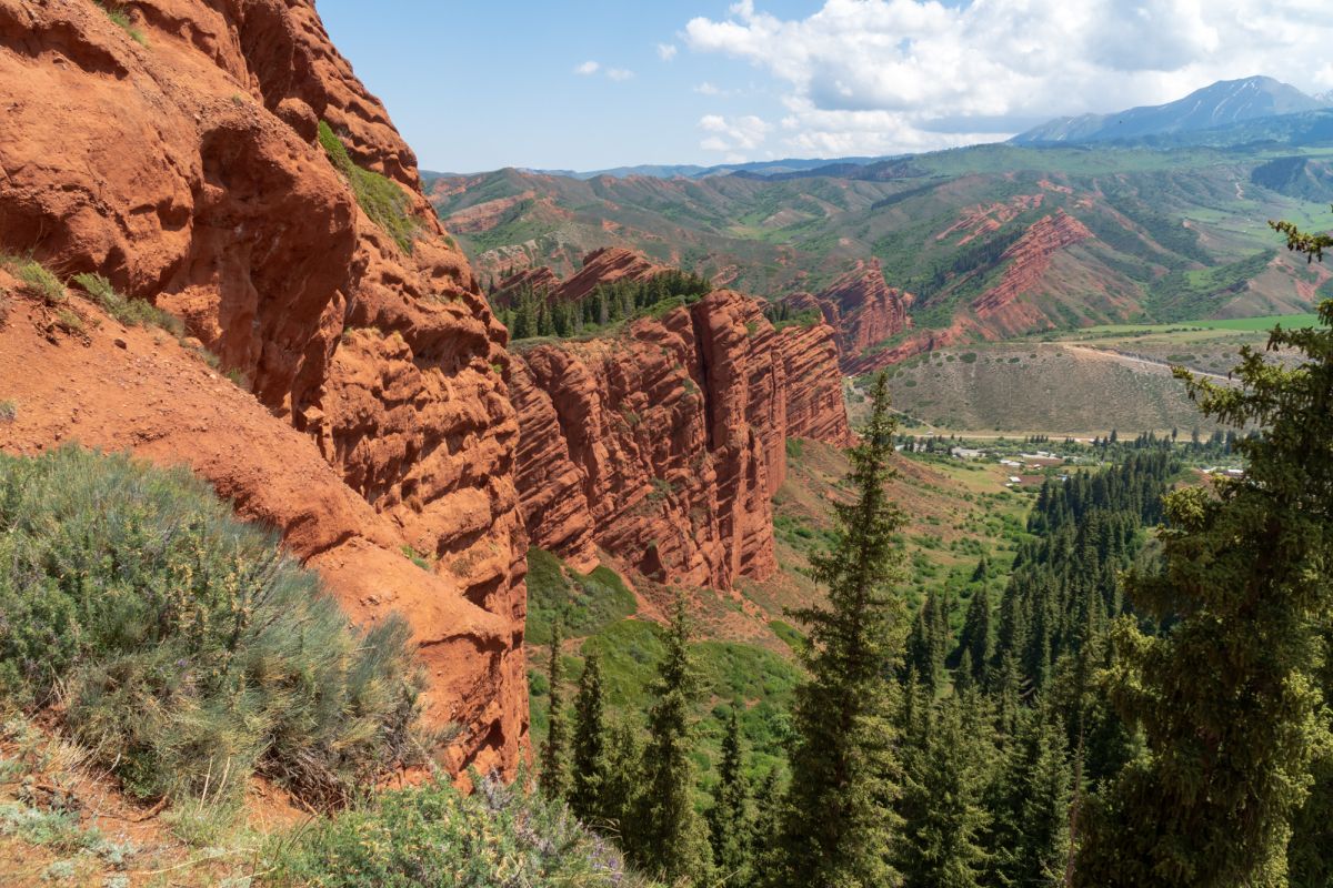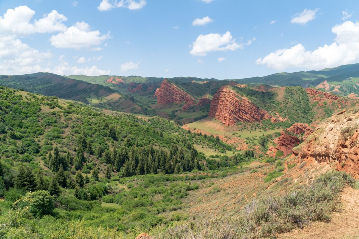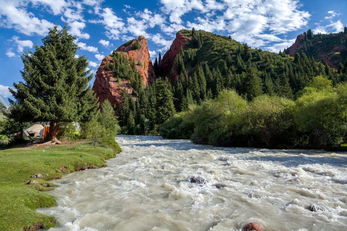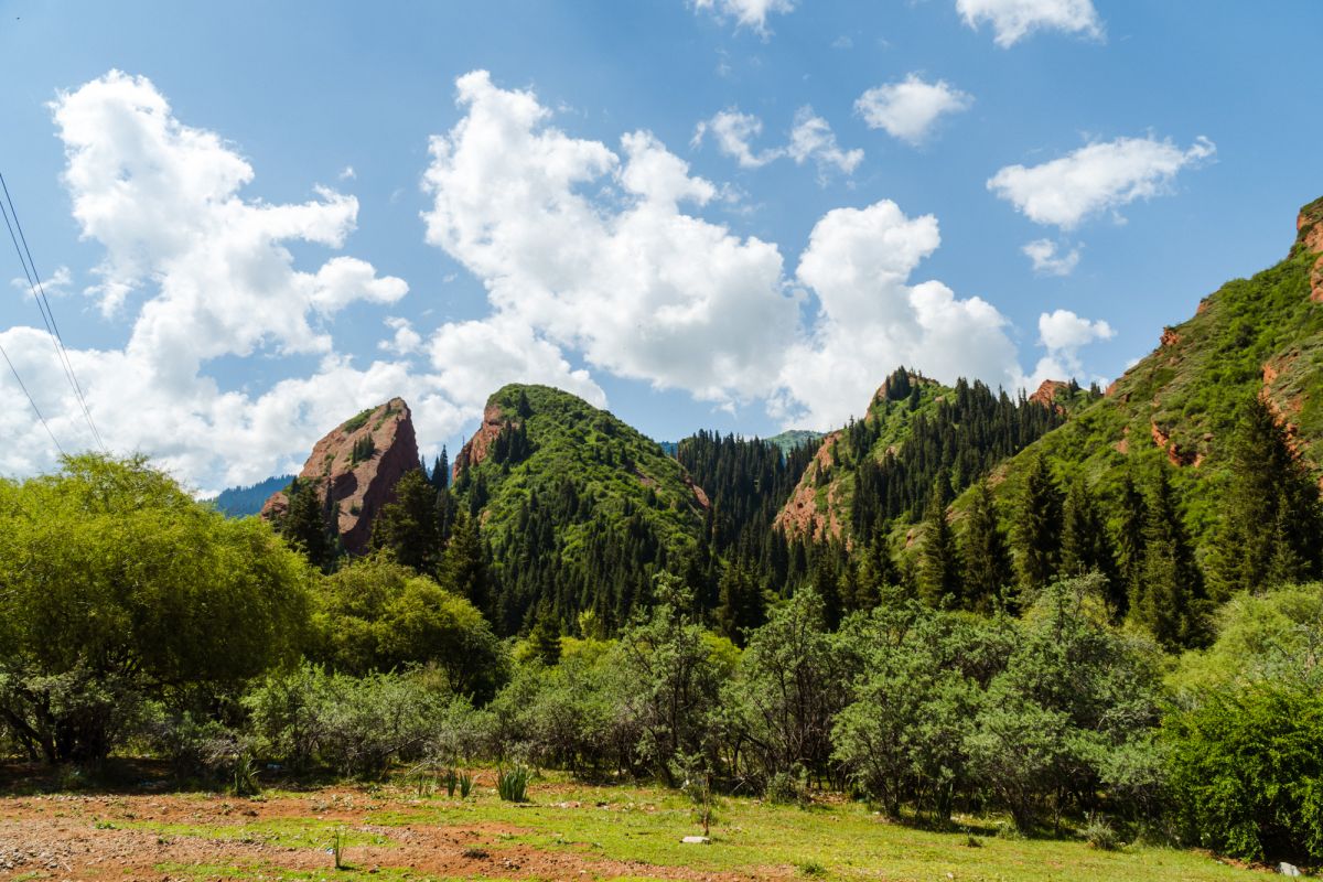 Живописное ущелье Джети-Огуз расположено в 28 км к юго-западу от города Каракол. Его название в переводе с кыргызского языка означает «семь быков», поскольку здесь протянулась громадная стена из семи красно-бурых скал, напоминающих выстроенных в ряд яростных быков. Особенно романтично выглядит скала «Разбитое Сердце», расположенная у въезда в ущелье. На высоте 2200 м построен лечебно- оздоровительный курорт Джети-Огуз известный своими геотермальными источниками. В ущелье Джети-Огуз на высоте 2500 м находится Водопад Девичьи Слезы. Чистейшие воды высокогорных ручейков множеством струек падают вниз по 40-метровой крутой скалистой стене и пленят взор, напоминая нежные девичьи слезы.