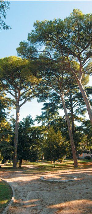 Впечатляющие и хорошо сохранившиеся образцы сосны (Pinus pinea) интересны не только своими вкусными и съедобными семенами - кедровыми орешками, но и своей отчетливо правильной зонтичной кроной на старых деревьях и глубоко бороздчатой красновато-коричневой корой, которая отслаивается в толстые пластины. Его шишки толстые и большие, семена созревают осенью второго года, тогда как шишки раскрываются весной третьего года. Семена очень вкусны в сыром виде, но также и жареные, поэтому их часто добавляют в различные соусы, которые подаются с гастрономическими деликатесами.