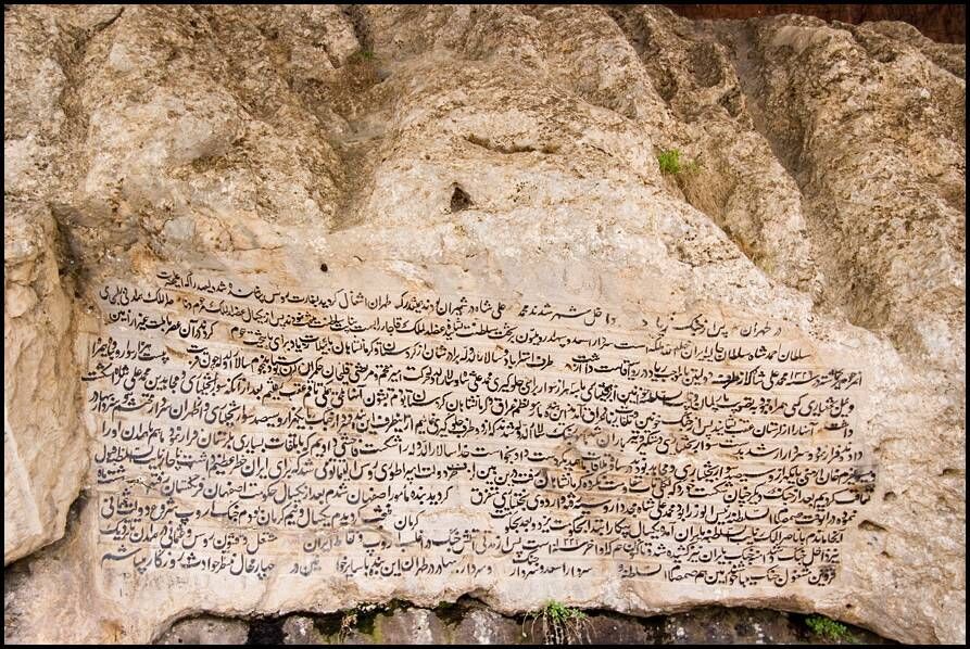 Эти надписи, расположенные на скале у подножия горы Загрос, были написаны насталиком, а в некоторых местах на шекасте насталик (буквально означает «сломанный насталик»), описывая битвы командиров бахтиари и племен против диктатуры Мохаммеда Али Шаха.