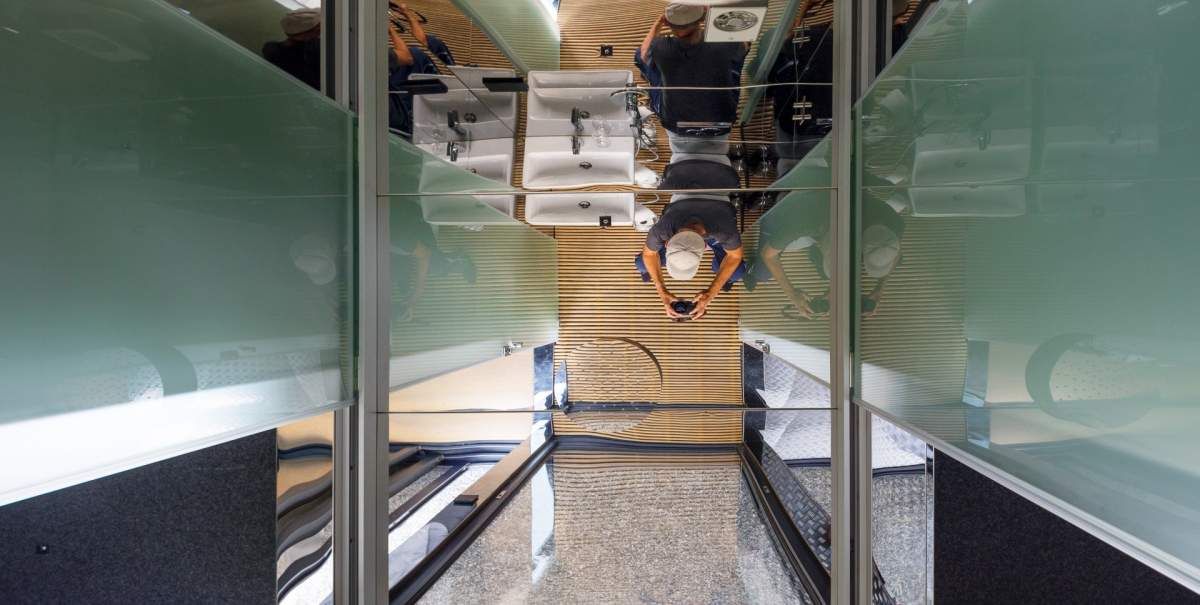 Это не «зеркальный дом», хотя в некоторых случаях он может выглядеть так. Вот почему BesteBakken повесил шторы, которые можно поднять. Однако в ванной никто не может заглянуть внутрь. Здесь можно не беспокоиться ни о любопытных посетителях, ни об альпаках, принимая душ.