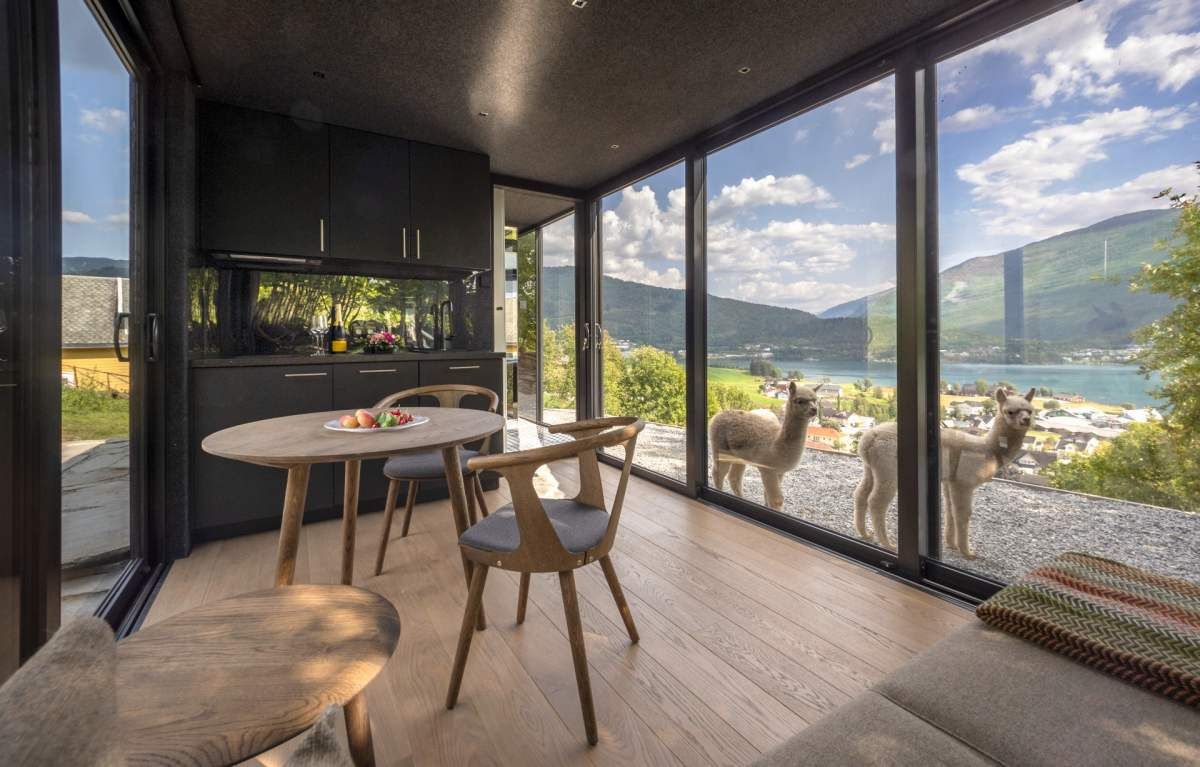 Стеклянный дом площадью 27 квадратных метров расположен блестящим прямоугольником среди холмов за желтым главным домом BesteBakken. А между домиками бродит пять непритязательных альпак.