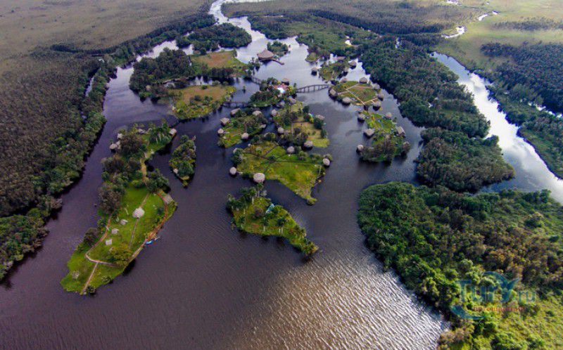 Индейская Деревня Гуама расположена на территории Национального парка Сапата (Parque Nacional Ciénaga de Zapata), на правом берегу озера Лагуна-дель-Тесоро. Индейцы из племени Таино жили в этих местах задолго до открытия Кубы Христофором Колумбом, аборигены занимались охотой, рыбной ловлей, возделывали землю. Строительство туристического курорта на озере Сокровищ (так называют Лагуну-дель-Тесоро), стилизованного под индейскую деревню, было инициировано кубинскими властями, работы контролировал сам Фидель Кастро. В создании курорта принимали участие архитекторы, историки, биологи, художники и строители из Гаваны и других городов страны. Были вырыты каналы, расчищены лагуна и протоки, через ручьи переброшены деревянные мостики, укреплены берега, высажены деревья и цветы, которые много веков назад росли в этих местах. В результате здесь была воссоздана самая настоящая индейская деревня, названная по имени вождя племени - Гуама. 44 индейские хижины на сваях построены из соломы и пальмовых листьев и со всех сторон окружены водой. Добраться в деревню можно только на лодке. Посетители, высадившись на берег, словно переносятся на несколько веков назад - здесь можно прогуляться среди индейских жилищ, заглянуть внутрь хижины и познакомиться с бытом аборигенов. Деревня "населена" индейцами Таино - по всей территории поселения расставлены глиняные статуи в натуральную величину, изображающие коренных жителей, занимающихся охотой, рыбной ловлей, добычей огня, приготовлением пищи и другими повседневными делами. На лужайке, рядом со скульптурами индейских женщин, готовящих еду, "резвятся" дети, здесь есть и воины, и охотники, и индейская старуха, и, даже, мечтатель. Автором композиции является известнейший кубинский скульптор Рита Лонга. На территории индейской деревни есть отель, ресторан, в котором можно отведать крокодильего мяса, сувенирный магазин и гончарная мастерская. Посетители могут стать зрителями костюмированных шоу, "современные Таино" готовы провести для гостей различные церемонии, среди которых посвящение в индейцев, общение с духами и свадебные обряды.