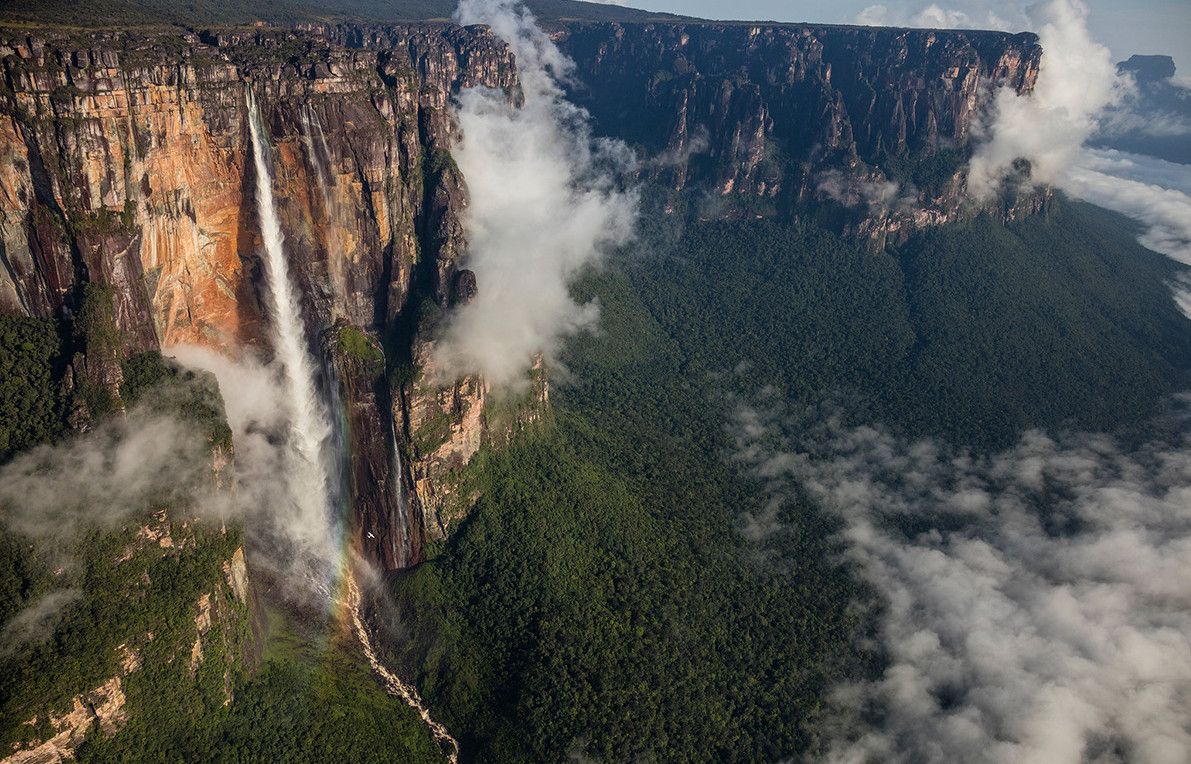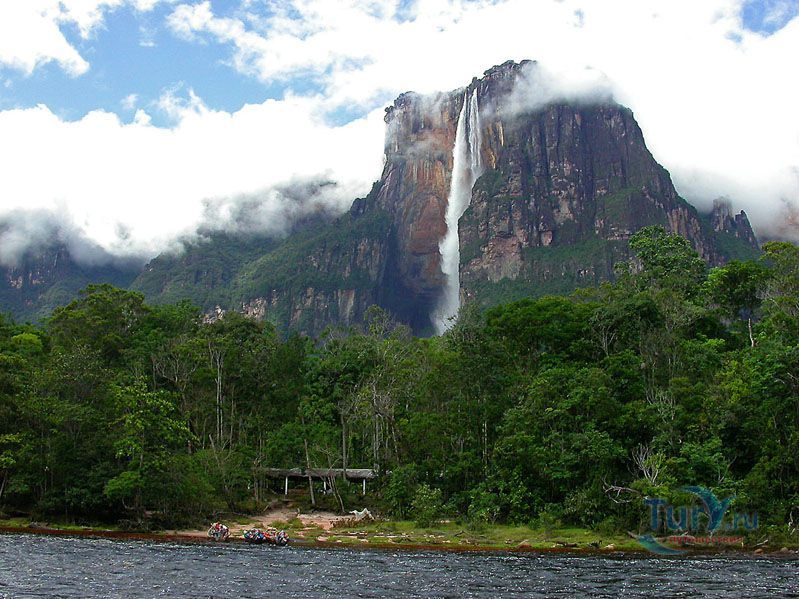 Самый высокий водопад на планете. Гигант 1-й величины носит имя его первооткрывателя - венесуэльского летчика Хуана Анхеля, индейцы же называли водопад Апемей или Девичья бровь. Невероятная восота падения воды - первый прыжок от обрыва до первого препятствия - 807 метров и второй - 172 до озера в джунглях, что в сумме состоавляет - 979 метров!!! Водопад Анхель находится на Юго-Востоке Венесуэлы - это довольно глухое место, доступное ранее исключительно настойчивым исследователям, теперь же попасть туда не сложно. Первый путь - по реке из Пуэрто-Ордас на Ориноко составляет примерно 240 км; и второй путь - полет из Эльдорадо и Санта-Элены - около 120 и 240 км. Для туристов наиболее приемлеиыми видами транспорта станут - каноэ с мотором или на небольшой легкий самолет. Для любителей острых ощущенй существует невеятная возможность, которую нельзя пропустить - прыжок с плато на дельтоплане. местные племена индейцев знают этот водопад под названием - Чурун-Меру, а плато называют - Ауян-Тепуи, что обозначает "Горы Дьявола". Это название полностью оправдывает себя, когда горы покрываются густым туманом. Издалека моно увидеть тонкую белаую полоску, которая начинается у края обрыва и постепенно превращаетя в невероятную струю брызг и водную пыль. В дождливую погоду этот царственный водопад окружает огромное количество более мелких струек воды, вырывающихся под обрывом из трещин в песчанике. Это зрелище одновременно невероятно величественное и элегантное в своей простоте, достойное звания высочайшего водопада мира.