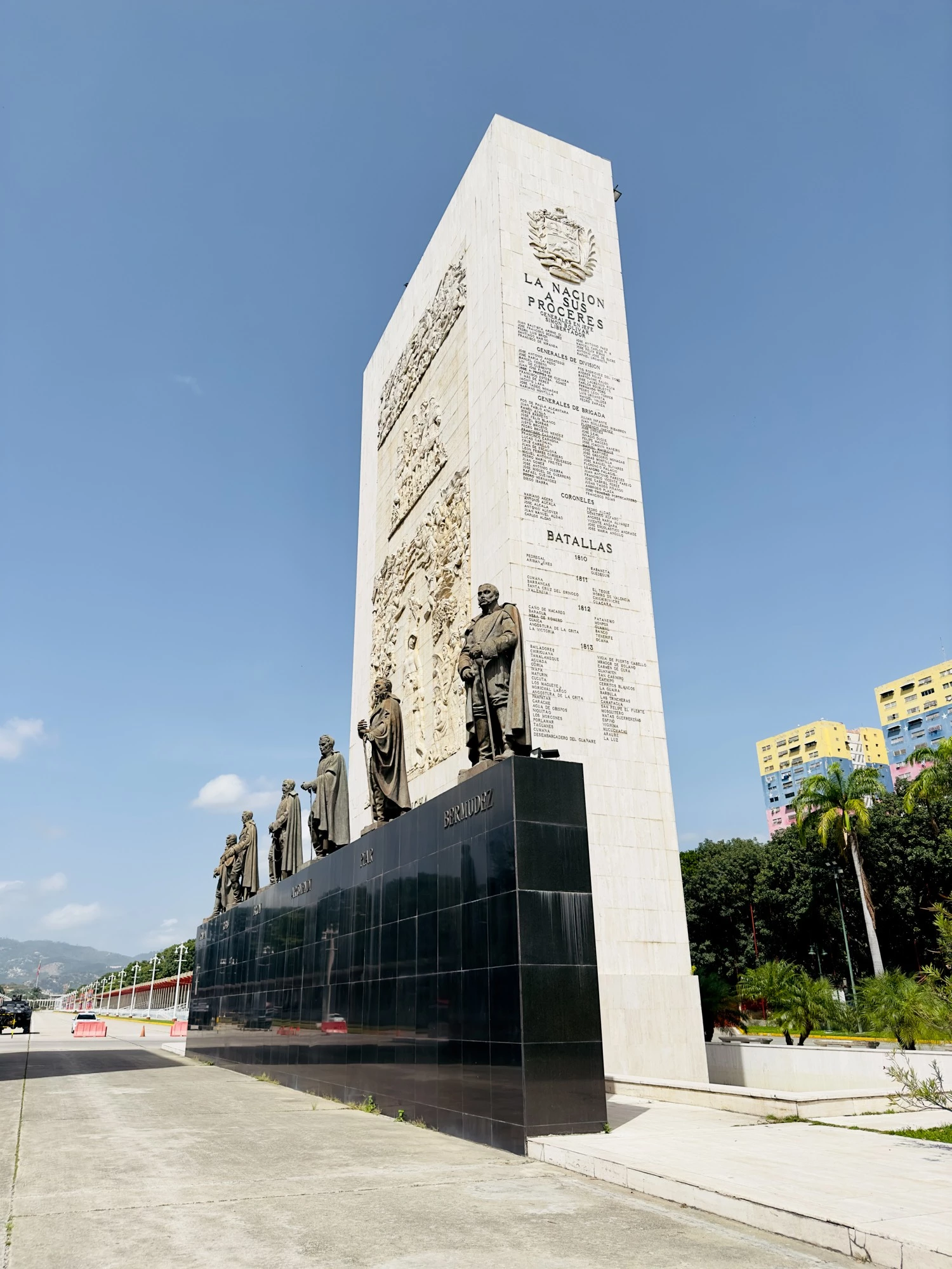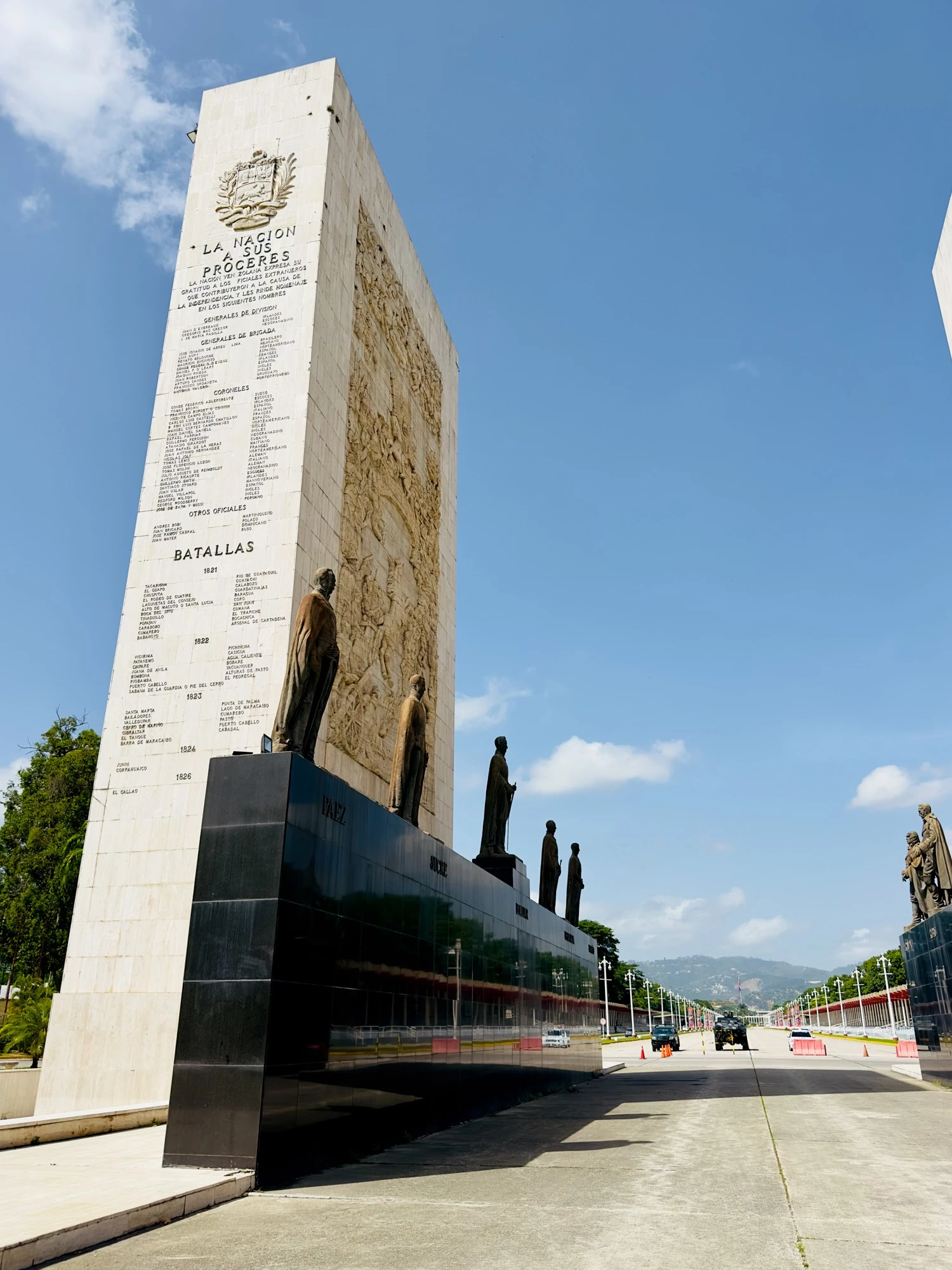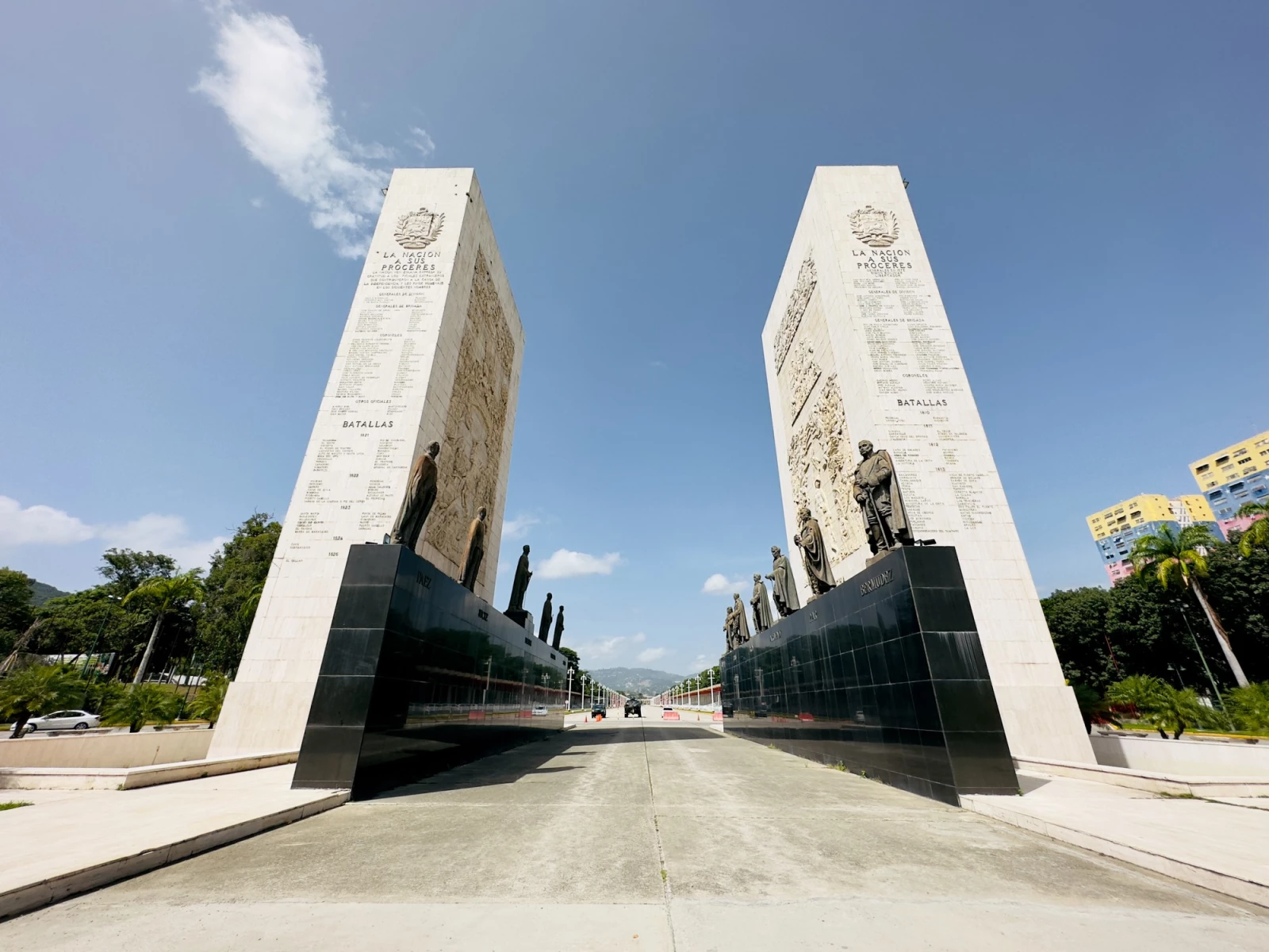 А по горизонтали выделяются бронзовые статуи героев независимости, таких как: Симон Боливар, Франсиско де Миранда, Антонио Хосе де Сукре, Маракучо Рафаэль Урданета, Сантьяго Мариньо, Льянеро Хосе Антонио Паес, Мануэль Пиар, Хосе Феликс Рибас, Луис Брион и другие.