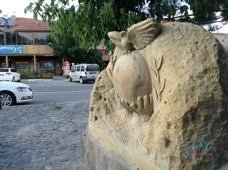 В центре небольшого городка Гёреме, который считается сердцем Кападокии, находится памятник, посвященный голубю. Во всей Каппадокии очень ценили и ценят голубей. Причиной столь бережного отношения к голубям был и есть недостаток плодородных почв. Голуби являются производителями лучшего удобрения, которое и сегодня используют в сельском хозяйстве. Благодаря этому удобрению в Каппадокии собирают высокие урожаи. Жители Гёреме с любовью относятся к птицам и создают все условия для того, чтобы голуби не улетали с насиженных мест. Для них строятся специальные голубиные дома в скальных породах, люди стараются защитить голубей от лис, куниц и мышей. Памятник установленный в Гёреме – это своего рода символ благодарности, посвященный голубям, которые помогают людям собирать хорошие урожаи в сложных климатических горных районах Каппадокии.