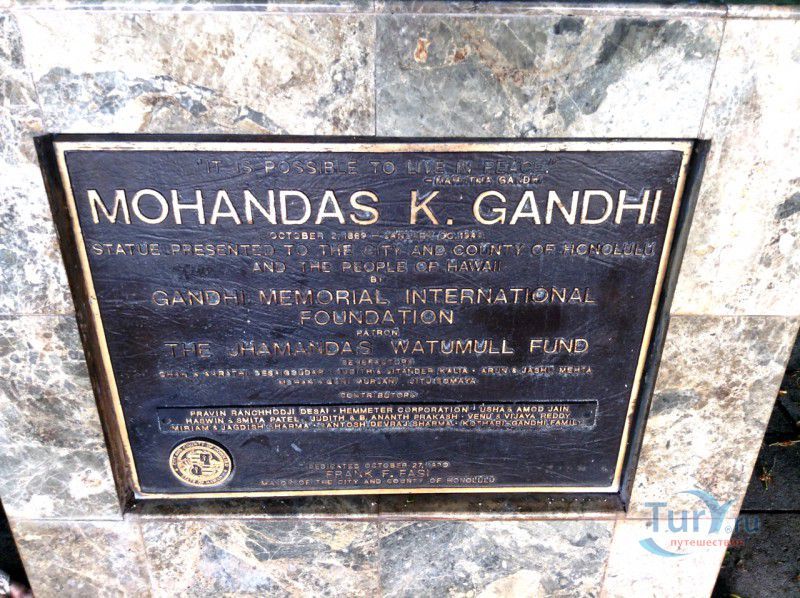 Памятник индийскому философу, руководителю и идеологу движения за независимость Махатма Ганди (полное имя Mohandas Karamchand Gandhi) установлен в Парке Королевы Капиолани (Queen Kapiolani Regional Park), который раскинулся на берегу Тихого океана в южной части острова Оаху, в знаменитом районе Вайкики города Гонолулу. Скульптура изображают Ганди в преклонном возрасте, с мудрым лицом в очках, идущего босиком и опирающегося на посох. Годы жизни Ганди: родился 2 октября 1869 года в г.Порбандар, Гуджарат — убит 30 января 1948 в Нью-Дели. Титул Махатма, что означает "великая душа", дал Ганди индийский писатель, лауреат Нобелевской премии по литературе Рабиндранат Тагор. Махатма Ганди проповедовал сатьяграху - философию ненасилия, которая оказала огромное влияние на движения сторонников мирных перемен во всем мире. Он ратовал за отмену кастовости и за равноправие в Индии, боролся за независимость Индии от Великобритании.