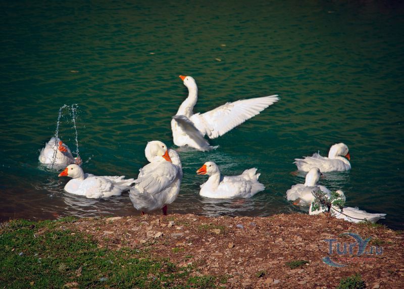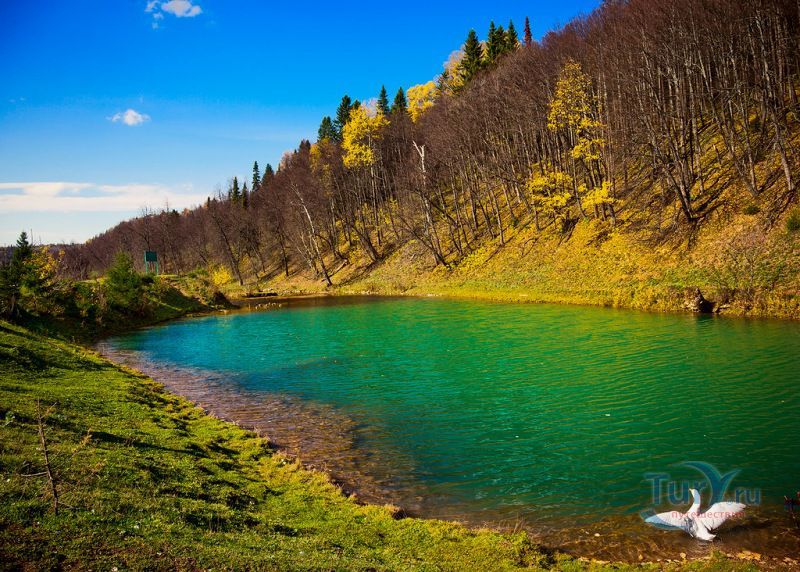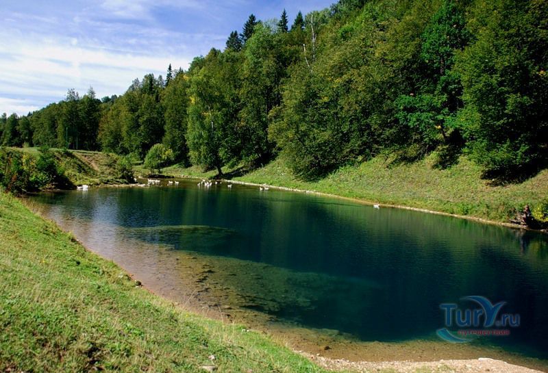 Озеро Сарва находится на восточной окраине одноименной деревни. Озеро Сарва является геологическим памятником природы и находится под охраной. Оно необычайно красиво, обычно его вода имеет красивейший голубоватый оттенок, но цвет меняется в зависимости от погоды. Сарва имеет карстовое происхождение. Оно небольшое по площади - около 60 метров в длину и около 30 метров в ширину. Зато глубина доходит до 38 метров. Дно уходит отвесно вниз практически возле самого берега. Стоя у левого края озера, можно увидеть около полуметра дна, а дальше - бездонная пропасть. Правый берег представлен крутым горным склоном, обросшим липово-пихтовым лесом с небольшой земляничной полянкой. Купаться в озере почти невозможно, вода здесь ледяная, поэтому его еще называют озеро-родник. Здесь водятся окуни, караси и щуки. Воды этого озера дают начало одноименной реке, которая через 17 километров впадает в другую реку Салдыбаш - приток Уфы.