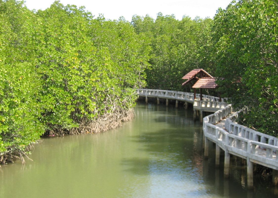 Практически в самом центре деревни Бан-Са-Лак-Кхок (Ban Sa Lak Khok), которая расположена в юго-восточной части острова Ко-Чанг, в провинции Трат Восточного Тайланда, находится одно интересное для туристов место - это длинная дорога по Мангровым зарослям. Сама дорога представляет собой шедевр творения рук человеческих - эта железобетонная конструкция на высоких сваях со множеством поворотов, изгибов, ступенек, мостиков и крытых мест для отдыха длиной в несколько километров. Даже в самое знойное время идти по дороге вполне комфортно - густые сочные кроны мангровых деревьев спасают от палящих лучей солнца, а легкий ветерок освежает идущих. Здесь путешественник попадает в другой, особый мир дикой природы - блестящие крупные листья мангровых деревьев ярко-зеленого цвета сплошным ковром покрывают огромную площадь зарослей, лишь кое-где оставляя путь каналам - водным артериям, питающим мангры. Многочисленные, переплетенные между собой немыслимым образом, корни деревьев поддерживают мощный ствол и увесистую крону, приподнимая их высоко над болотистой жижей. Глядя на эту картину, понимаешь, что если бы не эта дорога на сваях, то вряд ли бы кто-то решился по своей воле вторгнуться во владения мангровых зарослей и пройтись своими ногами по их миру. На это можно только смотреть - смотреть и удивляться разнообразию жизни на нашей планете Земля. Где-то посреди пути по бетонному лабиринту дороги стоит высокая смотровая вышка, взобравшись на которую, можно обозревать километры ярко-зеленого покрывала мангровых зарослей, раскинувшегося на все четыре стороны, и ленты каналов, добавляющие к зеленому свои шоколадные оттенки.