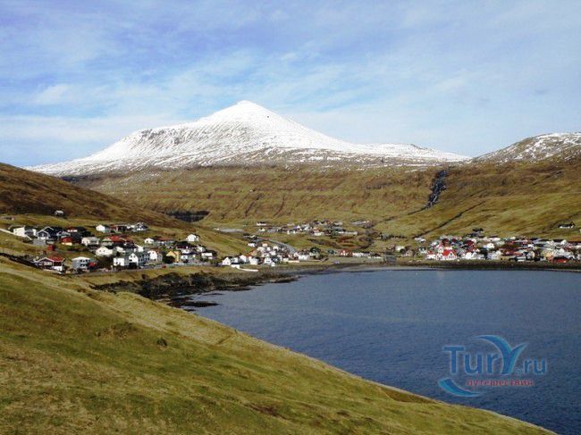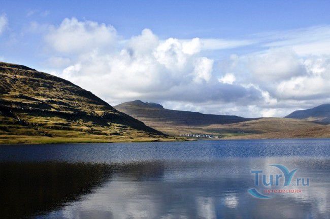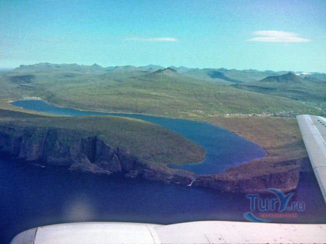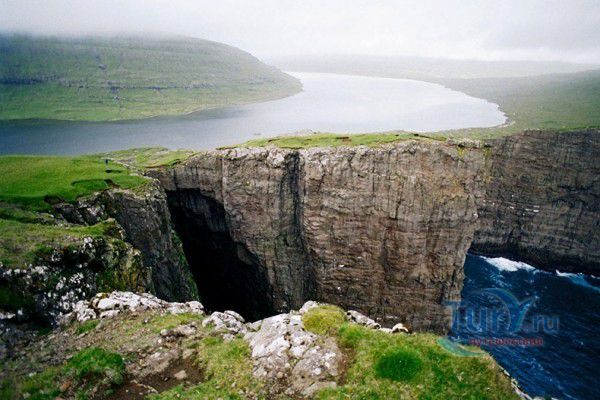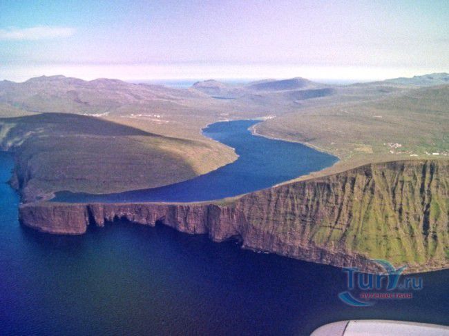 Озеро Сорвагсватн (Sørvágsvatn), или как его еще называют, Лейтисватн (Leitisvatn), расположено на самом большом острове Фарерского архипелага – Вагар (Vágar). Путаница в названиях происходит от того, что вблизи озера расположены два населенных пункта, жители которых соперничают за право называть водоем по-своему. Селение Мидвагс (Miðvágs) дало озеру название Лейтисватн, поскольку земли рядом с озером они называют Лейти (Leiti). Городок Сорвагсватн, расположенный чуть дальше от озера, желает, чтобы водоем назывался в честь их города, поскольку он основан значительно раньше Мидвагса. Помимо этих двух названий, существует и третье, которым пользуются те фарерцы, которым неинтересны пустопорожние споры — просто «Озеро» (Vatni). Пока что более официальным названием является все-таки Сорвагсватн, уж так исторически сложилось. Озеро площадью в три с половиной квадратных километра и длиной в шесть километров является самым большим на Фарерских островах. В нем нет нечего примечательного, кроме одной детали – его водная гладь вплотную подходит к океану и как будто нависает над ним. Если взглянуть на верхнюю фотографию, кажется, будто воды Сорвагсватна возвышаются над океаном на сотню метров, хотя это совсем не так – перепад высот составляет всего 30 метров. По крутым утесам вода стекает из озера в океан, образуя одноименный водопад. Во время Второй мировой войны британская армия построила аэродром и станцию для гидросамолетов на берегу озера. Первый самолет английских ВВС приземлился в Сорвагсватне в 1941 году.