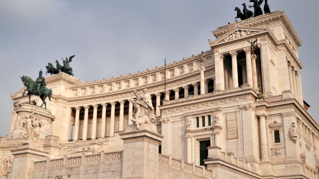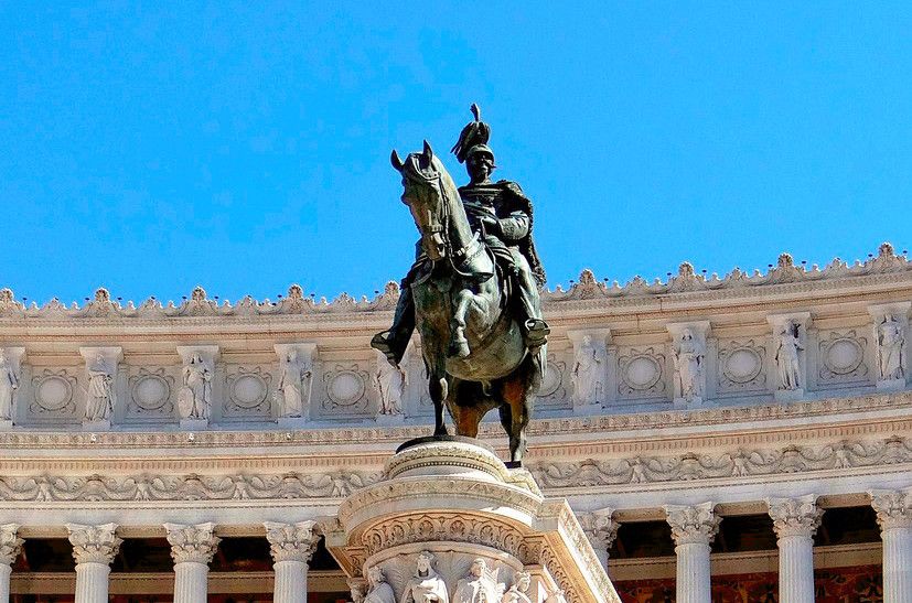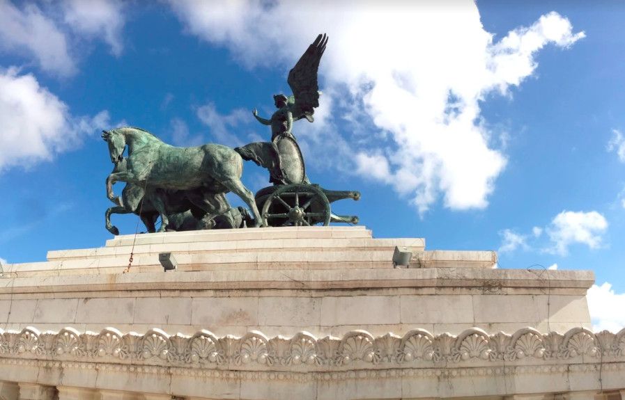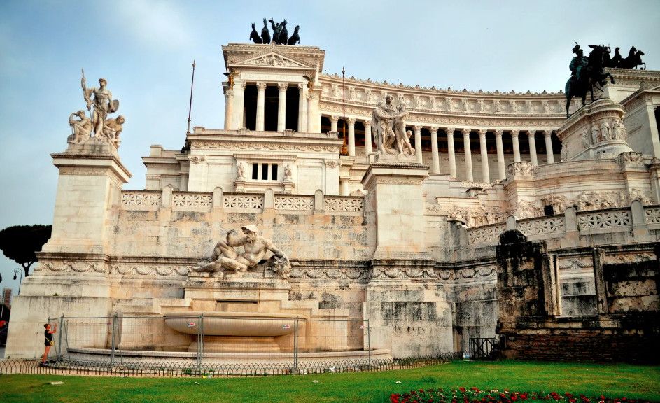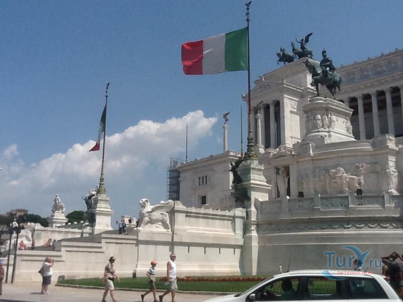 Белоснежный монументальный и помпезный АЛТАРЬ ОТЕЧЕСТВА на площади Венеции. Алтарь Отечества, он же - монумент объединителю Италии королю Виктору Эммануилу II. Во внутренних помещениях Алтаря находятся Музей Рисорджименто и Священная коллекция знамен. Алтарь служит прекрасным центральным ориентиром и маяком для туристов. Он важен хотя бы для того, чтобы понять, где они в данный момент находятся. В Алтарь Отечества можно войти внутрь и подняться на обзорную площадку. Сейчас туда ведет модерновый, в стеклянной трубе, лифт. Оттуда можно полюбоваться на бесконечность крыш Великого города, прорубленные проспекты, купола, башни, развалины.