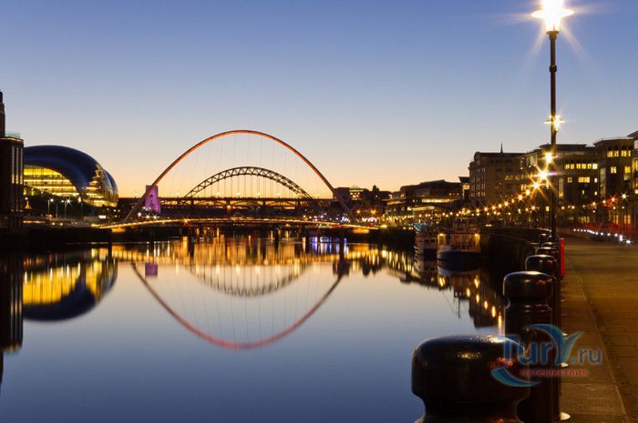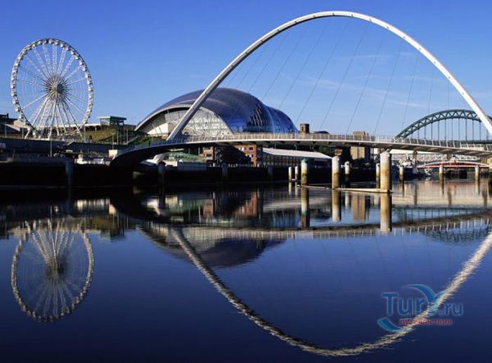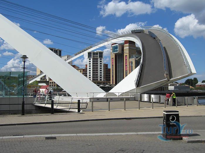 Гейтсхед Миллениум Бридж – первый наклоняемый мост в мире, расположен на реке Тайн, в Гейтсхеде, Англия. Это весьма необычный пример современного мостостроения. Авторство этого проекта принадлежит двум архитекторам Уилкинсону и Эйру. В 1996 году они выиграли большой конкурс, который организовывал городской совет Гейтсхеда. Основная задача, которая ставилась перед архитекторами – построить пешеходный и велосипедный мост, который не будет мешать проходящим по реке Тайн судам. Они создали проект оригинального, наклоняемого моста. Бюджет строительства составил 40 миллионов долларов, а на его строительство ушло более двух лет. Торжественное открытие состоялось в сентябре 2001 года. В день открытия на реке Тайн вокруг моста собралось более 35 тысяч человек. Основой моста являются две стальные арки соединённые тросами. Одна из них находится под углом, поднимаясь над водой на расстоянии 50 метров, а вторая арка является пешеходной и велосипедной частью моста. В таком положении под мостом могут проходить небольшие суда. Для того, чтобы могли проходить большие суда в действие вступает гидравлическая часть, которая управляется восьмью мощными электромоторами. Это позволяет поднимать обе части моста на 40 градусов вокруг основной оси. Во время поворотов моста вокруг него собирается множество зрителей и туристов. Внешне мост напоминает челюсти огромного кита, который внезапно вынырнул из реки, а во время поворота он похож на «подмигивающий глаз». Такое моргание можно увидеть на Тайне около 200 раз в году. Гейтсхедский Миллениум Бридж является одной из основных достопримечательностей в Гейтсхеде.