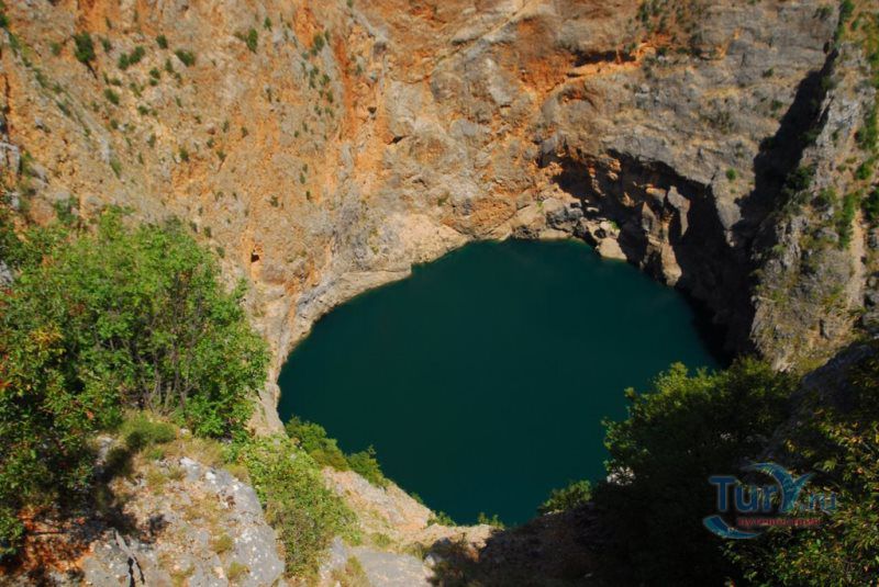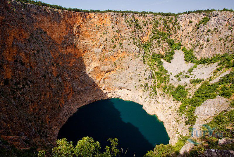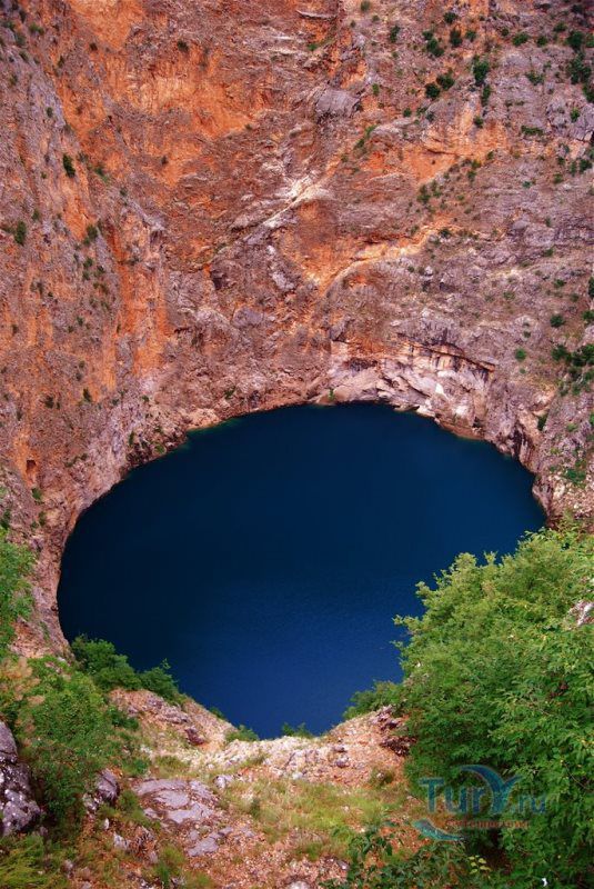 Красное озеро находится недалеко от города Имотски, на востоке Средней Далмации. Это одно из двух Имотских озер карстового происхождения, другое - Голубое озеро - расположено в 1,5 километрах отсюда. Красное озеро почти в три раза меньше по площади, чем Голубое. Глубина воронки составляет 528 метров, ширина - 281 метров. Спуститься к воде невозможно, зато на краю оборудована смотровая площадка. Озеро окружено отвесными скалами, с их красно-коричневым цветом и связано название озера. Красное озеро известно своими крутыми скалистыми берегами, некоторые из которых достигают высоты свыше 241 метра над уровнем воды и многочисленными пещерами. Вода в озере питается подземными источниками, но в этом озере, в отличии от Голубого, есть жизнь - здесь обитает эндемичная рыба.