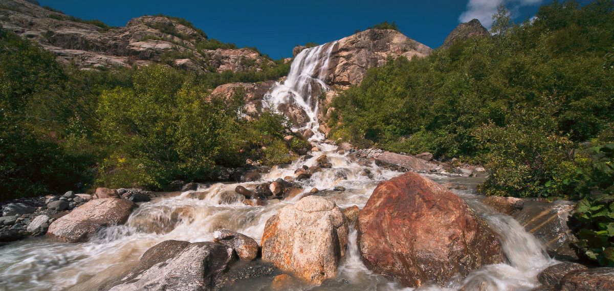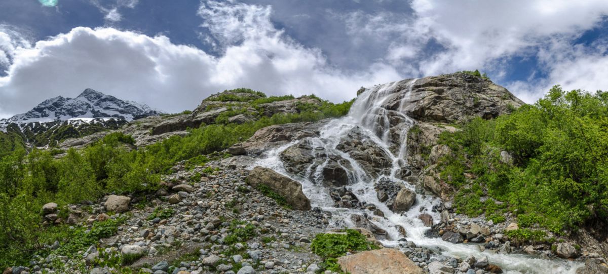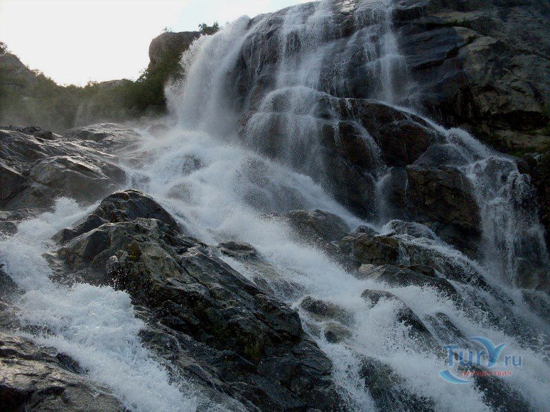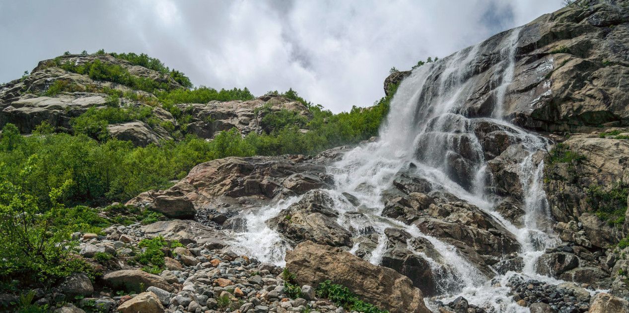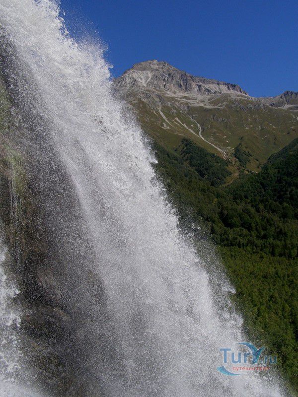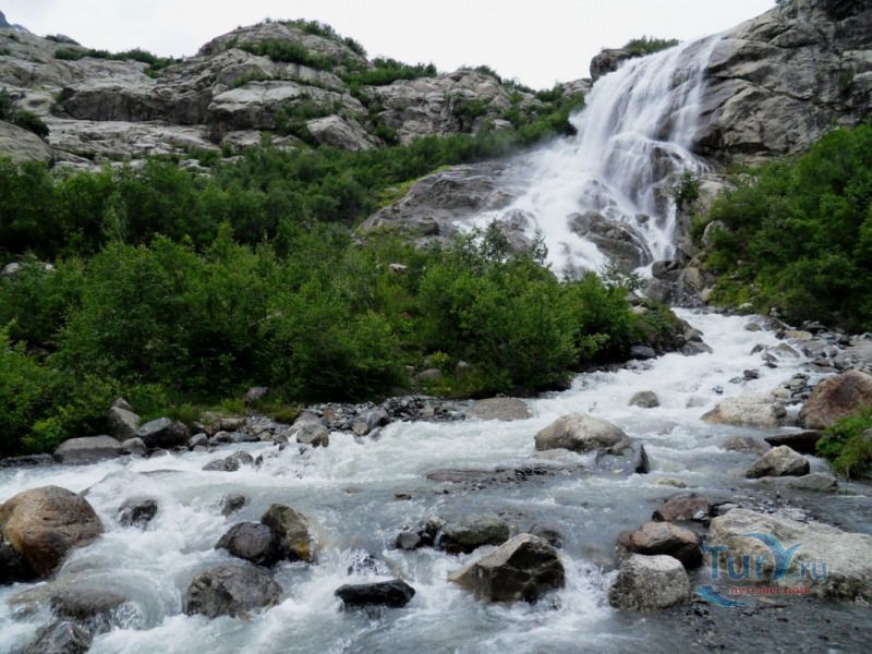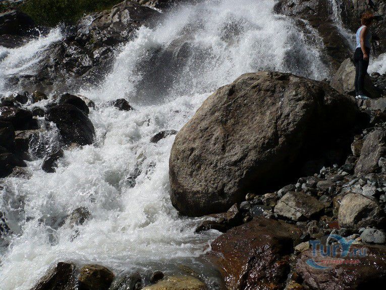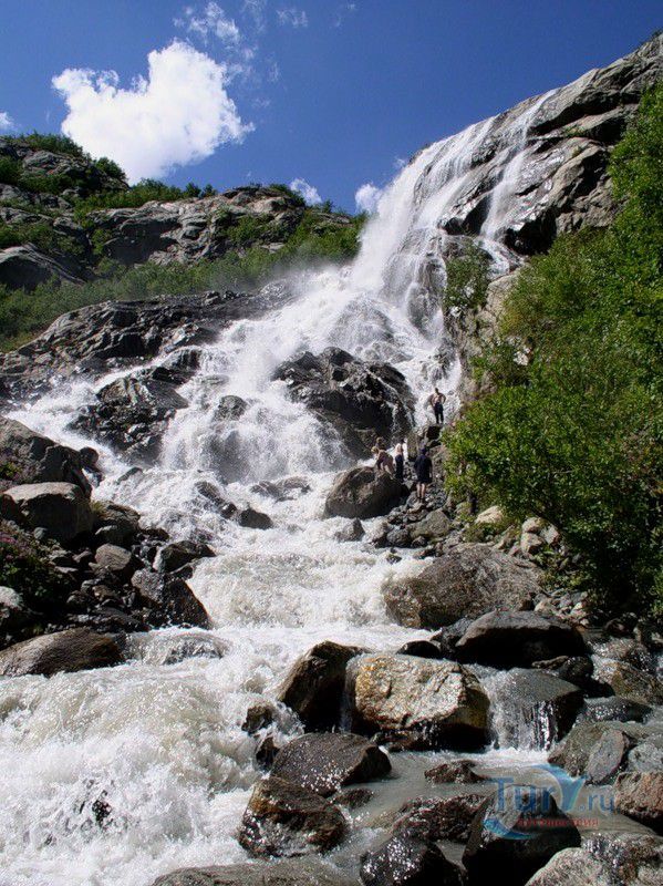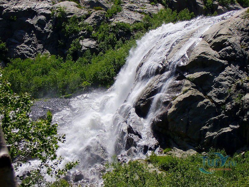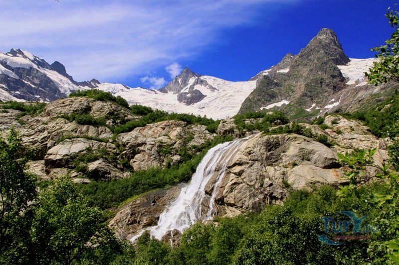 Алибекский водопад - это один из самых больших и эффектных водопадов в Домбае и Карачаево-Черкесии. Этот популярный объект пешеходного туризма находится на территории Тебердинского заповедника. Маршрут к водопаду сравнительно легкий, поэтому подойдет даже для неподготовленного туриста. Первая часть пути проходит по грунтовой дороге до альплагеря "Алибек", ее можно преодолеть на машине. Оставшаяся часть пути проходит по горной тропе, через альпийские луга, затем через березовое криволесье. С полян открывается панорама на окрестные вершины - слева от дороги возвышается красавица гора Белалакая, Пик Кап, с живописным водопадом на склоне; справа - массив вершины Семенов-Баши; впереди вершины Сулахат, Джаловчат и Пик Квадратный. На последней поляне Узун-Тала, перед тропой к водопаду, открывается великолепный вид на вечные снега вершин Главного Кавказского Хребта - Эрцог, Джаловчат, Пик Алибекский. В конце поляны тропа разветвляется на две: прямо идет дорога к Турьему озеру, налево, в березовое криволесье, уходит тропа к водопаду. Сначала слышится гул от падающей воды, а затем, сквозь листву показывается и сам водопад. Он очень мощный и шумный, его еще называют "грозным" из-за большого грохота ниспадающей воды с высоты 25 метров. Водопад образуется падением речки Джаловчатки с Алибекского ледника. В 1930-е годы его еще не было, а скальчатый уступ был накрыт языком Алибекского ледника. Ледник каждый год отступает вверх на метр-полтора, камни, с которых падает вода, называют "бараньими лбами".