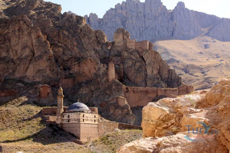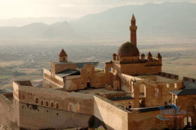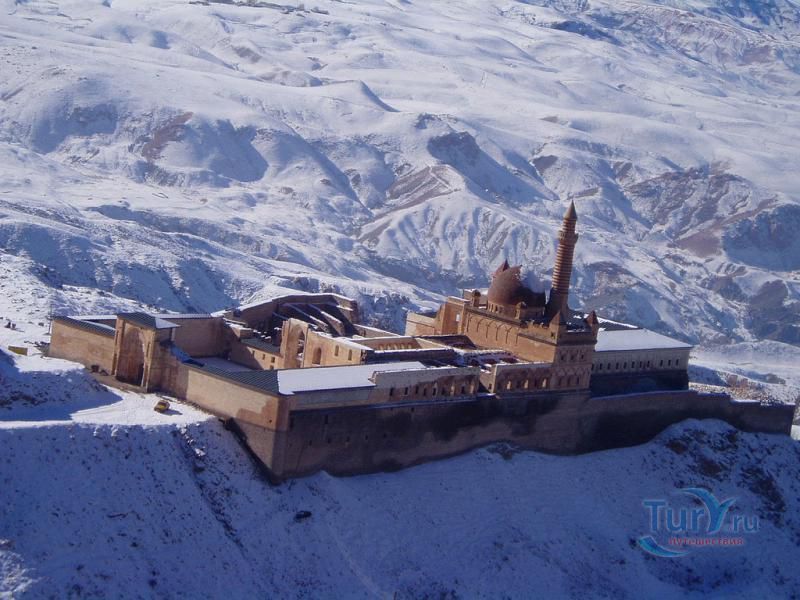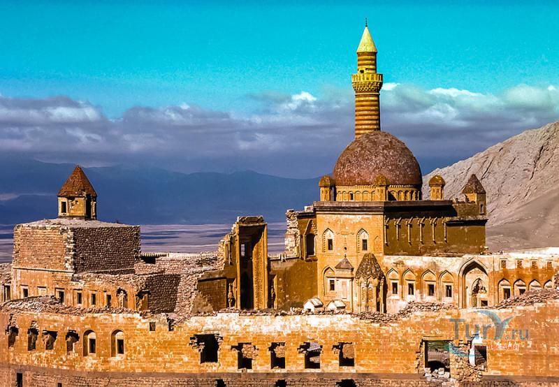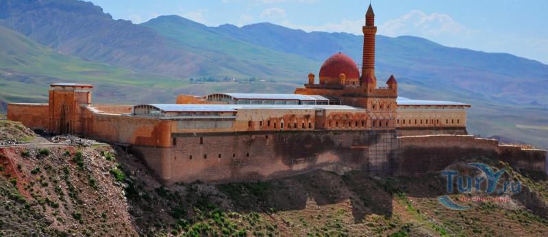 Дворец Исхак Паши является одним из наиболее масштабных и красивейших – немногие достопримечательности Турции могут похвастаться такой грандиозностью строения. Дворец был построен в последнем периоде Османской империи, уже после дворца Топкапы и является последним памятником ренессанса империи. Этот грандиозный дворец увлекает своей мощью и красотой. Его ценность состоит в том, что он представляет собой жемчужину тюркского архитектурного дела и конечно является дорогим произведением искусства. Расположен дворец на скалистой земле, которая близко расположена к равнине. Дворец Исхак Паши включает в себя множество архитектурных сооружений. Это фасад, дворы, гостиная, мечеть, кухня, бани, гарем, залы церемоний, арки, кладовые боеприпасов и продуктов, мавзолей, пекарня и подземелье. Немногие музеи Москвы могут похвастаться таким богатством экспонатов. Строительство дворца было начато в 1685 году и было закончено только в 1784 году. Занимает он площадь размером 115 на 50 метров. Архитектура дворца отражает черты, свойственные османской, сельджукской и персидской эпохам. Приезжающим туристам следует знать, что дворец представляет два двора, в которых находятся вспомогательные помещения. К сожалению, помещения, которые находятся на первом этаже, полуразрушены в настоящее время. А вот второй двор сохранился лучше и там все помещения представляют собой квадратную форму. Если заходить во дворец справа – то будет мужская половина, а за ним идет женская половина. Мечеть и мавзолей находятся в самом конце двора. Дворец Исхак Паши делится на два этажа, которые включают в себя 356 комнаты. В каждой комнате присутствуют камины из камня, в древние времена все комнаты отапливались центральной отопительной системой. Именно этим и прославился, стоящий рядом, город Дооубаязыт. Интересно, что самая первая система центрального отопления была установлена впервые в мире в этом городе. Мавзолей дворца построен тоже из камня, состоит из двух этажей и представляет собой архитектуру сельджуков. В мавзолее покоятся Чолак Абдул Паши, Исхак Паши и их родственники. В настоящее время дворец Исхак Паши является одним из популярных туристических комплексов. Туристы приезжают не только ради архитектурных сооружений. Здесь также очень красивые лесистые предгорья, красивейшие долины и горные пейзажи.