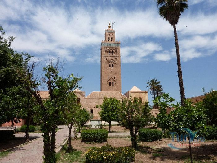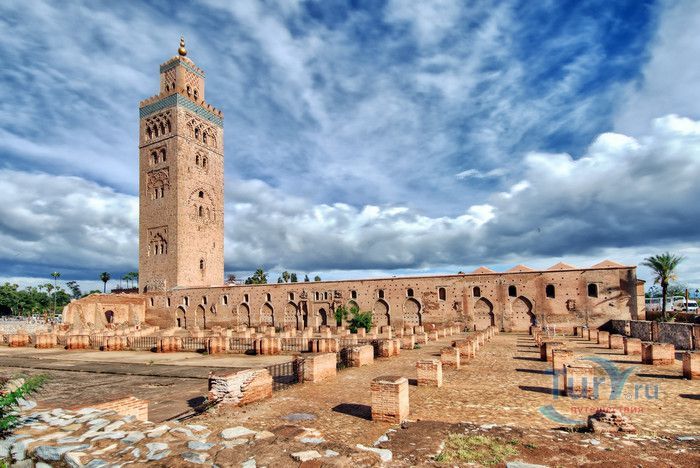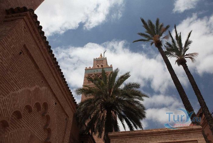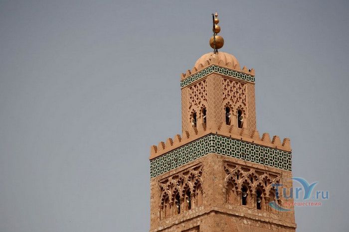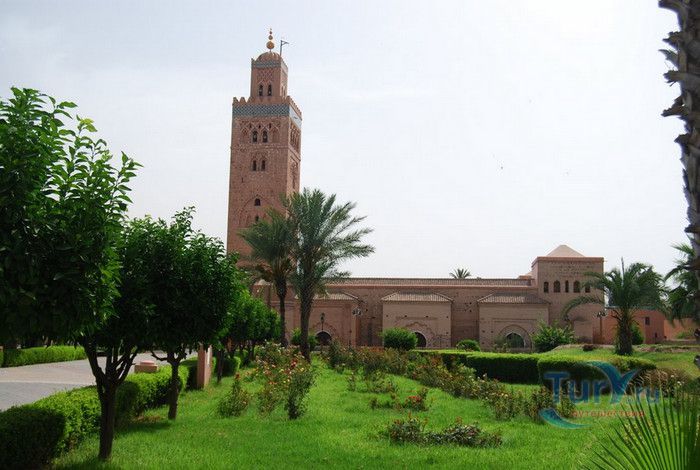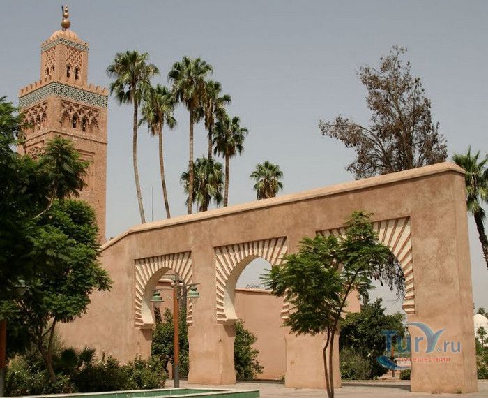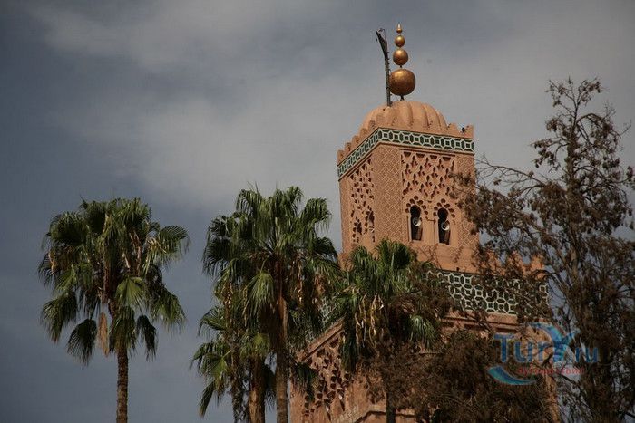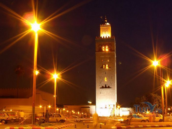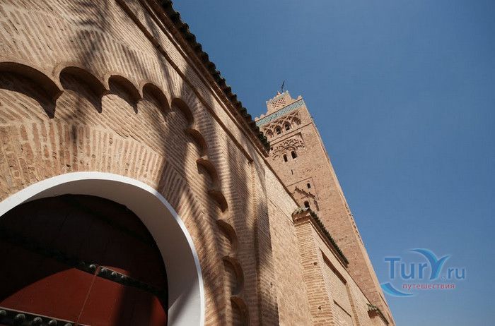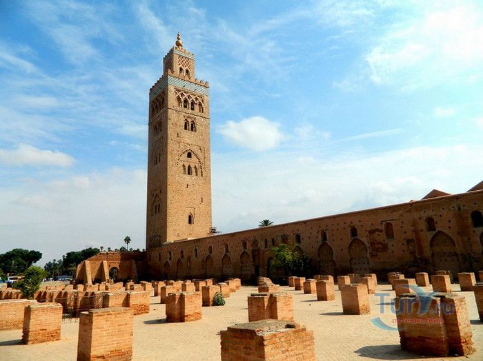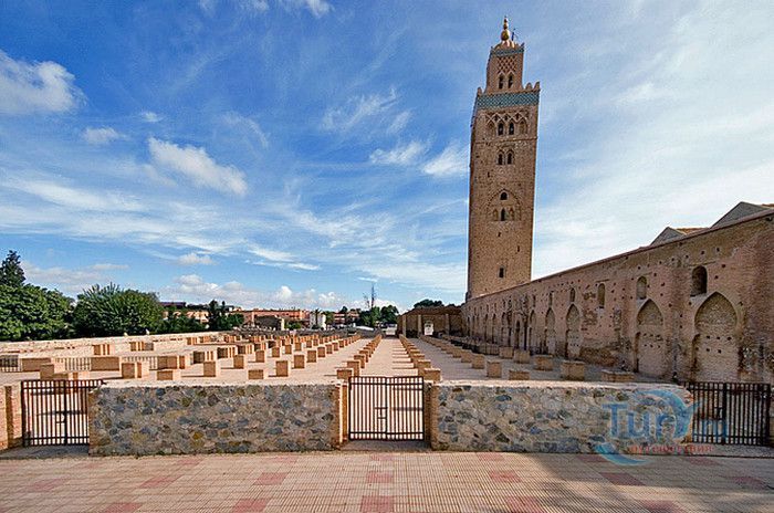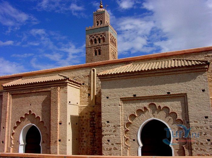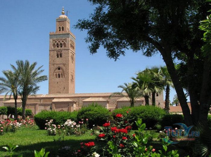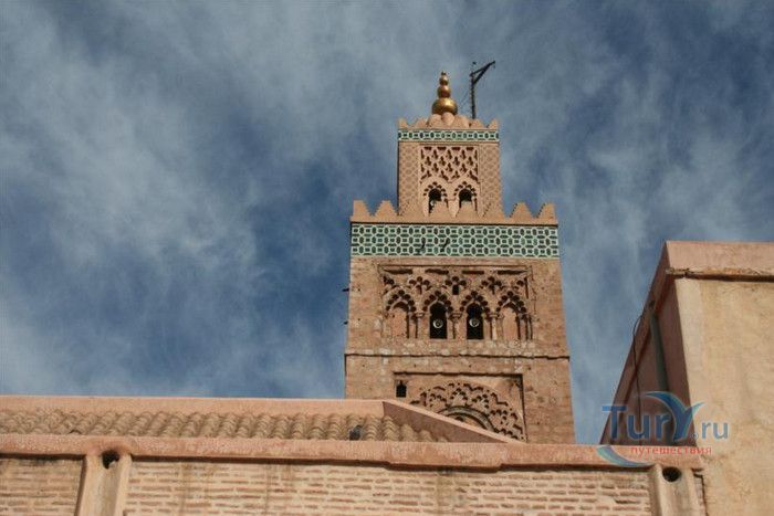 Мечеть Кутубия расположена в Марокко, в городе Марракеш, в юго-западной части Старого города (медины). Строительство мечети, ставшей главной святыней и символом города Марракеш, было начато в 1120 году, во время правления династии Альморавидов, завершено в 1196 году, при Якубе аль Мансуре из династии Альмохадов. Мечеть Кутубия построена из красного камня и сланцевого песчаника, который добывали в карьерах Джебель-Гелиз. Фасад здания украшают ажурные арки и декоративный орнамент. Минарет, высотой 77 метров, построен в виде башни, которую венчает купол со шпилем, состоящим из четырёх медных шаров. Существует легенда, что изначально шаров было всего три, и они были отлиты из чистого золота. Четвёртый шар был изготовлен позднее, из золотых украшений жены Якуба аль Мансура, которая, в наказание за несоблюдение поста во время Рамадана, отдала свои драгоценности на переплавку и подарила отлитый из них шар мечети Кутубия. Стены минарета украшает резьба и ажурный орнамент, четвёртый и пятый уровни башни оформлены ступенчатыми зубцами. Внутренняя часть минарета состоит из шести помещений, расположенных один над другим. Широкий пандус, построенный внутри башни, позволял муэдзину въезжать на балкон, не сходя с коня. Молитвенный зал, способный одновременно вместить около 20000 молящихся, имеет Т-образную форму. Более 100 колонн поддерживают подковообразные арки, расположенные вдоль шестнадцати боковых и центрального нефов. Минбар (в католических храмах - кафедра) выполнен из сандалового и чёрного дерева, украшен инкрустацией из серебра и слоновой кости. В центре открытого внутреннего двора, который служит местом для намаза, установлен фонтан для омовений. Вход в мечеть Кутубия не мусульманам запрещён. Иностранные туристы могут прогуляться по пышному саду, расположенному рядом с мечетью, из каждого уголка которого открывается красивый вид на мечеть и минарет Кутубия.