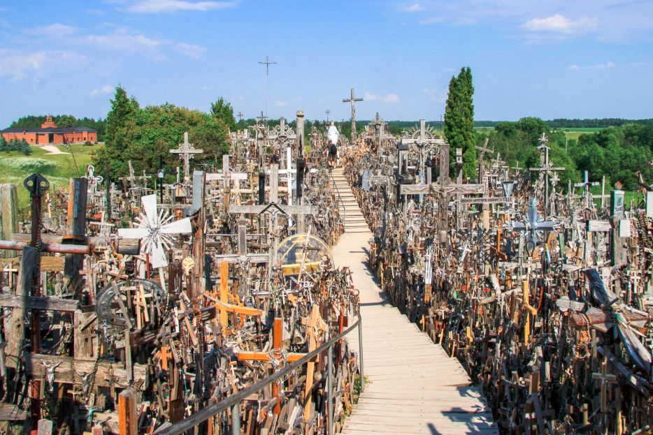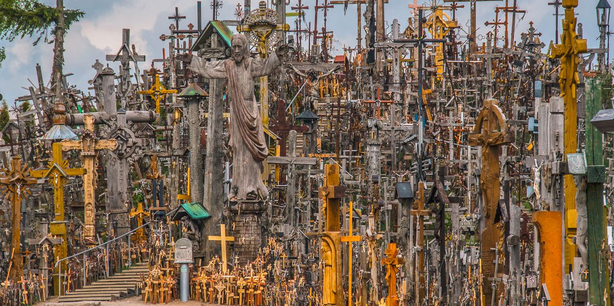 Существует в Литве место, которое является святым для всех ее жителей. Правда, не только для литовцев. Располагается Гора Крестов возле города Шауляй. В этом месте, которое посещают паломники из разных стран, люди надеются приблизиться к Богу. В наше время никто точно не знает, когда возник обычай ставить кресты на холме под названием Юргайчу. История холма, а также с ним связанных обычаев, столь же древняя, как и история страны. С горой связано множество легенд, у ее подножия часто происходили беспощадные сражения. Считается, что в языческие времена здесь находилось капище, но этому месту продолжали поклонятся и католики. В XIV веке на горе размещалось городище, которое было разрушено рыцарями Ливонского ордена. Новая история горы начинается с 1831 г., когда на ней были поставлены кресты в память об участниках бунта, казненных властями Российской империи. Большое количество крестов появилось после усмирения мятежа в 1863 г. Жители Литвы, отдавая дань памяти о своих земляках, как будто проявляли безмолвный протест властям. Шло время, количество крестов все возрастало. Кресты Юргайчу – символ Любви, Надежды и Веры. Они устанавливались в знак благодарности Богу и молитвенной просьбы о здоровье, защите и поддержке в трудную минуту. В советские времена с 1964 по 1984 были предприняты четыре попытки расчистить место поклонения, но кресты устанавливались опять. Сейчас на Горе Крестов находится около 50 тыс. распятий. Некоторые кресты, высотой в несколько метров, увешаны маленькими крестиками. Также тут находится крест Папы Римского — Иоанна Павла II, который в 1993 г. был с официальным визитом в Литве и оставил на этом холме крест, благословив отсюда страну. На горе можно увидеть и православные кресты, и символы других конфессий — звезду Давида, исламский полумесяц. Гора Крестов встречает всех верующих, которые приходят сюда, чтобы обратиться к Богу.