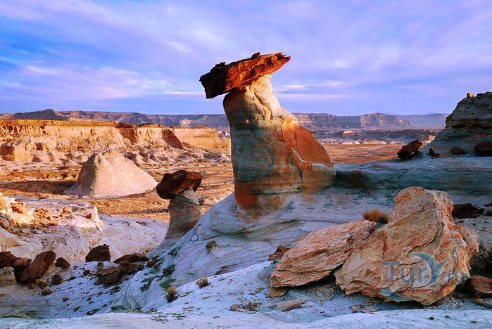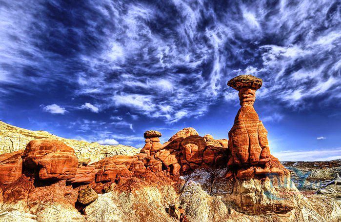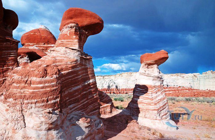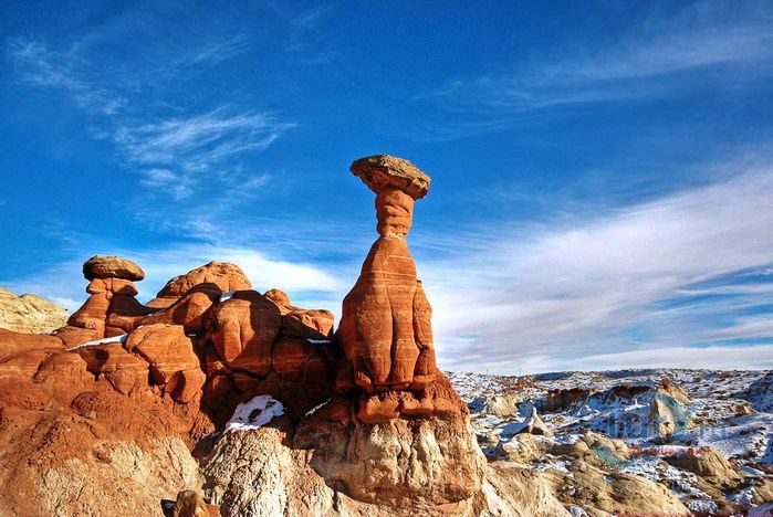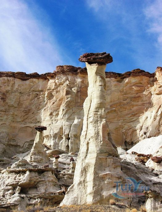 Грибообразные скалы или каменные грибы — это удивительные естественные образования, над которыми природа трудилась многие миллионы лет. Из-за того, что диаметр основания скал меньше диаметра верхней их части, они действительно похожи на грибы. Наиболее часто грибообразные скалы встречаются на американском Юго-Западе. Каменные грибы — это выветренные скалы. Они состоят из легко разрушаемых пород в основании скалы и более устойчивых пород вверху. Выделяют еще несколько причин образования грибообразных скал: из-за более резких колебаний температуры в приземном слое воздуха, что вызывает быстрое разрушение нижней части; под влиянием морозного выветривания при наличии снега; в результате сильного разъедания внизу соляными растворами, поднимающимися из грунта. Тысячелетиями песок, гонимый ветром близко к поверхности земли, действовал как наждачная бумага и подтачивал основания скал. Некоторые грибообразные скалы состоят из 2-х разных пород, одна из которых лежит наверху другой. Это могло образоваться в результате камнепада или землетрясения: Удивительное зрелище: камни разных форм и размеров балансируют на белоснежных колоннах, напоминая своими очертаниями гигантские грибы или закутанных в плащи пилигримов: Больше всего «каменных грибов» встречается на Юго-Западе США.