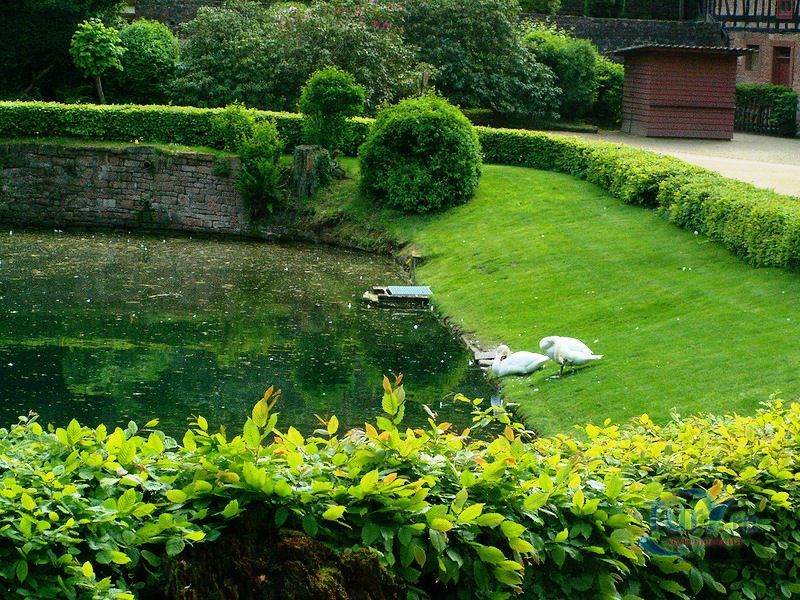 Рядом с замком бьет источник (кстати, и давший название замку), поэтому вода вокруг дворца проточная. Убедиться в этом не трудно: если внимательно вглядеться в темную воду, то будут видны большие косяки крупной, упитанной форели, которая, как известно, живет только в чистой проточной воде. Сейчас замок окружает небольшой парк. От ворот парка можно прогуляться по поднимающейся вверх пешеходной тропе, которая ведет к живописно стоящей на склоне горы фамильной усыпальнице владельцев замка. Часовня, расположенная в северо-западном углу замка, была построена рыцарем Хаманн Эхтером (Hamann Echter), который также установил ферму для викария, чтобы жить на ней. До недавнего времени викарий жил в замке Меспелбрунн и служил Святую Мессу каждый день.