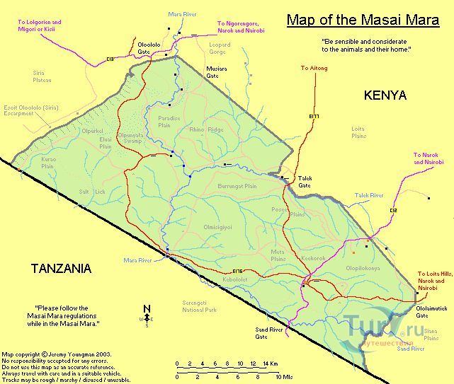 Национальный парк Масаи Мара - это северная (кенийская) часть равнины Серенгети площадью в 1510 кв. км, расположенная на высоте 1650 м. Название заповедника происходит от слова "мaрa", на языке масаев обозначающего "пестрый", о чем и свидетельствует редкая растительность парка, если смотреть на нее с воздуха. Ландшафт парка представляют собой предгорья на севере и востоке, леса и, безусловно, африканскую саванну. По территории парка протекают две реки: Мара и Талек, вдоль которых растут акациевые леса.