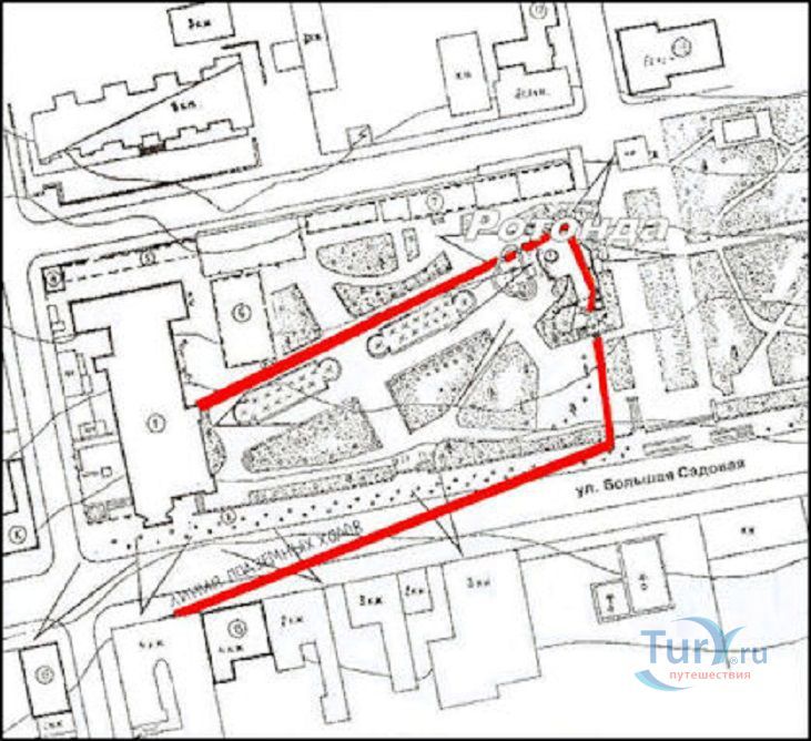 В 1855 г. пустующий участок разрушенной крепости был выкуплен Летним Коммерческим Клубом. Когда члены правления Коммерческого клуба приобретали этот участок, они знали, что тут был крепостной редут и, конечно, предполагали, что там есть подземные сооружения. Ведь известно, что редут – это насыпное сооружение, на котором стоят пушки. Пушкам необходимы порох и ядра, поэтому всегда неподалёку от них располагались подземные казематированные помещения, склады пороха и ядер. И склад был соединён с редутом подземной галереей, по которой к пушкам подносили боеприпасы. По проекту Петербургского архитектора Петерса на этом месте разбили сад. При разбивке сада строители обнаружили подземные ходы и казематные помещения крепости Святого Димитрия Ростовского. Петерс так рассчитал планировку сада, чтобы тяжёлые строения не стояли на подземных сооружениях. Поэтому над двухъярусным казематированным помещением был устроен фонтан, а над подземными ходами – разбиты прогулочные садовые аллеи. Одна из них – главная аллея парка – диагонально пересекала сад от места, где ныне возвышается ротонда, и выходила к цветнику. Если внимательно посмотреть на современный план парка, то и сейчас хорошо просматривается, где проходят подземные ходы. Посадили аллею липовых деревьев, организовали садовые партеры, выстроили оранжерею, устроили спортивные площадки. В память о крепости на сохранившемся фрагменте редута Святого Александра Невского в 1901 г. возвели изящную ротонду в неоклассическом стиле с шестью колоннами по проекту архитектора Н.А.Дорошенко. Он заложил в её проект высокий цокольный этаж, который включил в себя подземные помещения, оставшиеся от крепости. И ныне под ротондой расположено двухэтажное подземное строение, уходящее вглубь земли под цокольным этажом, расположенным в небольшом холме. При строительстве цокольного этажа ротонды был использован старинный крепостной кирпич. В 1912-13 годах по проекту архитектора Г. Я. Гелата в юго-западной части сада было возведено капитальное трёхэтажное кирпичное здание Летнего Коммерческого клуба в стиле модерн. Фасадом строение выходило на партер сада с клумбами. А из его окон открывался прекрасный вид на ротонду с голубым фонтаном. Подземный ход шёл в подвал Летнего Коммерческого клуба. Долгое время из помещения Коммерческого клуба можно было спускаться в подземный ход, ведущий под ротонду, но в середине XX века при ремонте здания этот ход был замурован. Другой подземный ход шёл от фонтана в сторону Большой Садовой, пересекая её под углом, и далее проходил к жилому дому на Большой Садовой (в конце XIX века там находилась гостиница «Империал»), под нынешним зданием филармонии до переулка Крепостного, откуда тянулся до Богатяновского проспекта и далее до самого Богатого источника. По некоторым сведениям, подземных галерей в саду Коммерческого клуба было более чем две, но где они проходили – в настоящее время неизвестно.