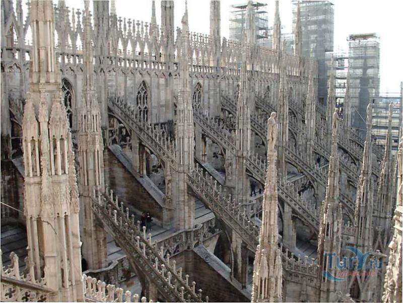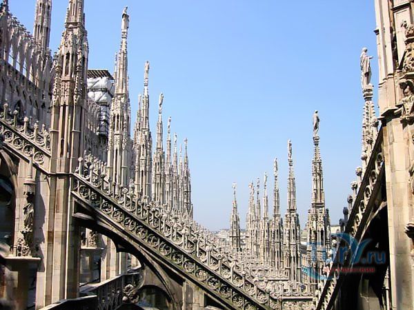 Крыша собора состоит из бесчисленного количества шпилей, похожих на гребень, старейший из которых был возведен еще в 1404 году. Стены Дуомо украшены более чем 3,5 тысячами скульптур святых, животных и диковинных чудовищ.