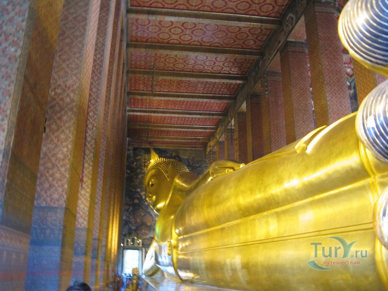 Гигантская статуя лежащего Будды, завершившего череду перерождений и находящегося в состоянии достижения Нирваны, занимает весь зал в длину и туристы обходят её по кругу. На стенах Храма картины с изображениями жизненных историй семи самых известных учеников Будды. Длина статуи – 45 метров, а высота – 15 метров. Сделана она из смеси гипса, песка и мелких ракушек и покрыта золотом. Ступни статуи 3 м. в длину инкрустированы пластинками перламутра по черному лаку. 108 рисунков на подошвах символизируют 108 особых знаков (качеств, истин), отличающих Просветленного. 108 - сакральное число в буддизме: сборник высказываний Будды, состоит из 108 томов; буддийские чётки имеют 108 бусин; 108 Простираний покаяния; 108 страстей.