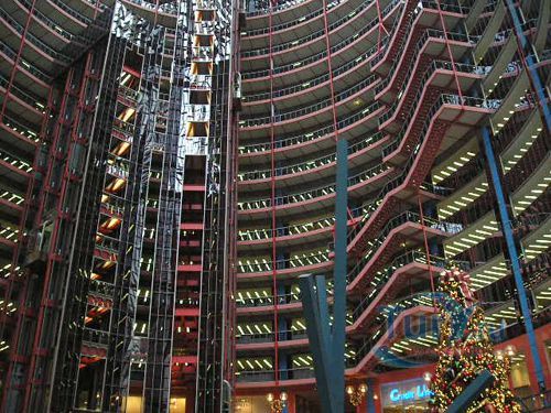 Первый этаж, он же единственный нестеклянный этаж, выполнен в темно-красных тонах, что серьезно контрастирует со стеклянно-алюминиевой шапкой верхних этажей. Не забудьте посетить лобби. отсюда можно осмотреть все 17 этажей центра, напоминающих отсюда разрезанный слоеный пирог.