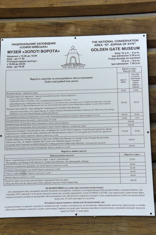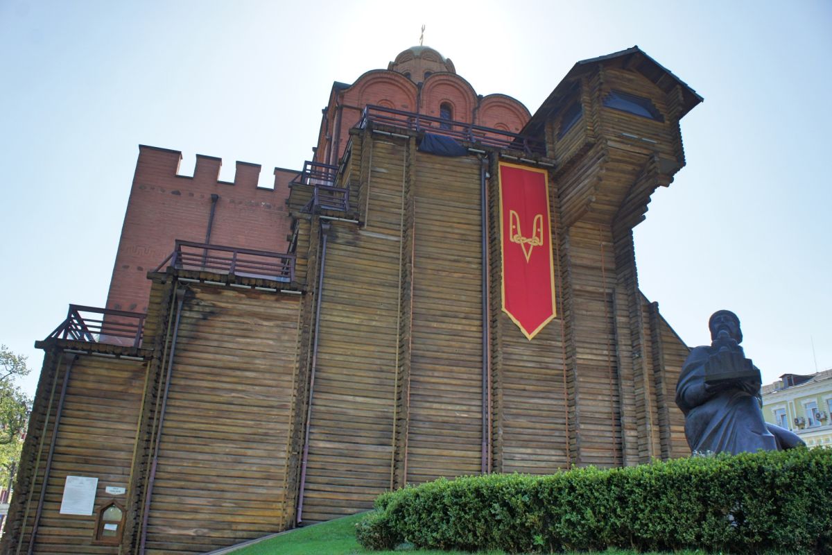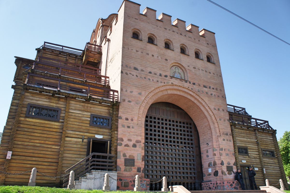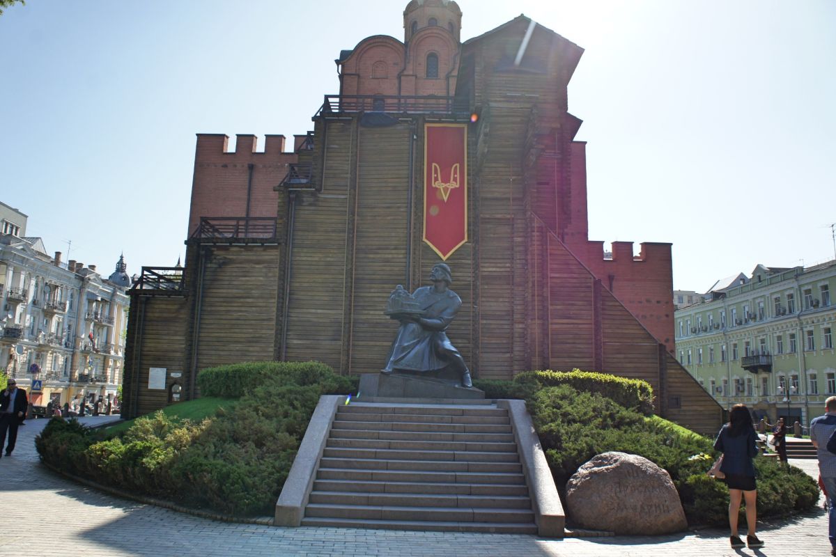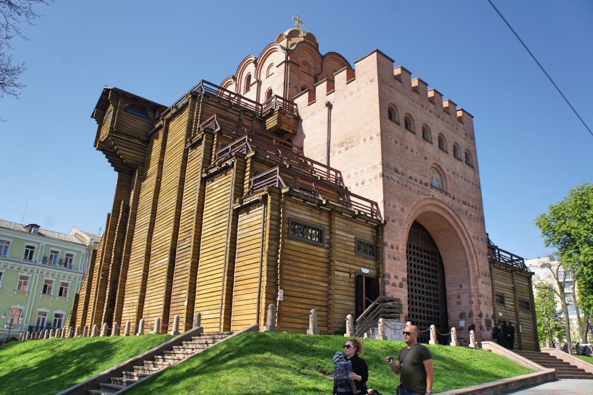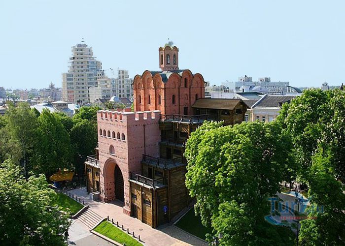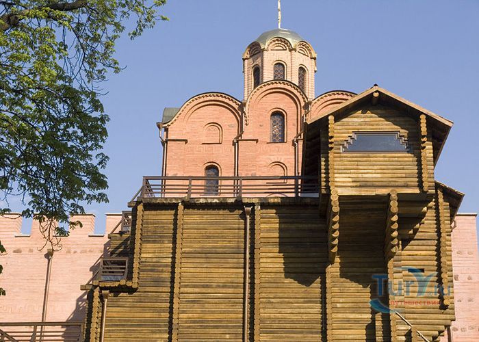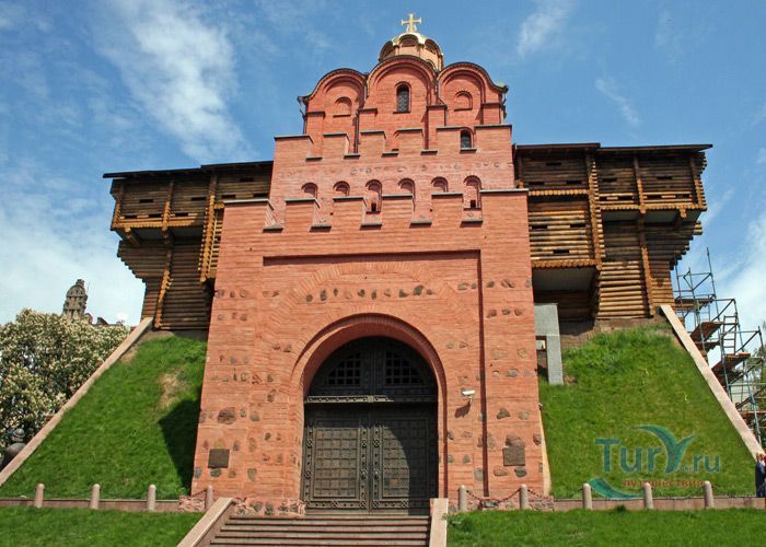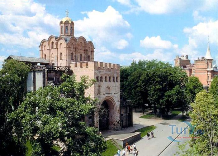 Золотые ворота - один из немногих памятников оборонного зодчества Киевской Руси, периода правления Ярослава Мудрого. Золотые ворота были главным въездом в Киев. Это удивительное творение древнерусских зодчих, мощная боевая башня с возвышавшейся над нею надвратной церковью Благовещения. Архитектурный стиль ворот совершенно не похож на подобные сооружения, возводимые архитекторами Европы. Европейские строения выполняли, как правило, исключительно заградительную функцию, представляя собой крепостные башни. Золотые ворота в Киеве, скорее, можно сравнить с триумфальными Золотыми воротами в Константинополе. В 1240 году ворота сильно пострадали во время осады и взятия города ордой Батыя. Вплоть до середины XVIII века они служили въездом в Киев. В 1648 году у Золотых ворот киевляне встречали героя национально-освободительной борьбы украинского народа Богдана Хмельницкого после победы под Желтыми Водами, а в 1654 году, ознаменованном воссоединением Украины с Россией, через Золотые ворота торжественно въехало в Киев русское посольство. Время не щадило памятник XI века, до наших дней со времен Ярослава Мудрого, сохранилась лишь небольшая часть Золотых ворот. В мае 1982 года, к празднованию 1500-летия Киева был открыт экспозиционный зал внутри отрезков вала, в котором можно увидеть сохранившуюся древнюю кладку крепостных укреплений, там же находится и лестница, по которой можно подняться вверх, чтобы полюбоваться видом на современный Киев.