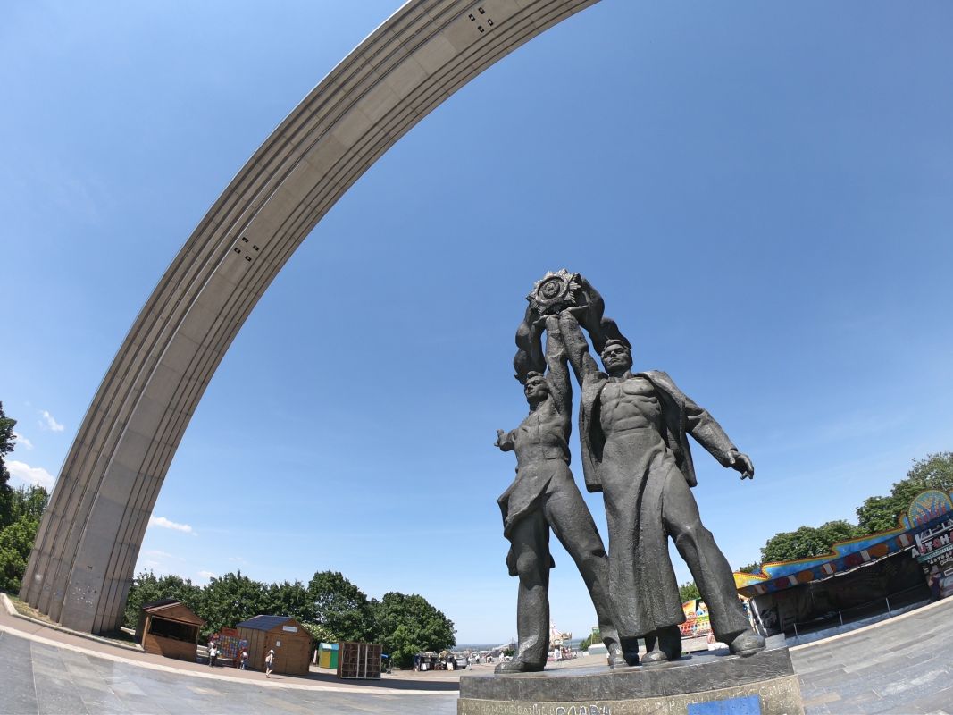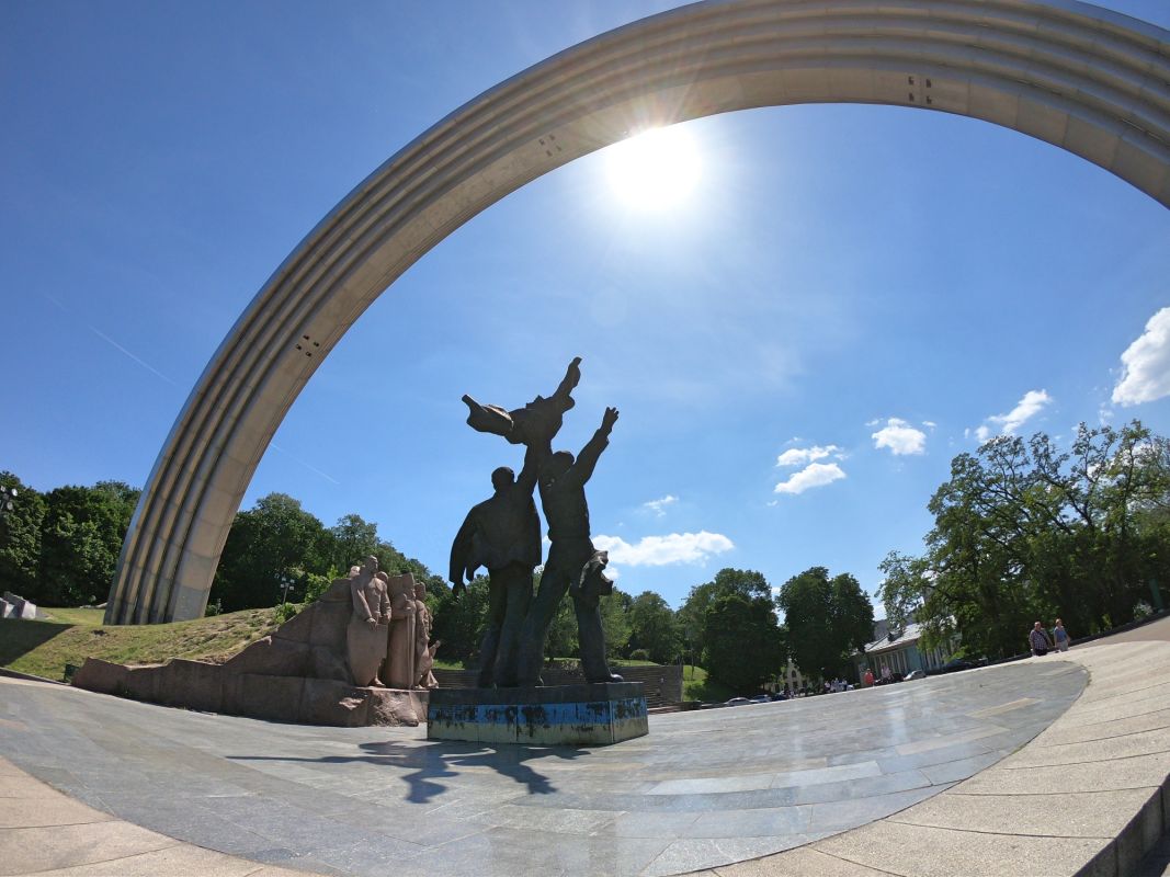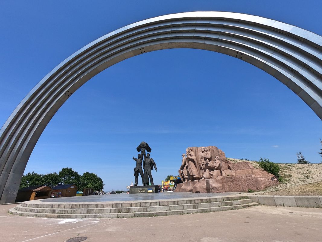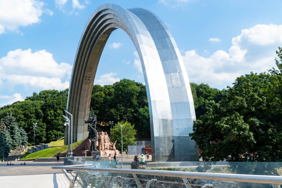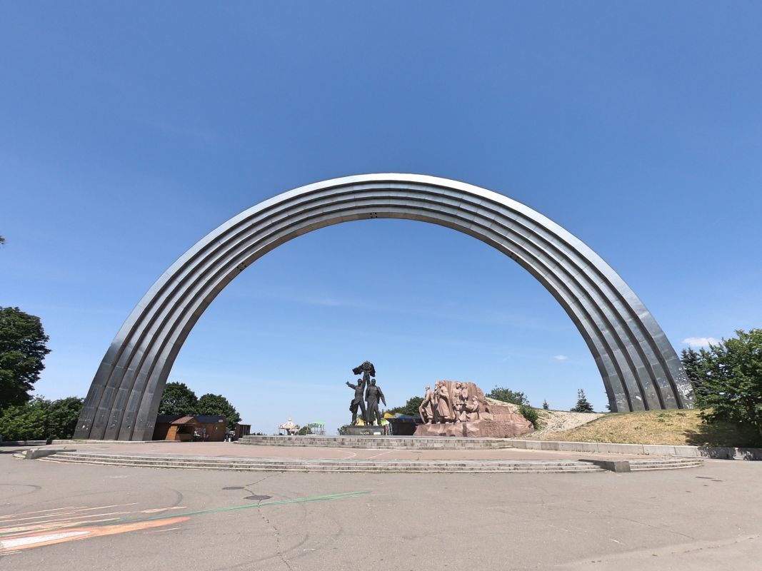 Арка Дружбы Народов расположена в центре Киева, в Хрещатом парке. Монумент, работа над которым велась четыре года, появился в 1982 г. в ходе подготовки к празднованию 1500-летия Киева, посвящен воссоединению Украины с Россией. Скульптурная композиция состоит из трёх элементов: самой арки в виде громадной радуги, бронзовой скульптуры двух трудящихся, держащих в руках советский орден Дружбы народов, и сцены Переяславской рады. В центре композиции - статуя Богдана Хмельницкого и боярина Василия Бутурлина, русского посла. В результате Переяславской рады был подписан исторический договор об объединении Украины с Россией. За монументом расположена смотровая площадка, с которой открываются великолепные виды на Днепр и Левый берег.