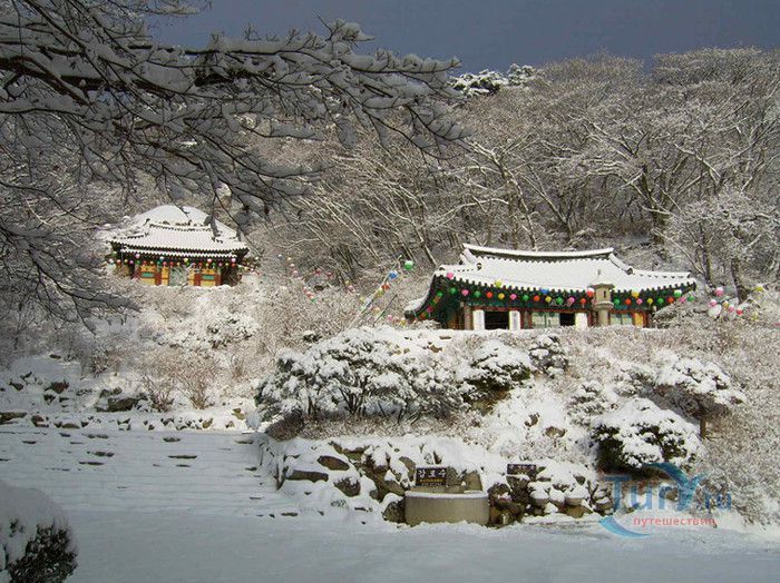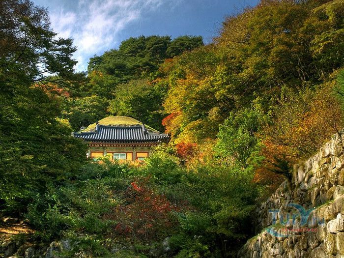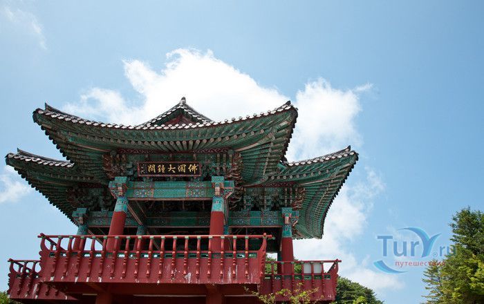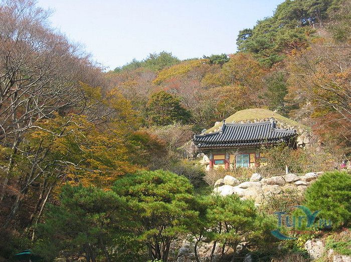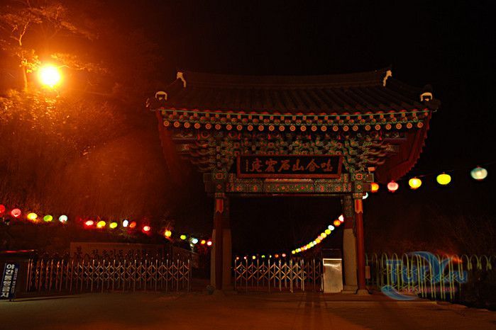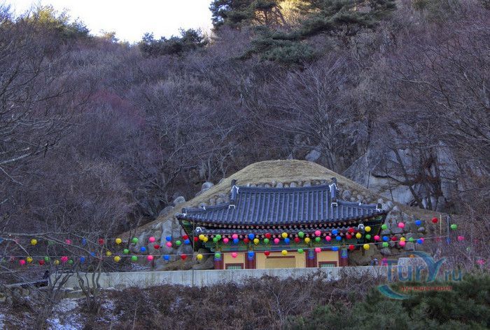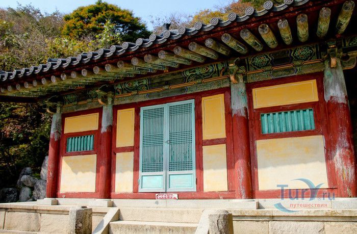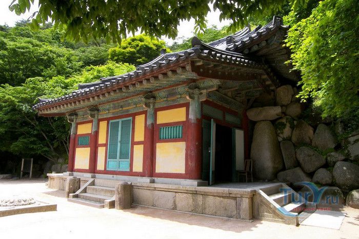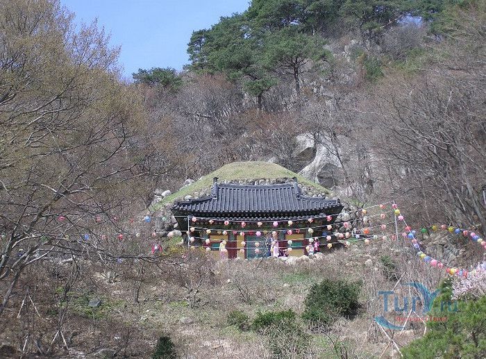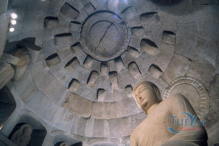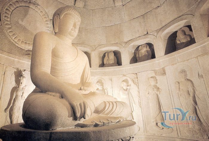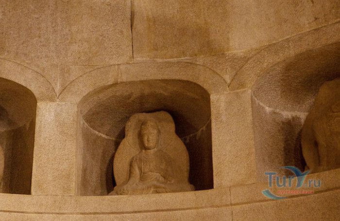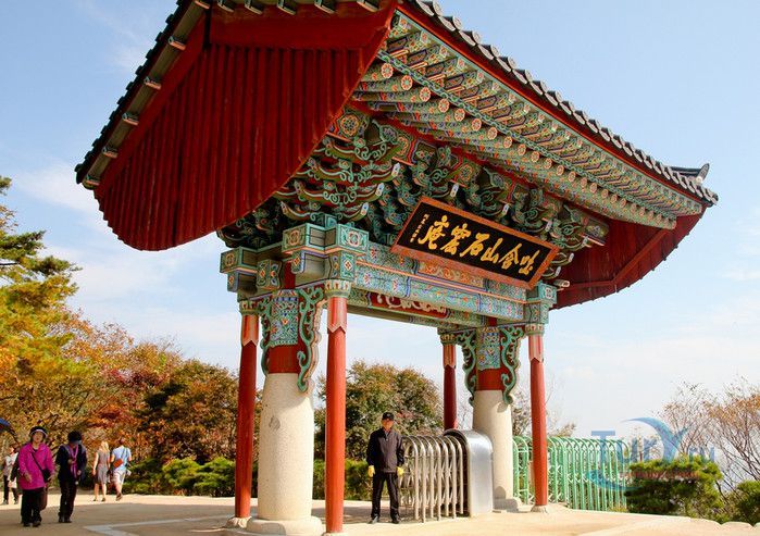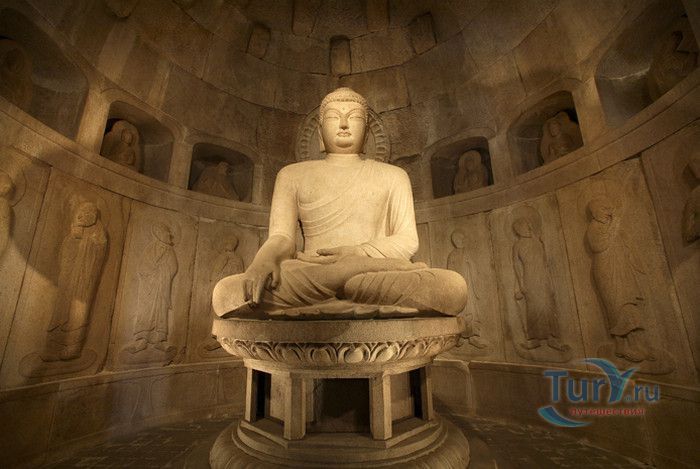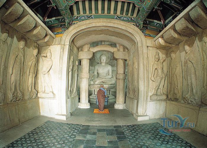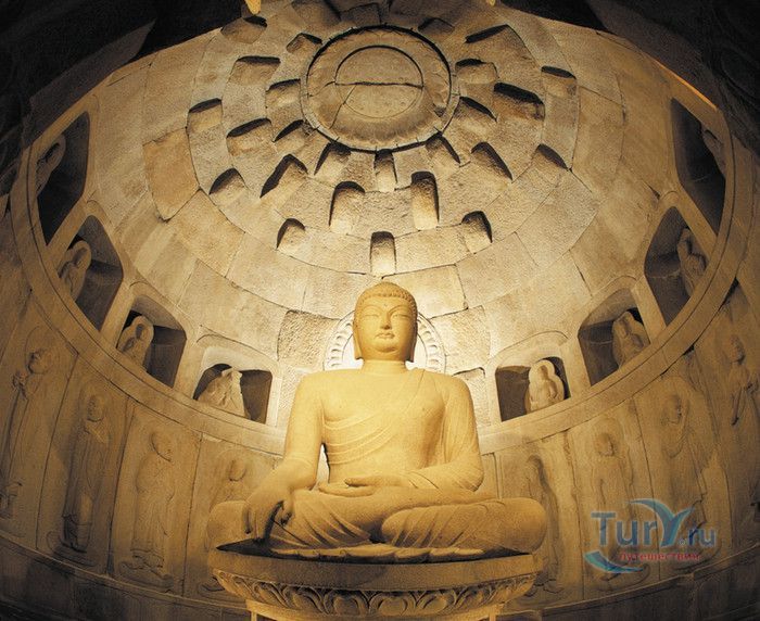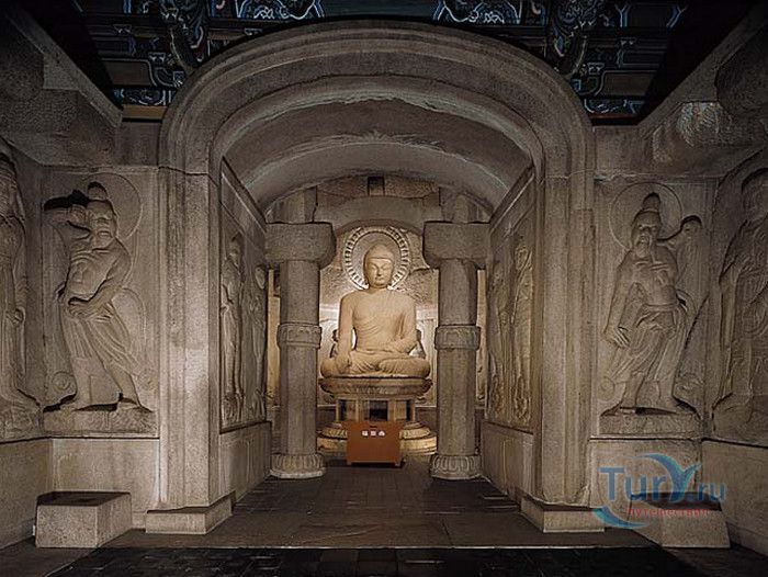 Грот Соккурам - рукотворный буддийский пещерный храм, часть храмового комплекса Пульгукса и одна из самых известных достопримечательностей Южной Кореи. Храм расположен на территории Национального парка Кёнджу, на восточном склоне горы Тохамсан, на высоте 750 метров над уровнем моря. Его возведение было начато по инициативе Ким Дэ Сона, премьер-министра государства Силла во время правления короля Гёндоке. Строительство храма, который изначально носил название Сокпульса (Храм каменного Будды), было начато в 751 году, завершено в 774 году, уже после смерти его основателя. Грот был задуман как дополнение к храму Пульгукса и символизировал путешествие души в Нирвану. Пещерный храм построен из гранита, состоит из арочный входа, который ведёт в небольшой квадратный аванзал, длинного коридора, украшенного барельефами, и главного купольного зала в форме ротонды. Для строительства куполообразного потолка центрального зала и коридора были использованы 360 каменных плит. В центре зала установлена 3,5-метровая статуя Будды Шакьямуни, сидящего на полутораметровом пьедестале в форме цветка лотоса. Стены храма украшены барельефами и статуями бодхисаттв, архатов, хранителей четырёх сторон света, хранителей врат, небесных воевод и индуистских богов. Куполообразный потолок оформлен полумесяцами и цветами лотоса. Долгие годы забвения и высокая влажность нанесли большой урон храму. Первые попытки реконструировать святилище были предприняты в 1703 и 1758 годах, во время правления династии Чосон. Масштабная реконструкция грота Соккурам была проведена лишь в 60-х годах XX столетия, в ходе которой минимизировано разрушающее воздействие влаги, а статуя Будды ограждена стеклянной перегородкой. Пещерный храм Соккурам - одно из самых красивых буддийских святилищ Будды в мире, религиозный и архитектурный памятник государства Силла, Национальное сокровище Южной Кореи № 24, в 1995 году внесен в список Всемирного наследия ЮНЕСКО.