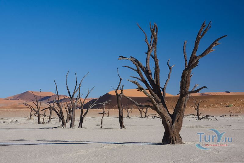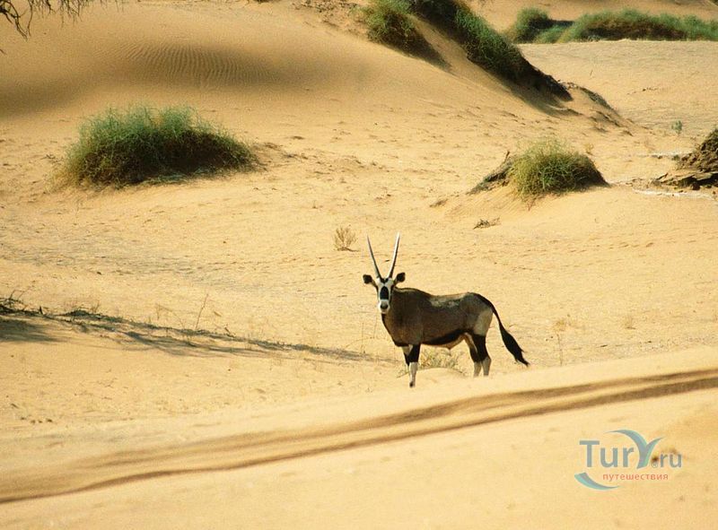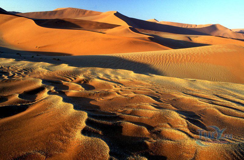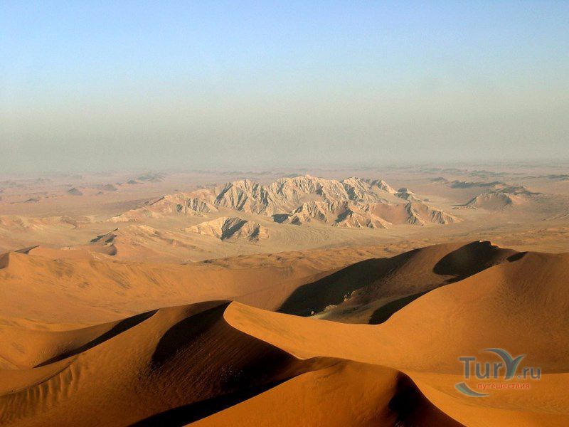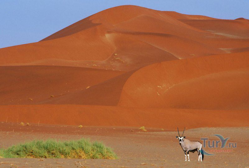 Пустыня Намиб представляет собой национальный парк, который расположен в юго-западной части Африки и занимает площадь более 100 тысяч кв.км. Название пустыни происходит из языка коренной народности нама и означает "место, где ничего нет". Считается, что Пустыня Намиб является самой древней пустыней в мире, она существует на протяжении 80 миллионов лет и по ней ещё ходили динозавры. Пустыня очень сухая, практически необитаемая. В год выпадает лишь 10-13 мм осадков. Бывают годы, когда дождей не бывает совсем. Но, вследствие особенностей климата, утром выпадает обильная роса. Для некоторых видов растений и животных роса наиболее важный источник влаги, чем осадки. Исключение составляют только несколько прибрежных городов. В южной части пустыни, недалеко от побережья, на поверхности находится песок жёлто-серого цвета, а песок кирпично-красного цвета находится на внутренней территории пустыни. С северо-запада на юго-восток параллельно побережью тянется гряда песчаных дюн. Некоторые дюны имеют длину 10-20 км и высоту до 240 метров. Здесь расположена самая высокая дюна в мире, которая имеет высоту 383 метра. В недрах пустыни находятся залежи урановых и вольфрамовых руд, а также алмазов. Эти дюны вдохновляют фотографов и художников со всего мира. Самое лучшее время для посещения пустыни - на восходе солнца или на закате, когда цвета самые насыщенные. Пустыня Намиб привлекает морских птиц, тюленей, а также пингвинов, которые любят гнездиться на берегах пустыни и на прибрежных островах, несмотря на африканскую жару. Впадины и дюны внутренней части Намиб являются убежищем для антилоп, зебр, страусов. В северной части пустыни, особенно в долинах рек, которые текут с внутреннего плато в Атлантический океан, встречаются слоны, львы, носороги, гиены, шакалы. Здесь много пресмыкающихся, пауков, комаров, муравьёв, жуков. Прибрежная зона с островами заселена большим количеством морских птиц - фламинго, бакланами, пеликанами и другими видами. Пустыня Намиб поражает разнообразием своих ландшафтов. Эти многочисленные каньоны сухих рек, выветренные скалы, обширные щербистые пустоши и непрерывно перемещающиеся огромные дюны перемежаются крохотными оазисами. Пустыня Намиб является заповедной и рекреационной зоной.
